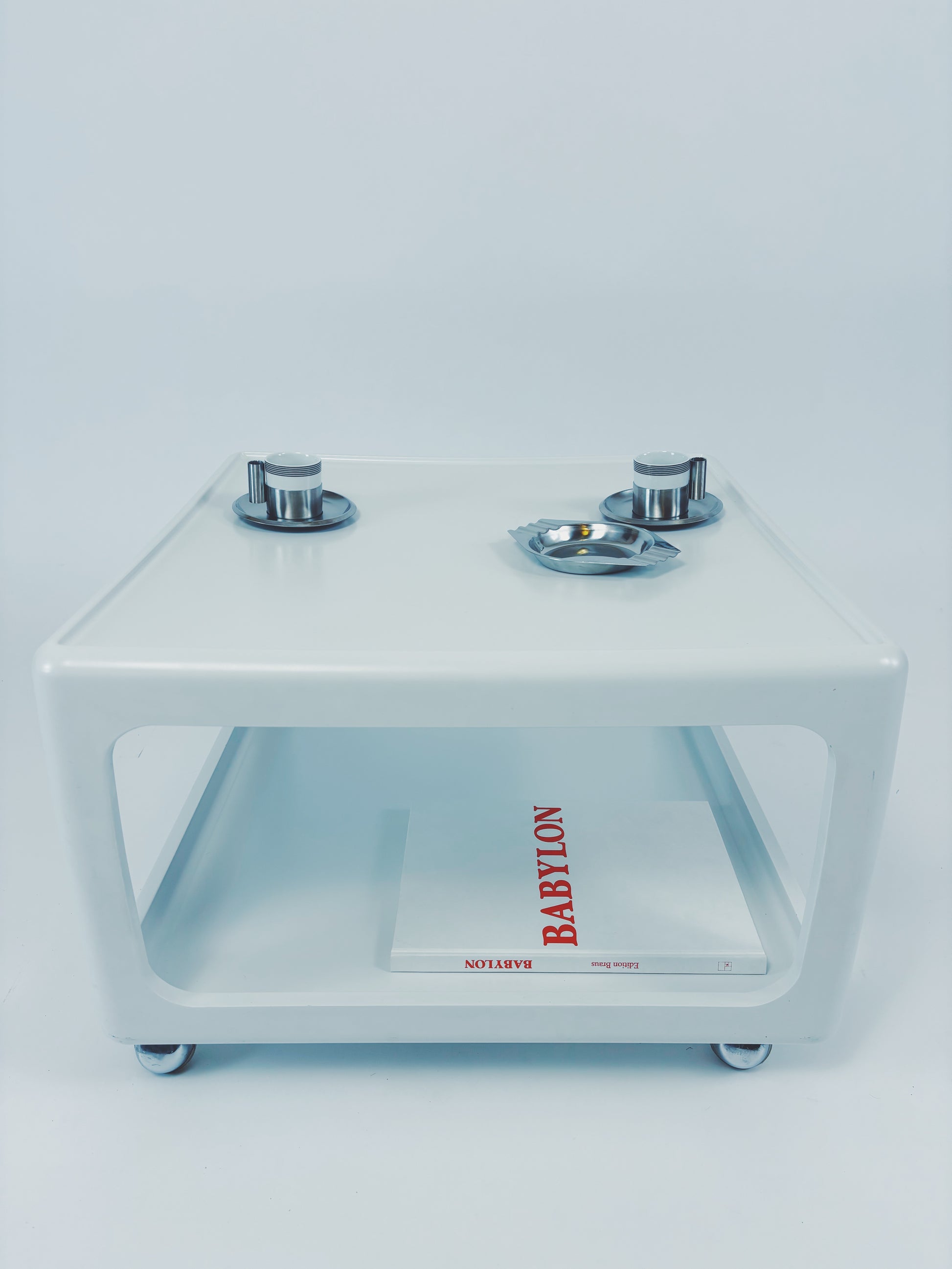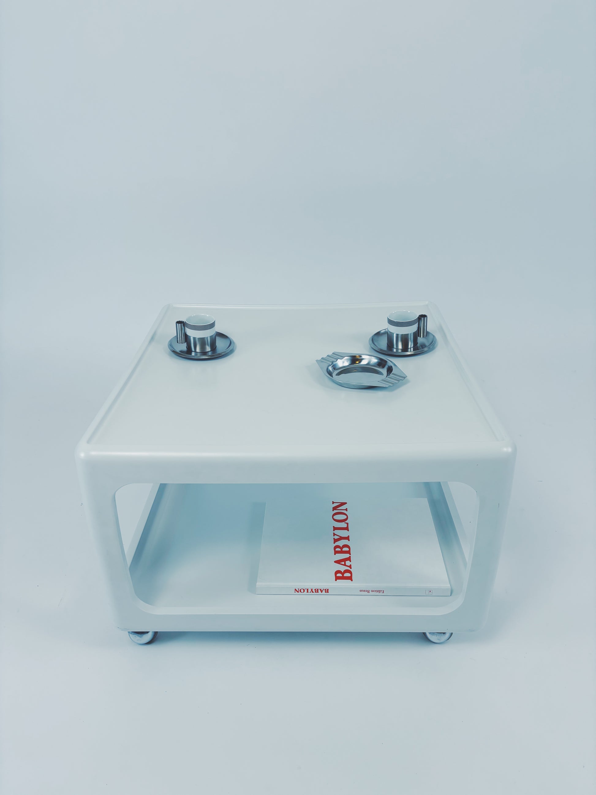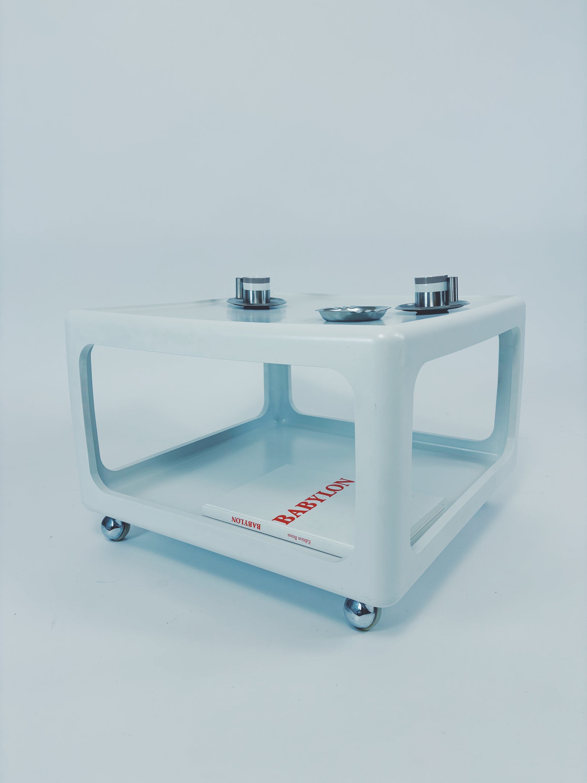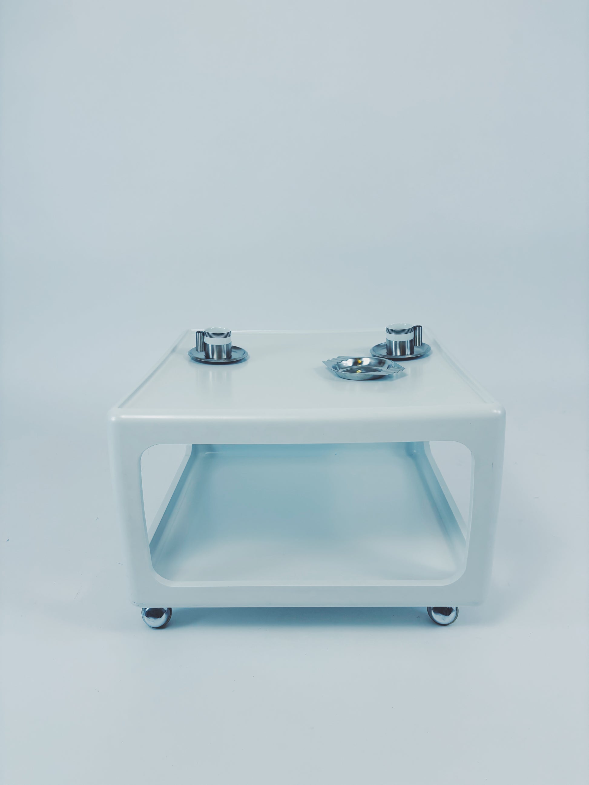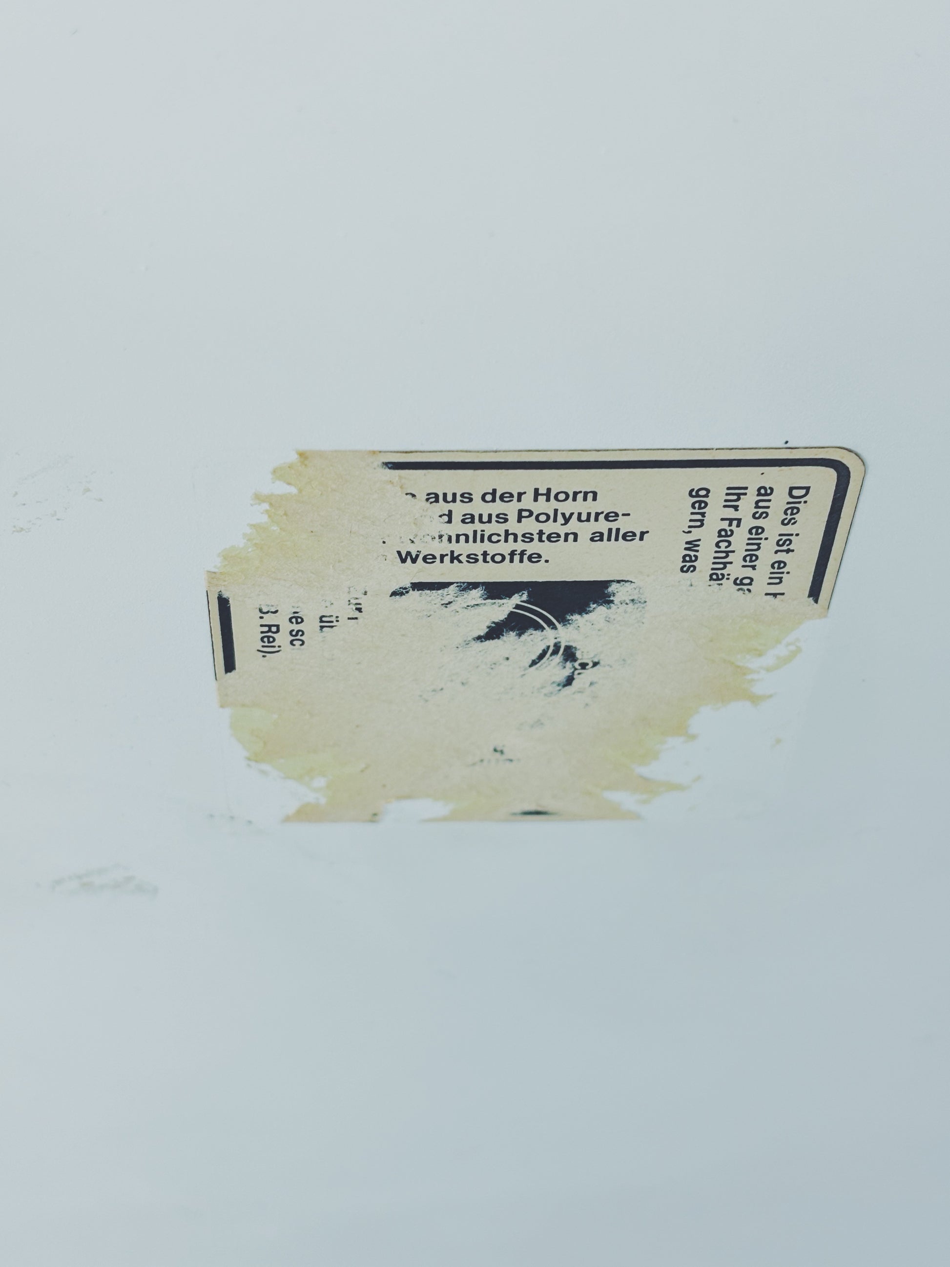 Sehr gut erhaltener Horn Collection Coffeetable des deutschen Designers Peter Ghyczy mit Markenstempel. Der Tisch aus Polyurethan weist dem Alter entsprechende Gebrauchsspuren auf. Kleinere Kratzer vorhanden. Die Chromrollen sind leichtgängig.