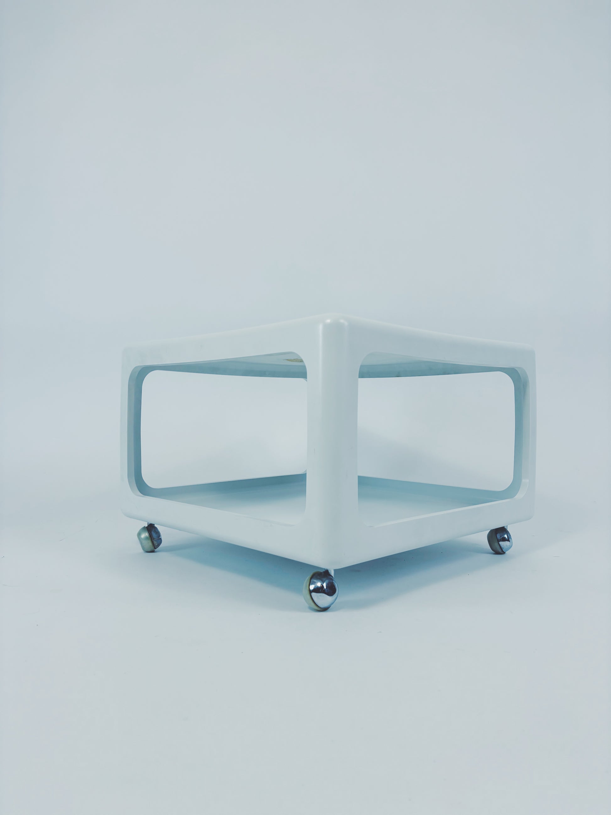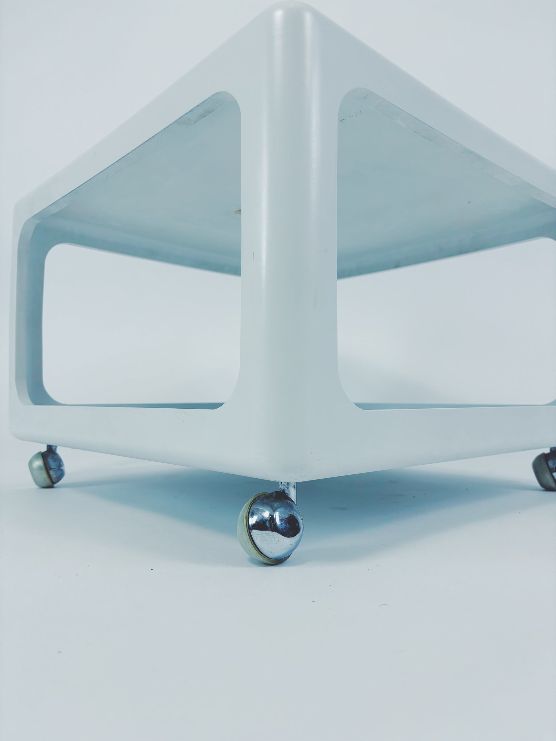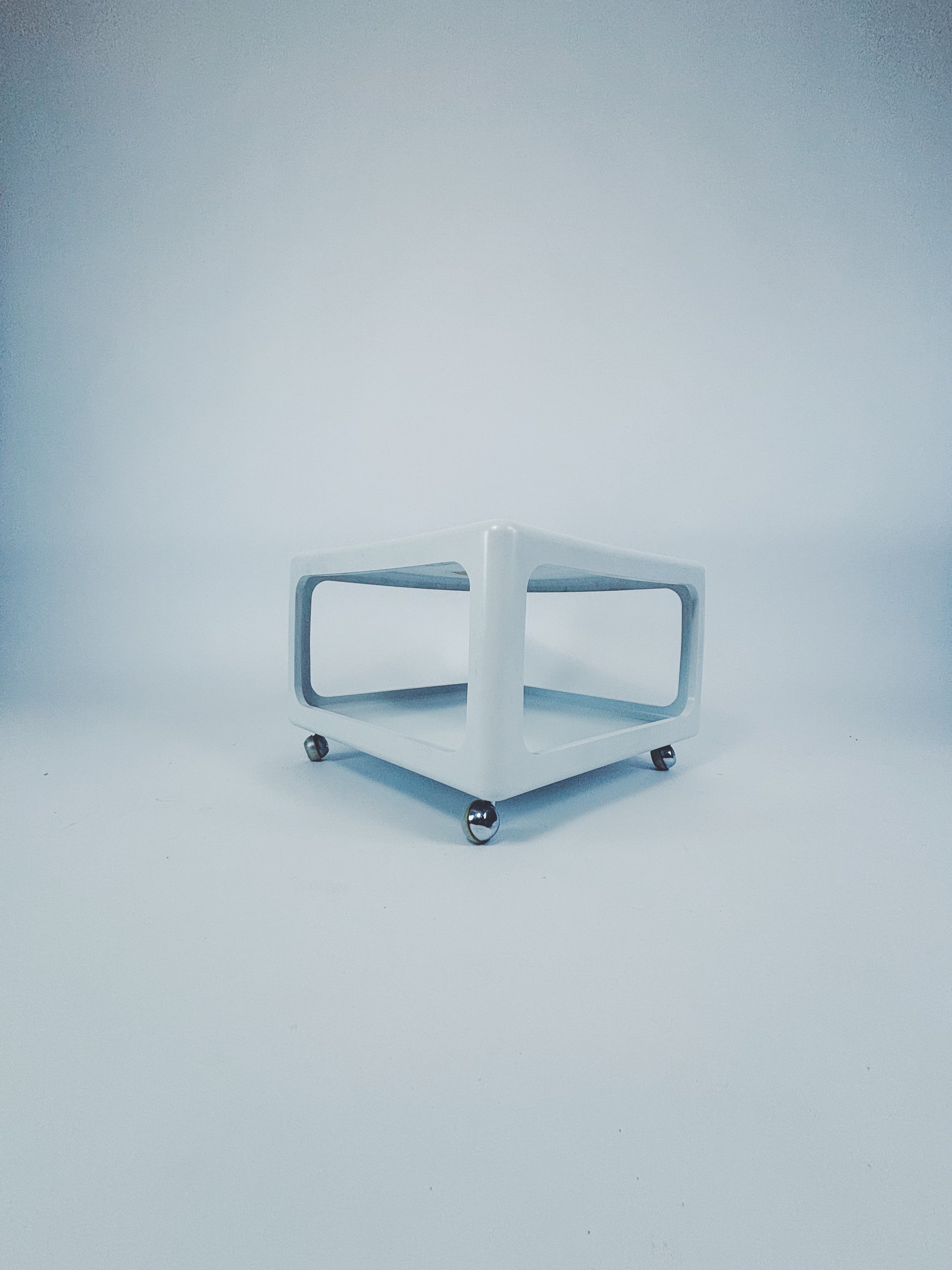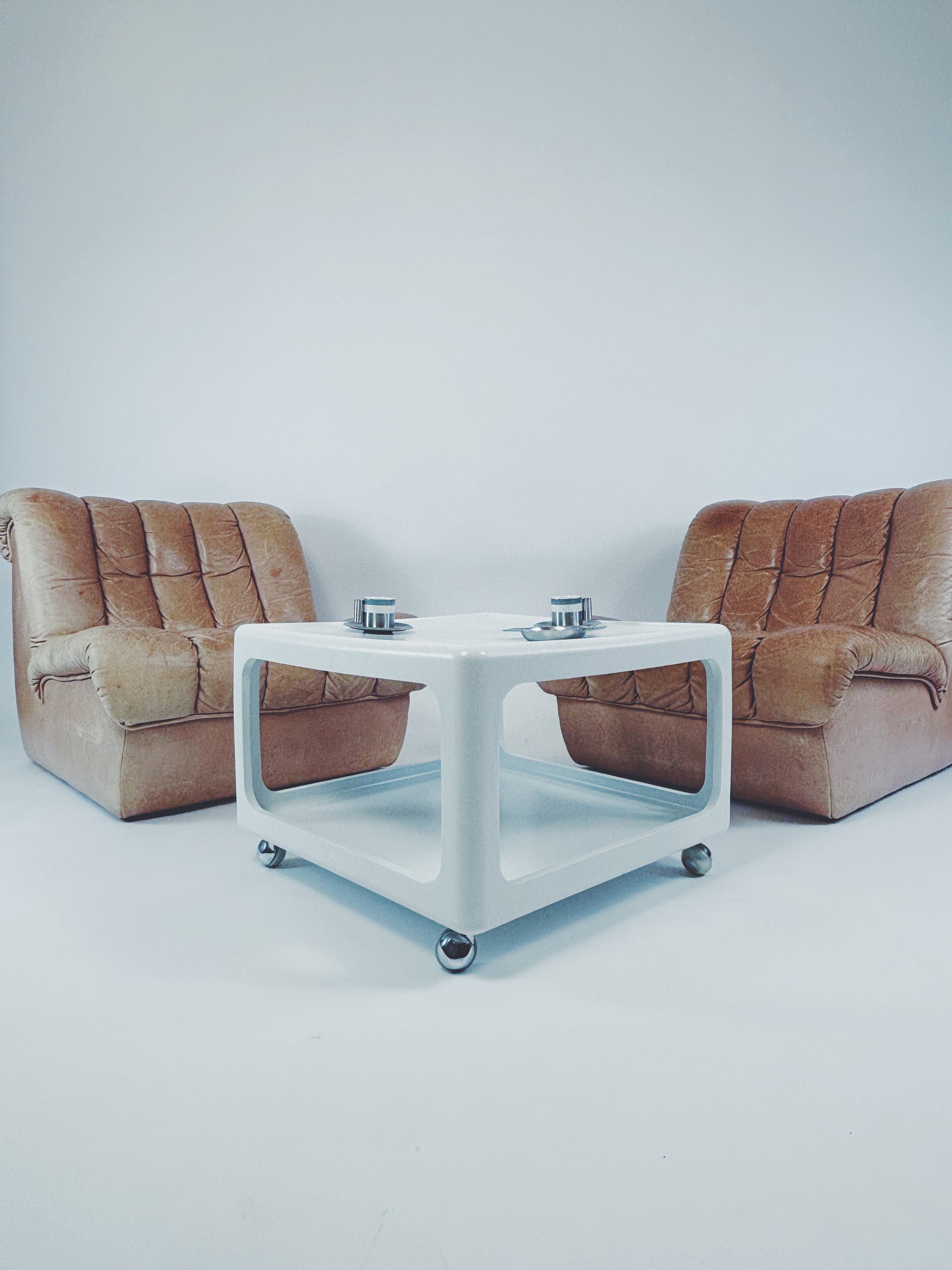 Sehr gut erhaltener Horn Collection Coffeetable des deutschen Designers Peter Ghyczy mit Markenstempel. Der Tisch aus Polyurethan weist dem Alter entsprechende Gebrauchsspuren auf. Kleinere Kratzer vorhanden. Die Chromrollen sind leichtgängig.