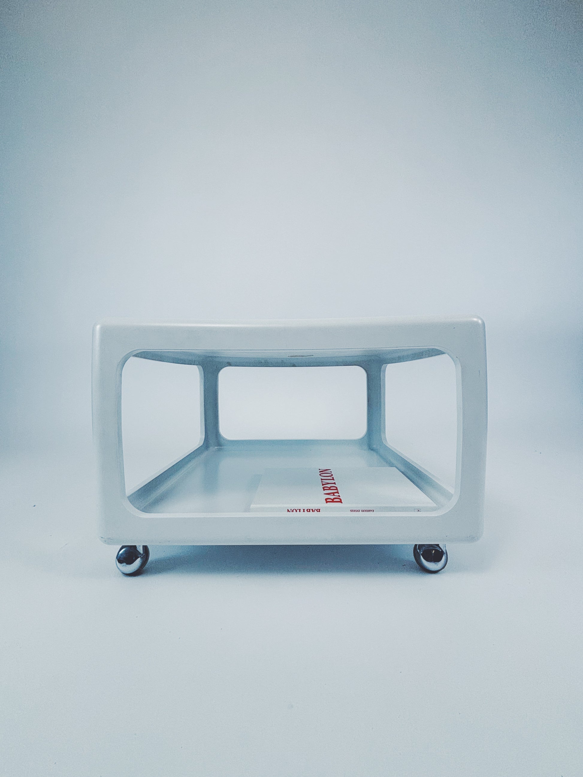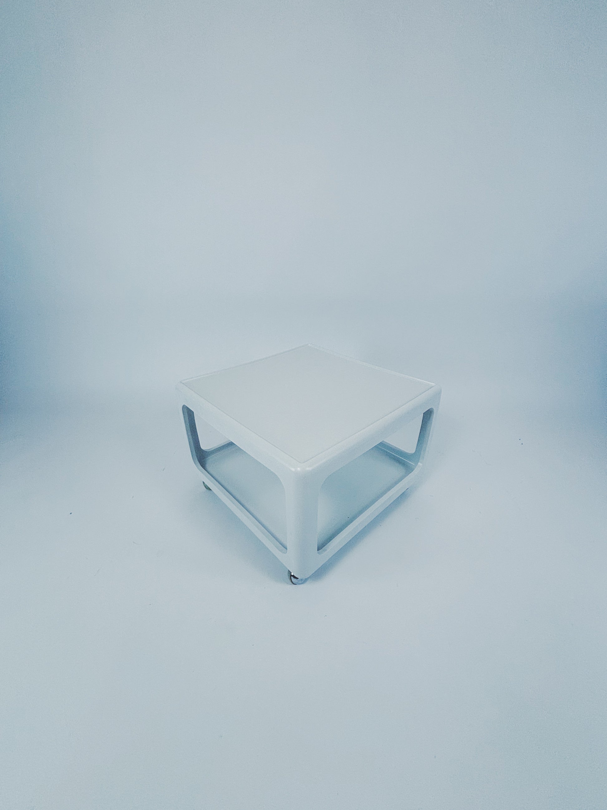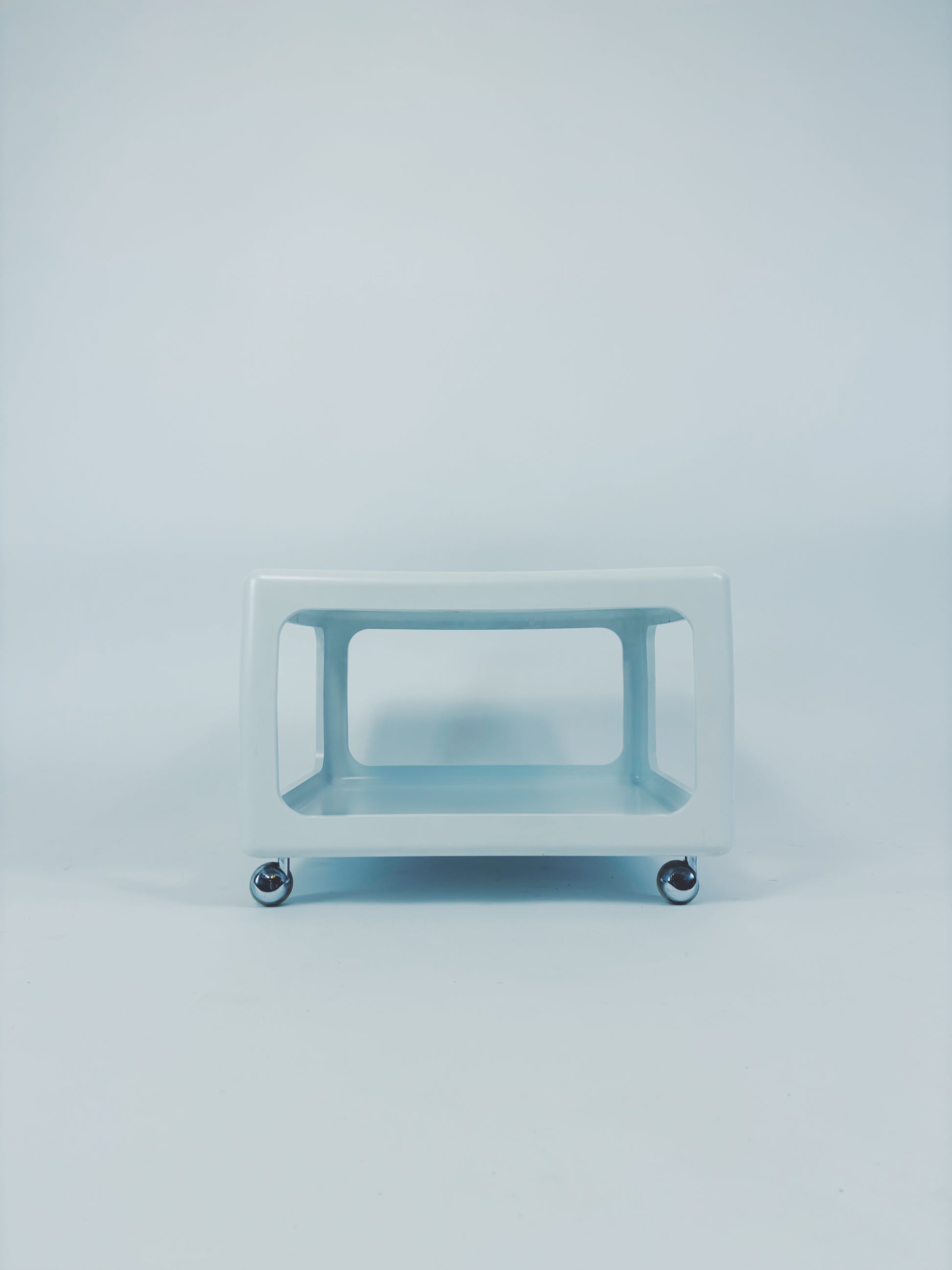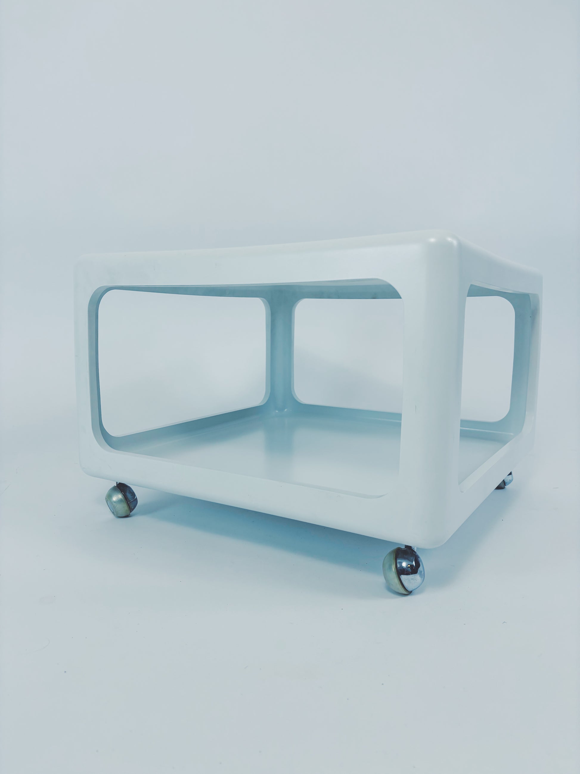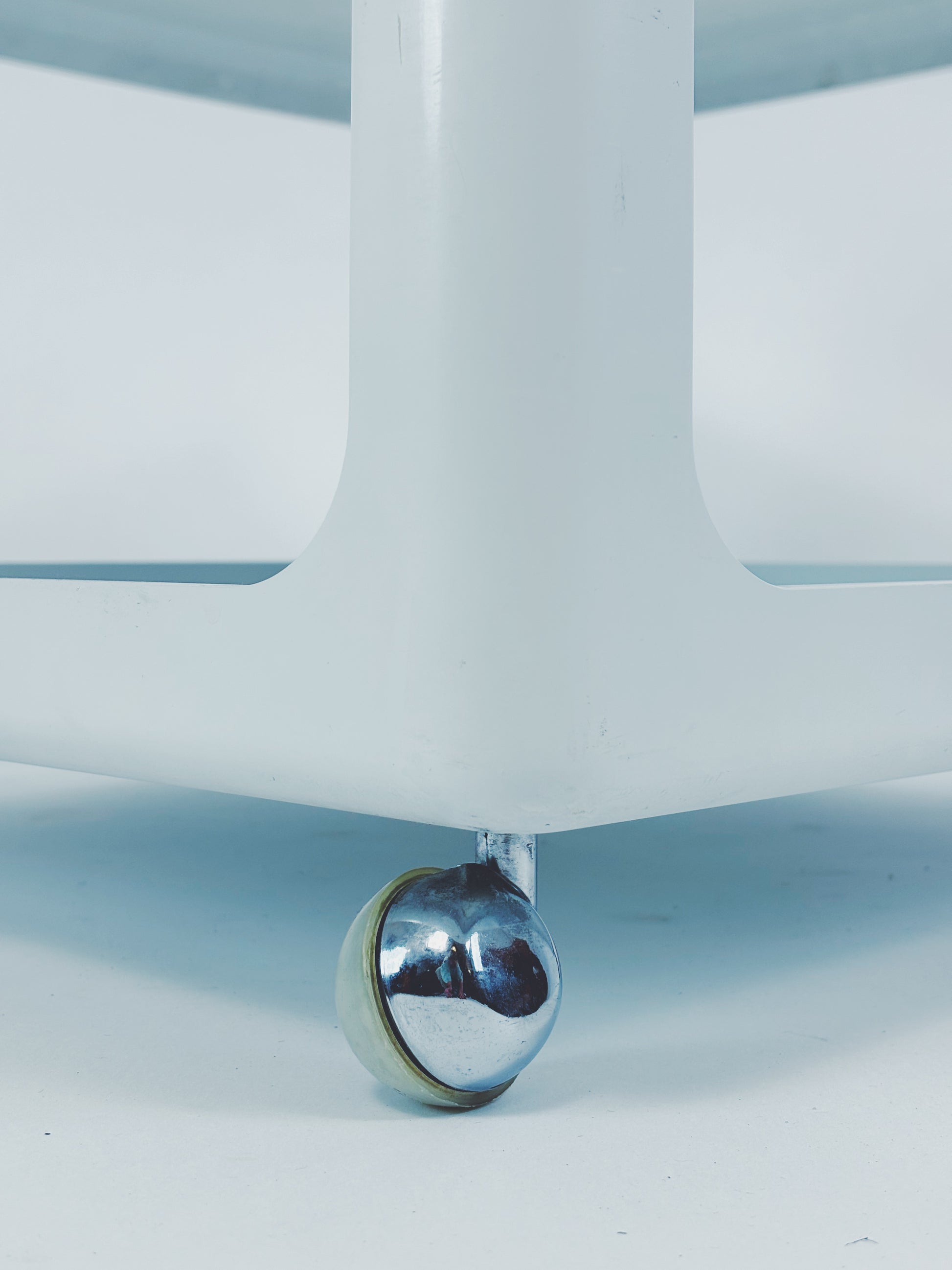 Sehr gut erhaltener Horn Collection Coffeetable des deutschen Designers Peter Ghyczy mit Markenstempel. Der Tisch aus Polyurethan weist dem Alter entsprechende Gebrauchsspuren auf. Kleinere Kratzer vorhanden. Die Chromrollen sind leichtgängig.