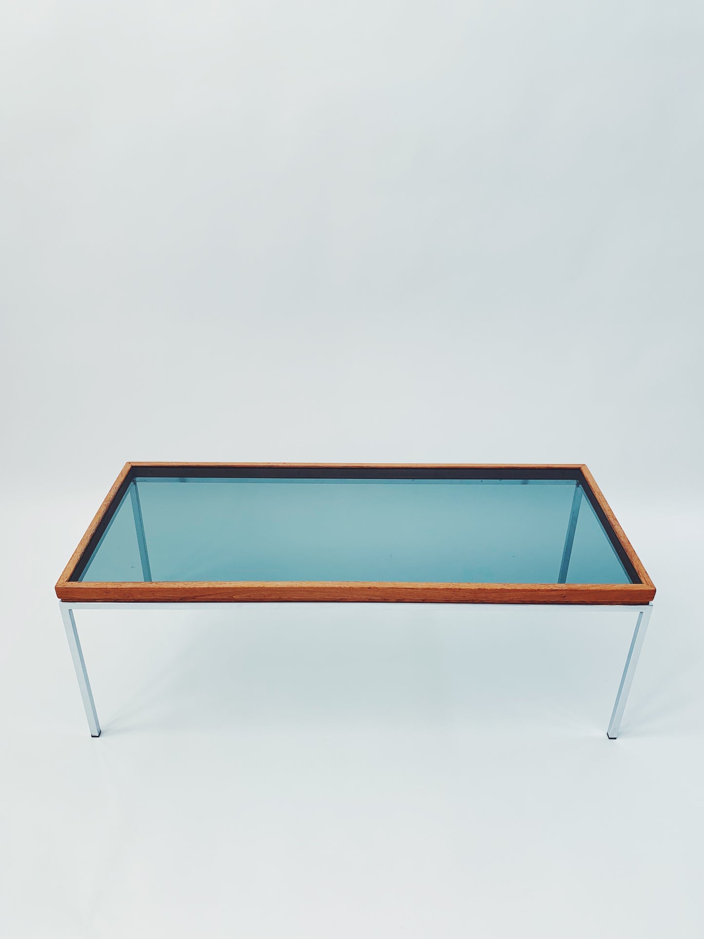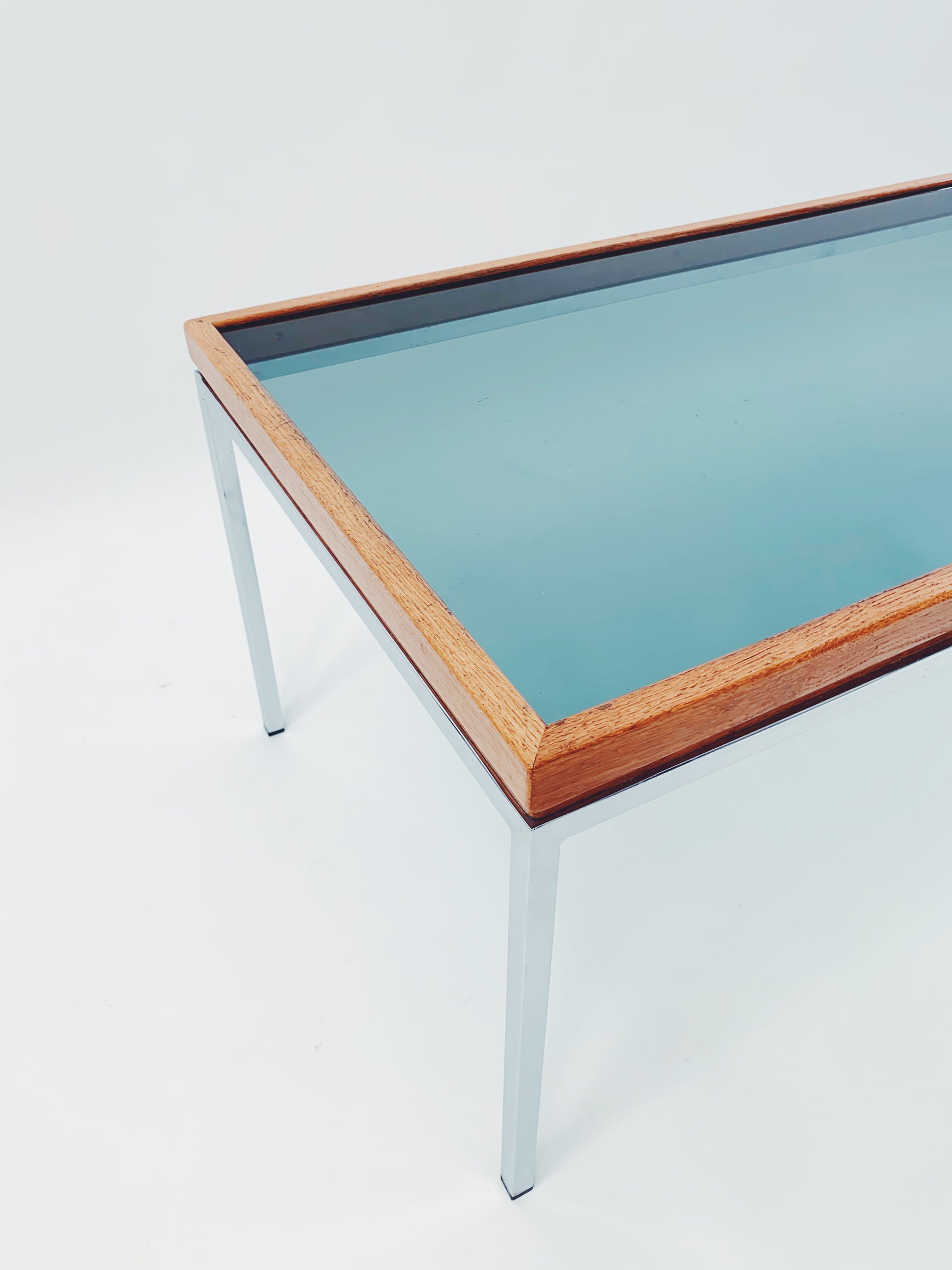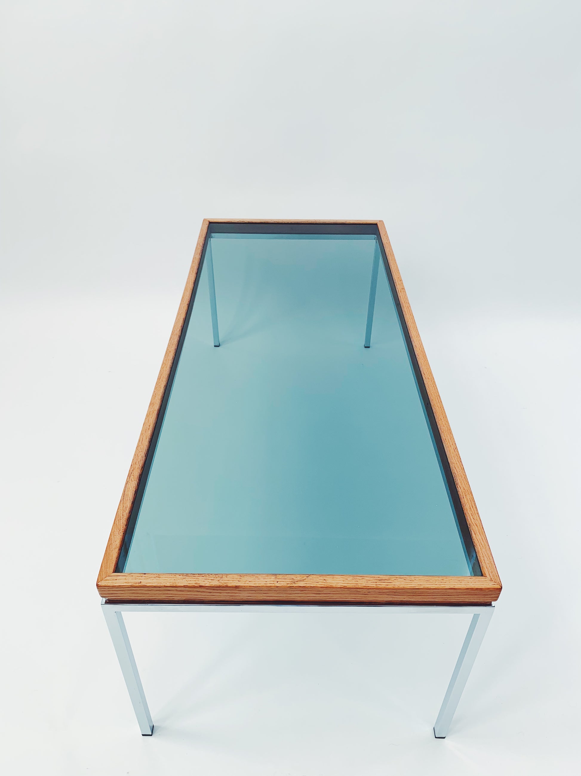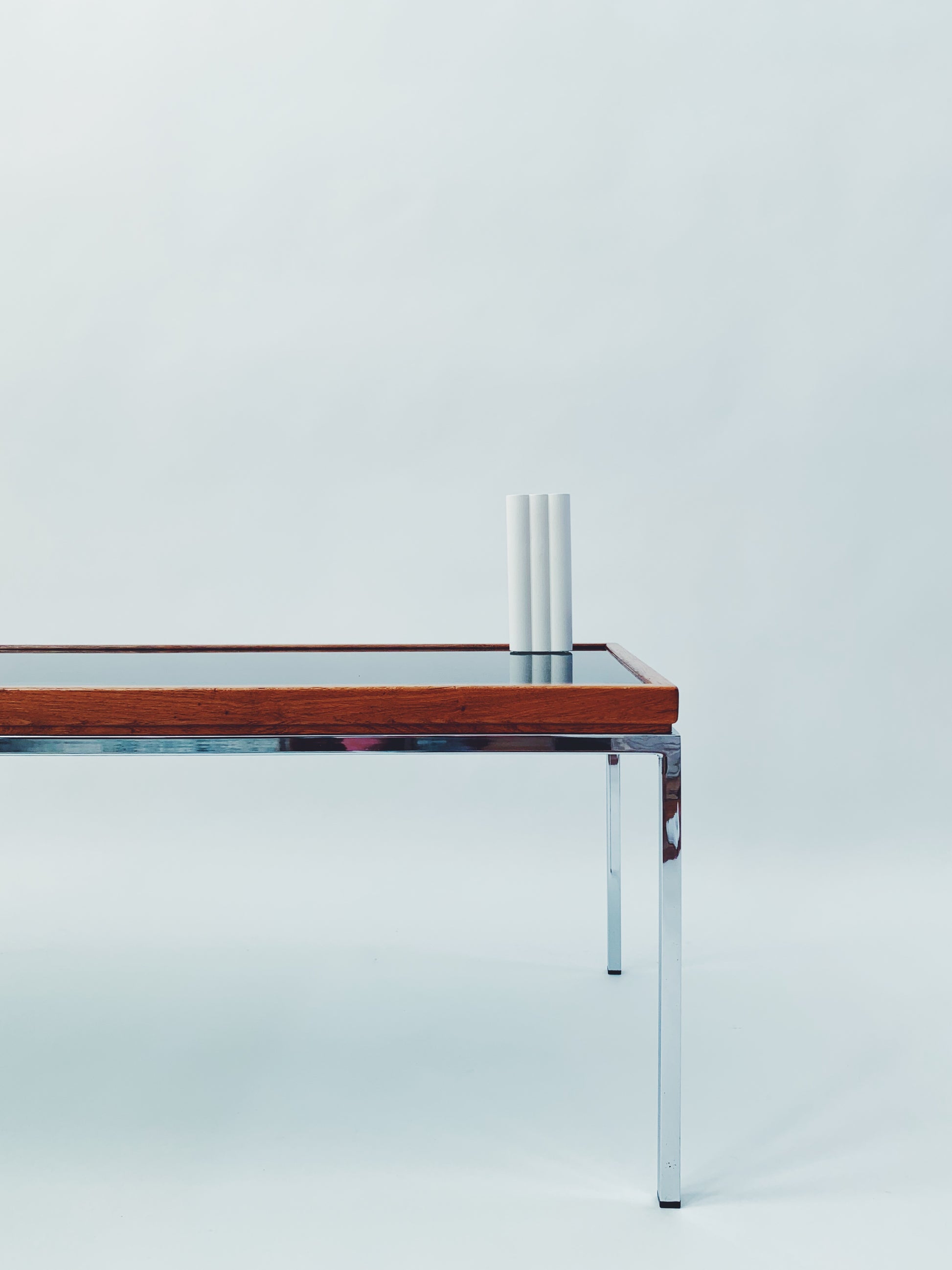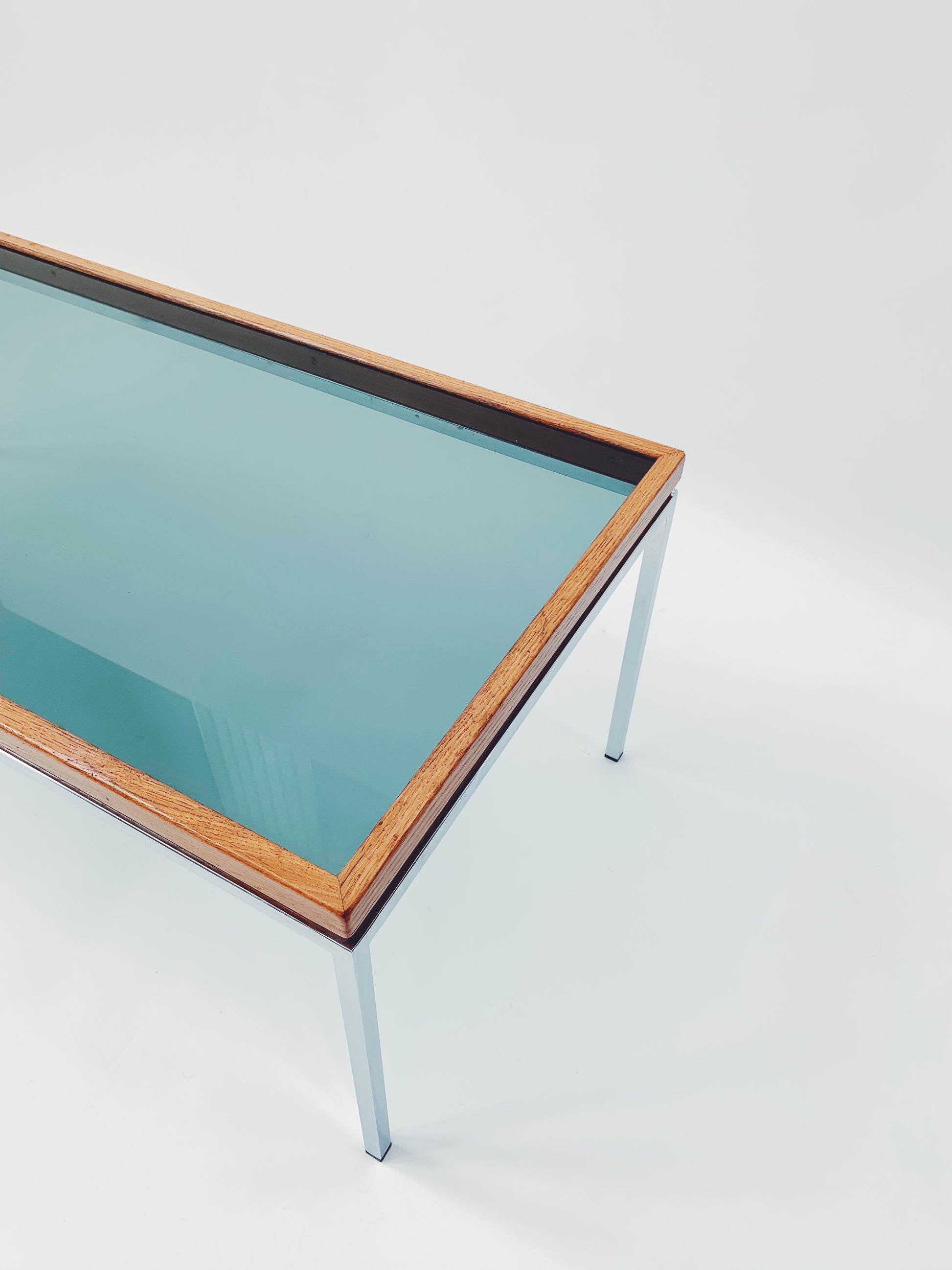 Stilvoller Couchtisch aus Rauchglas und Eichenholz auf verchromten Stahlbeinen. Gefertigt in den 70ern vom österreichischen Hersteller Wiesner-Hager.