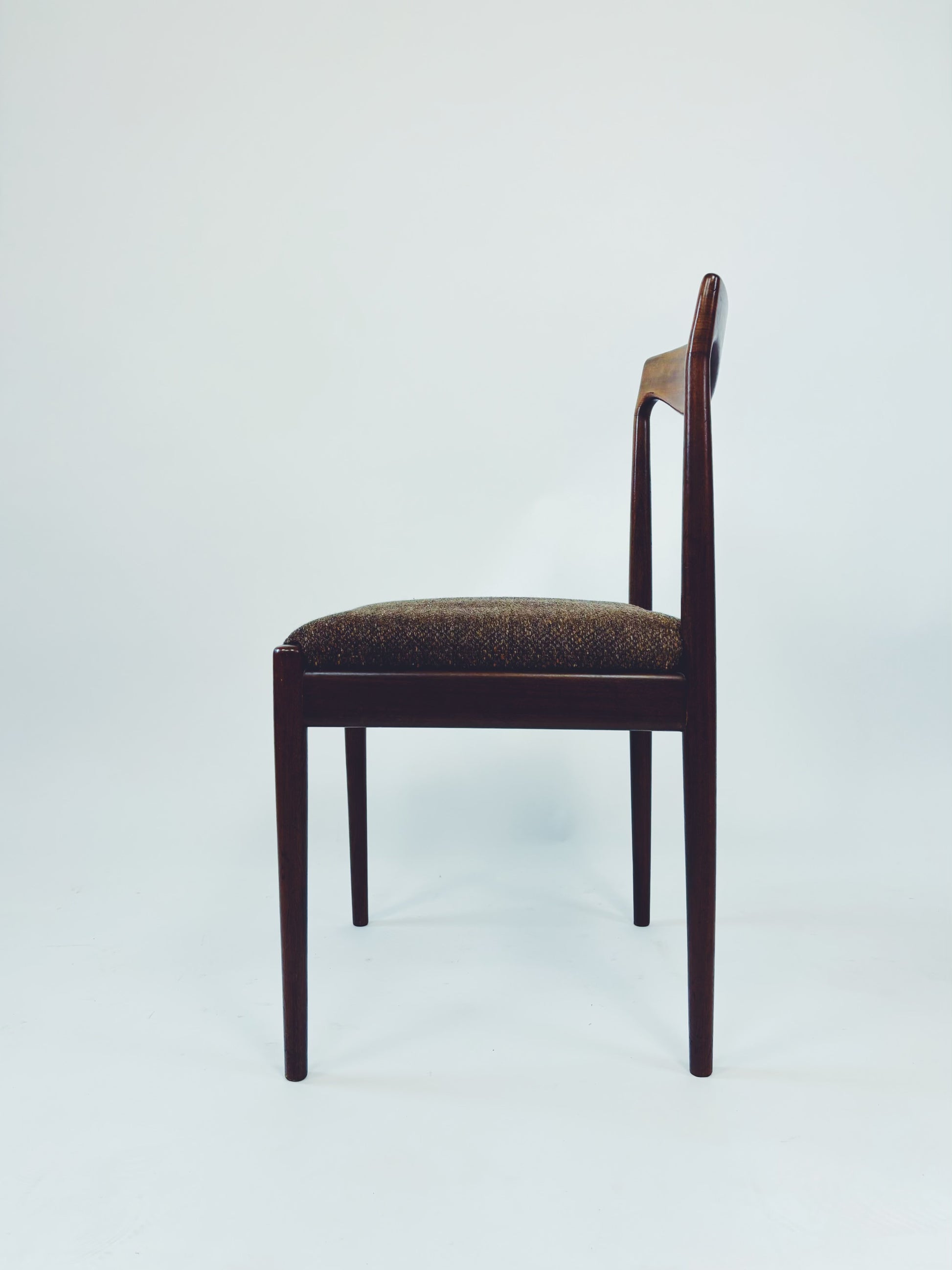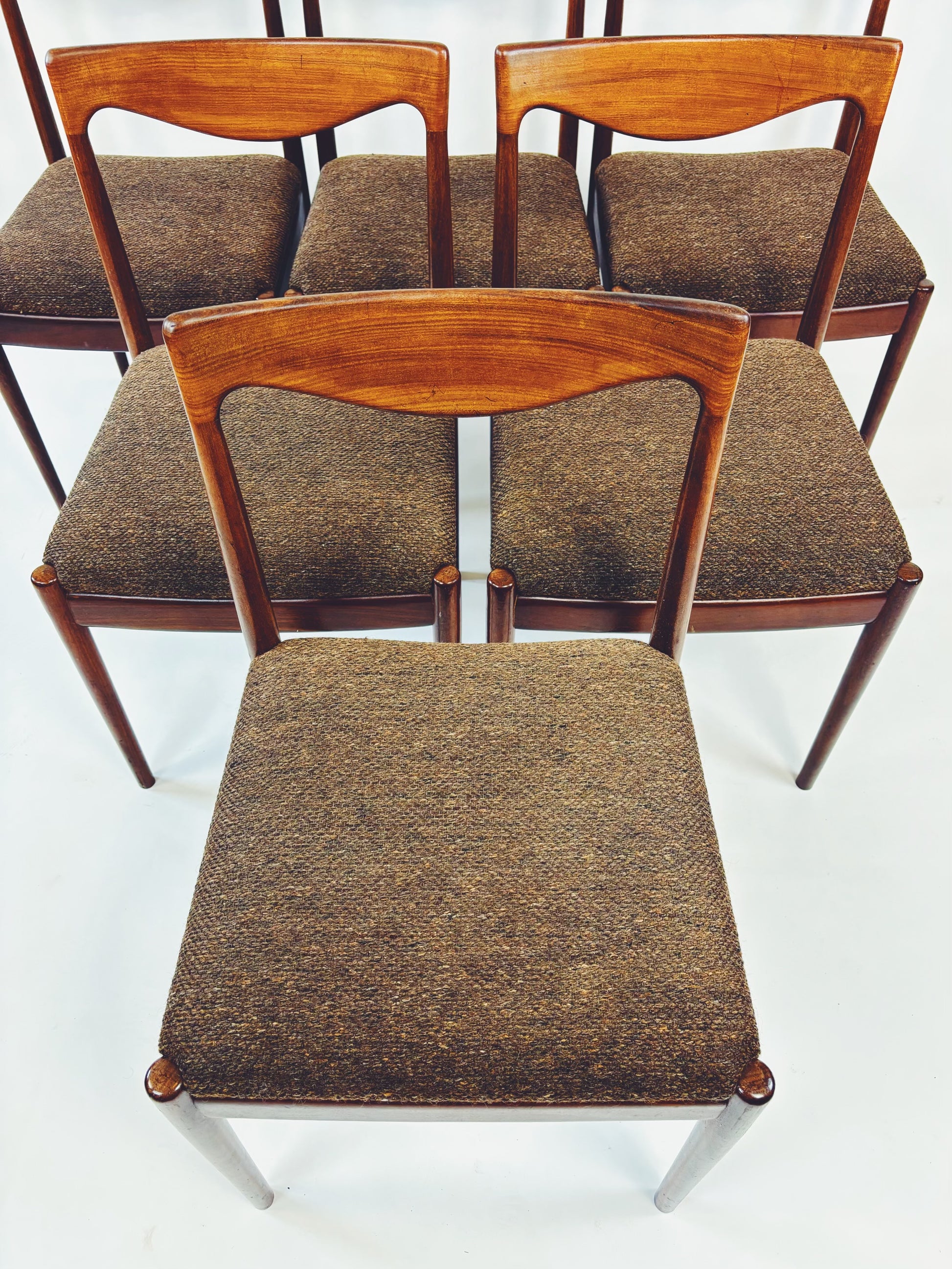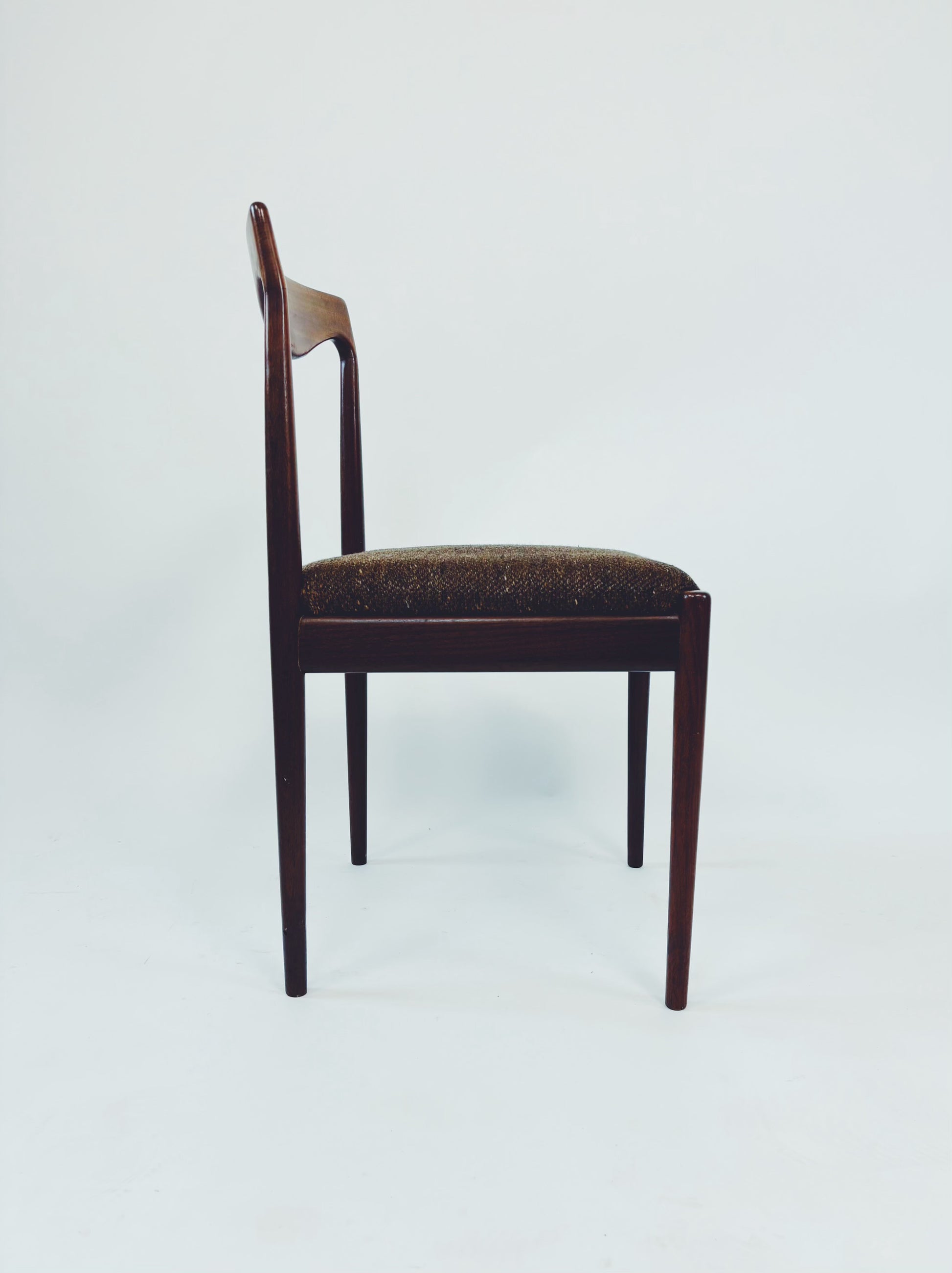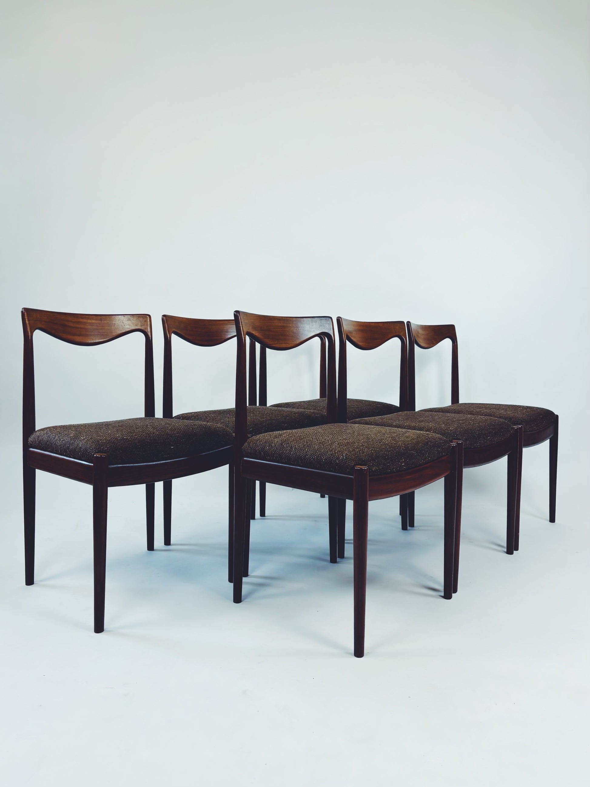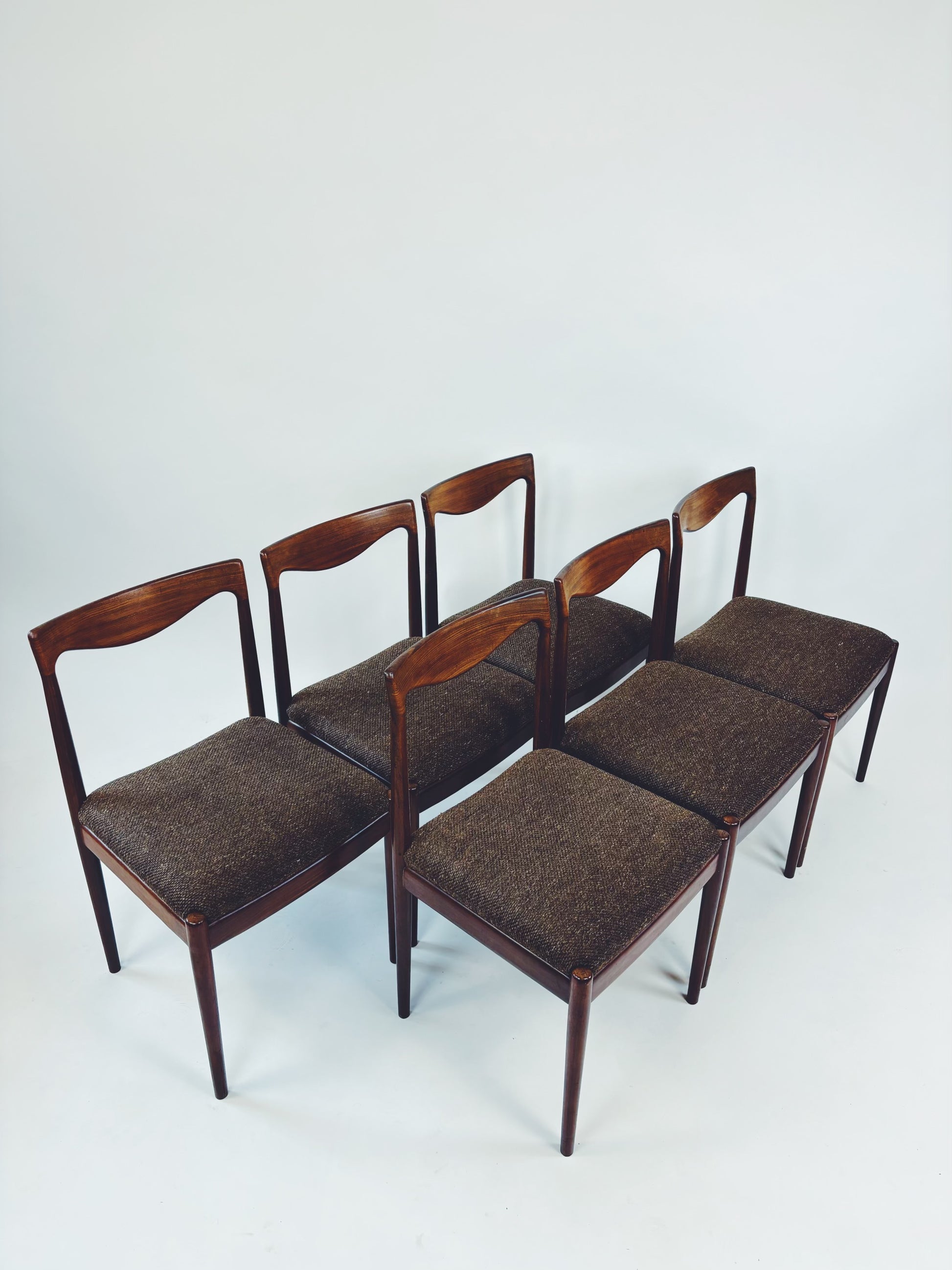 6 dänische Esszimmerstühle aus massivem Palisanderholz mit braunem Webstoff. Die schöne Maserung des Holzes kommt besonders gut auf der Rückenlehne zur Geltung.