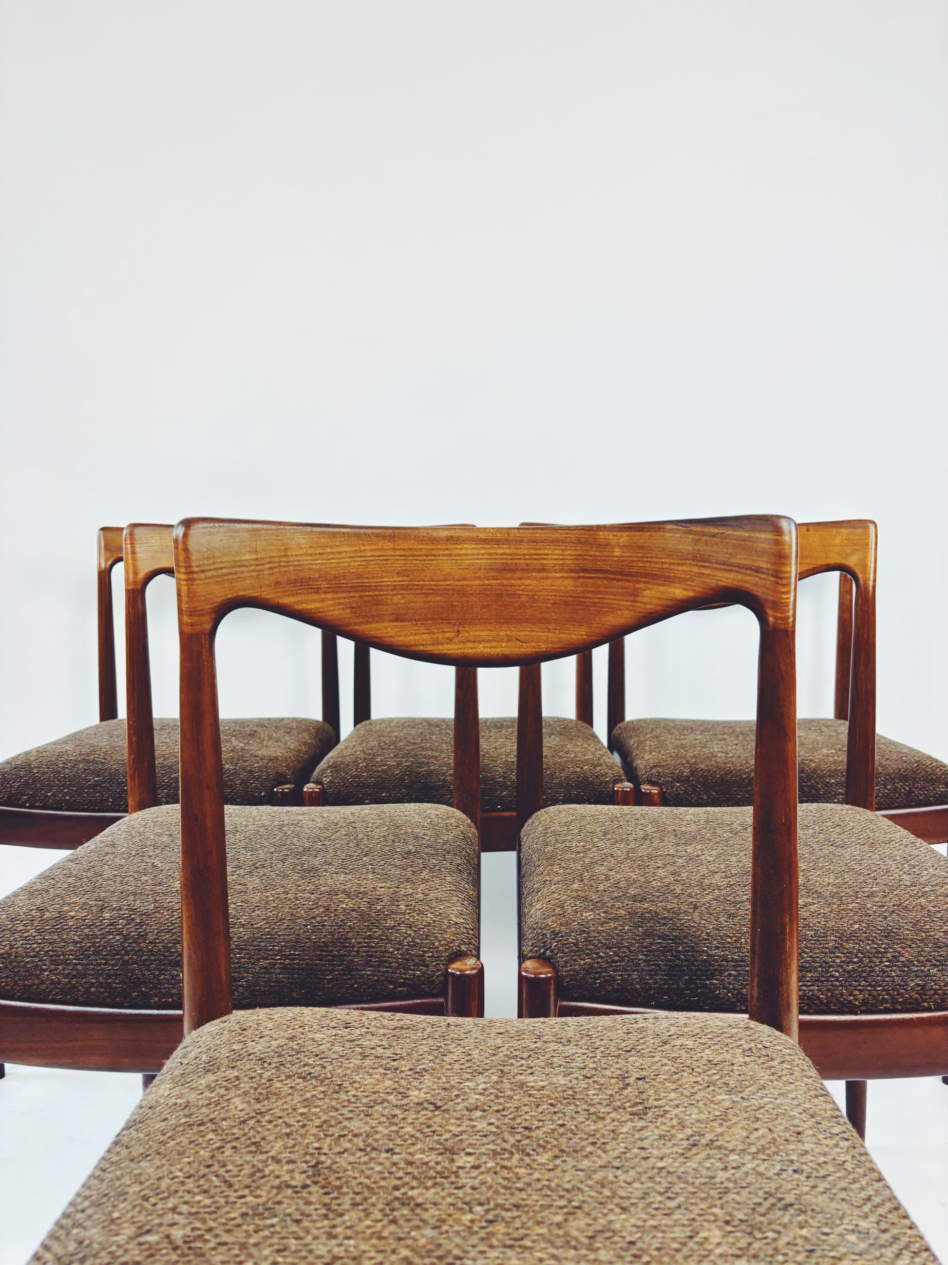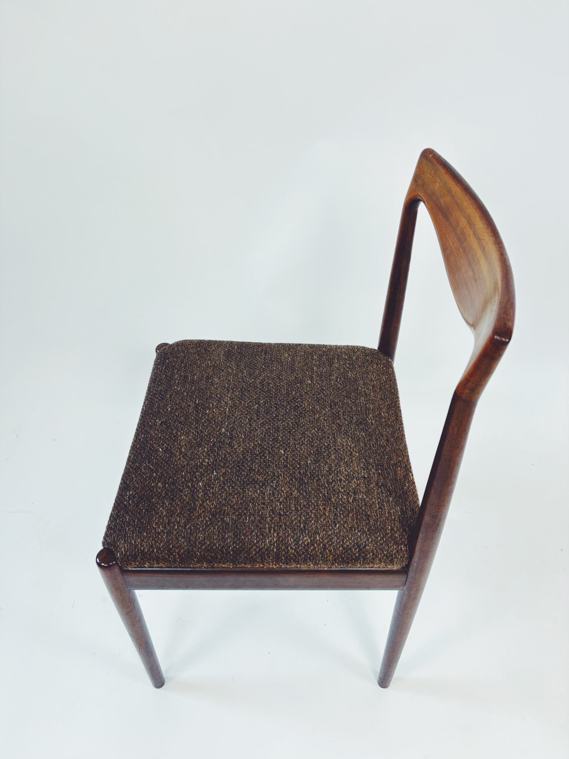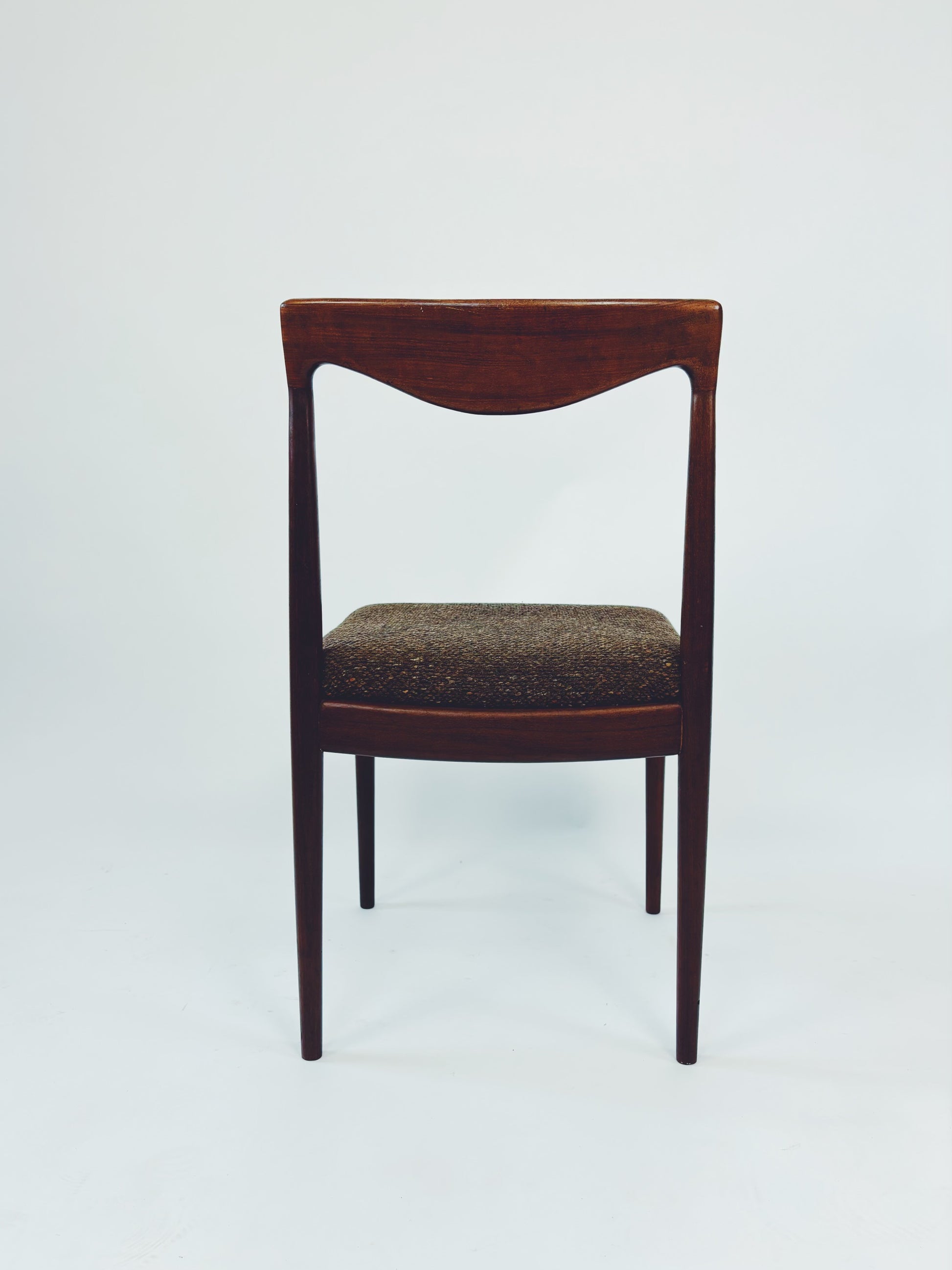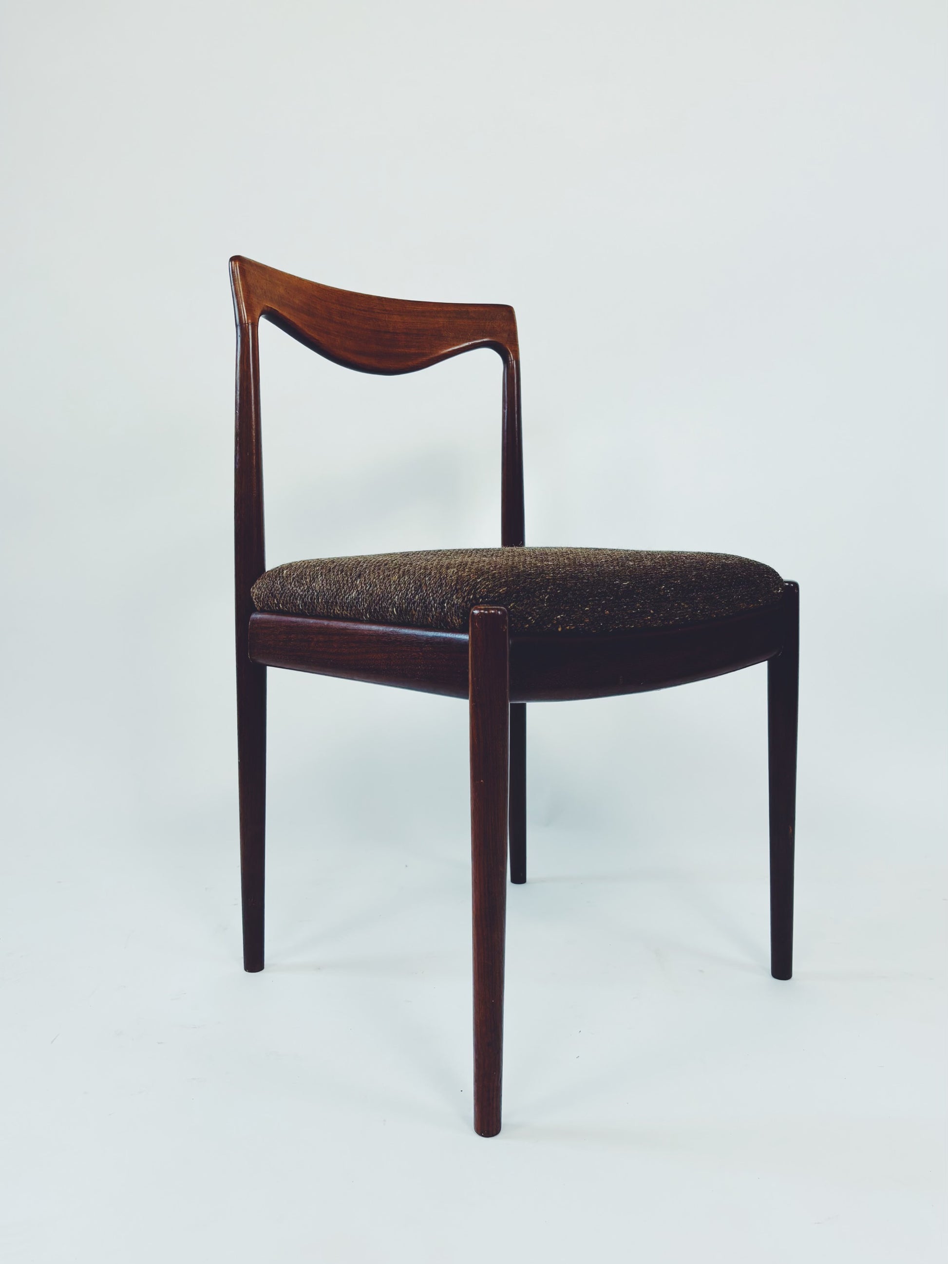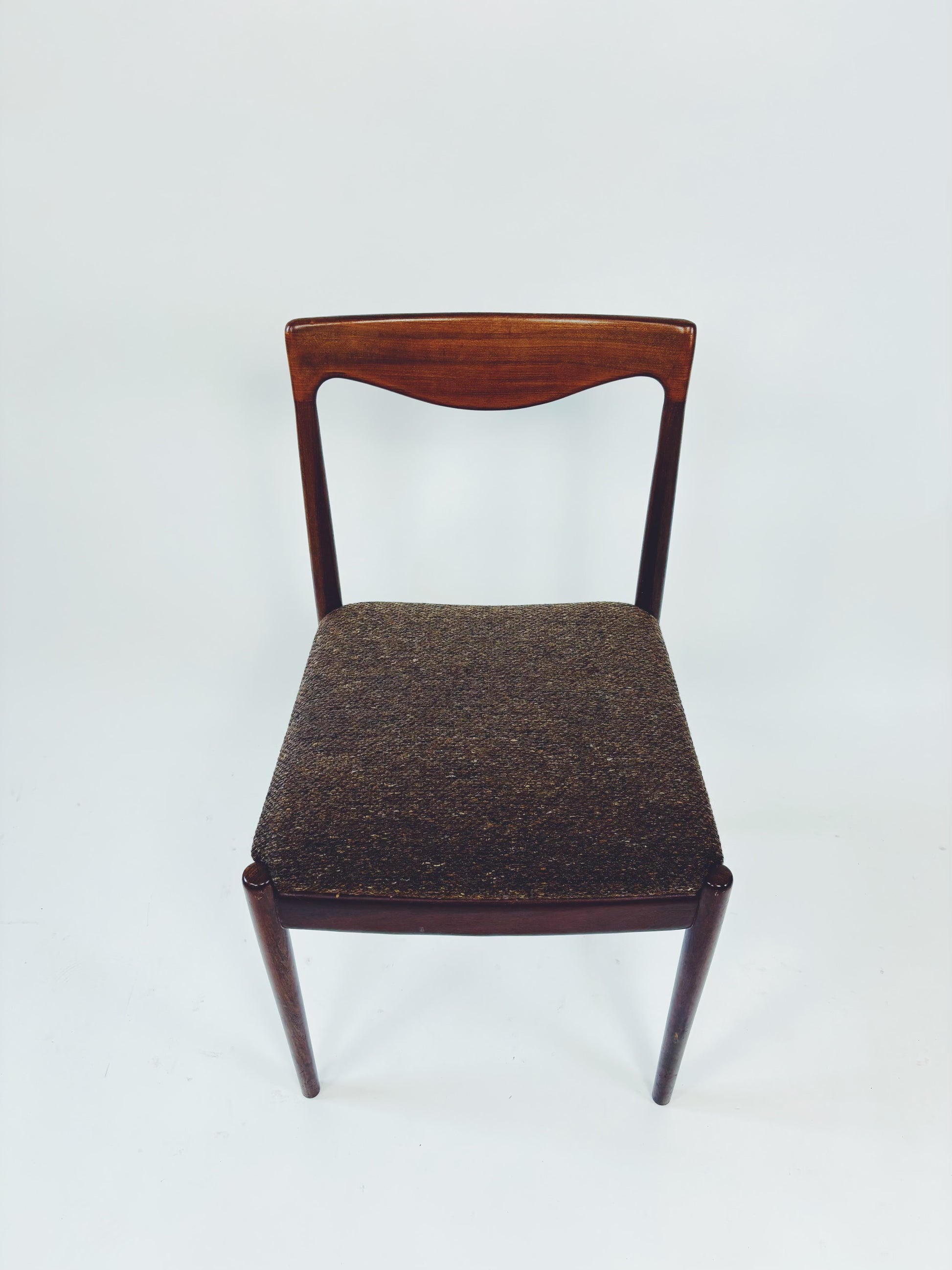 6 dänische Esszimmerstühle aus massivem Palisanderholz mit braunem Webstoff. Die schöne Maserung des Holzes kommt besonders gut auf der Rückenlehne zur Geltung.