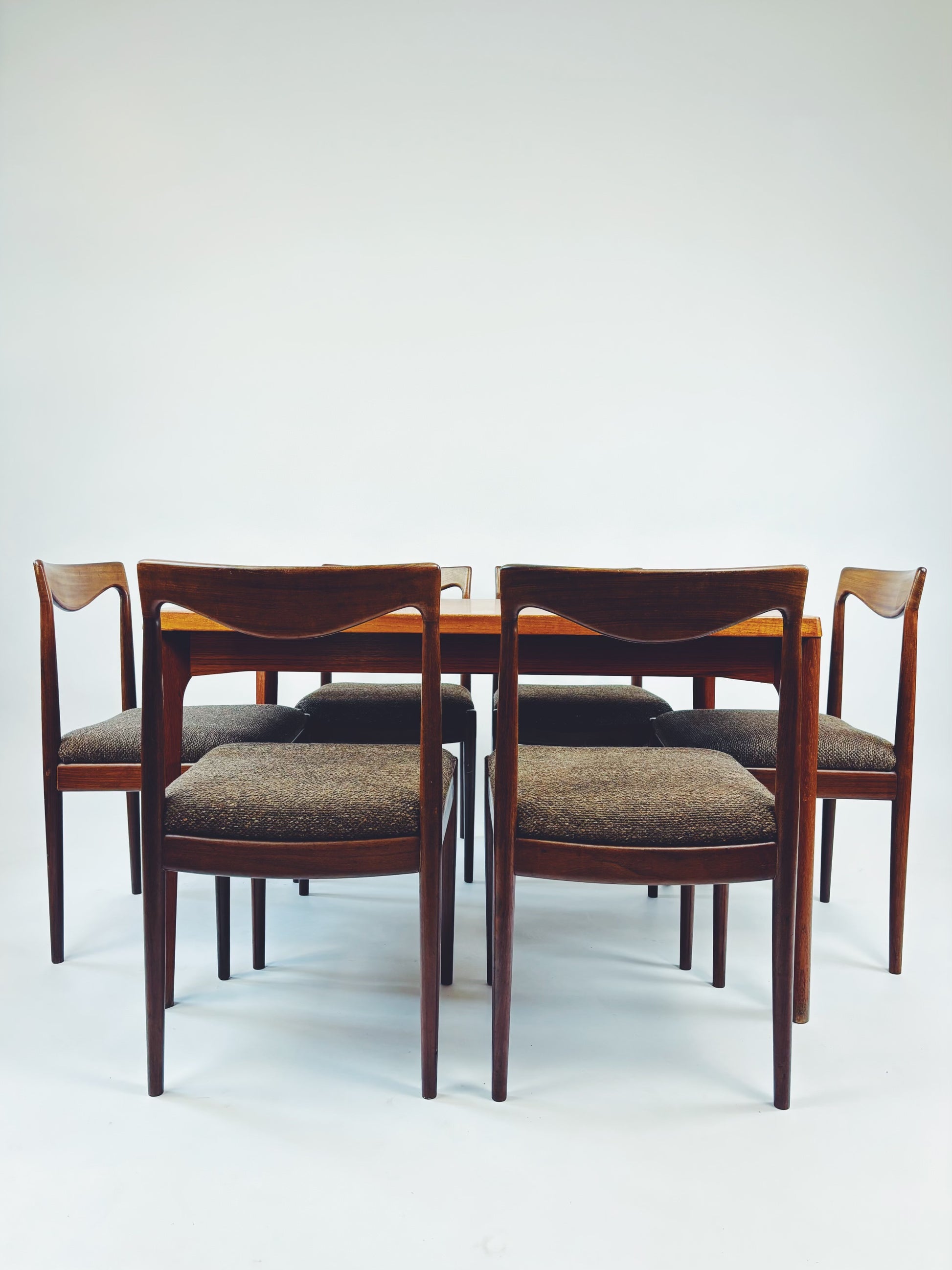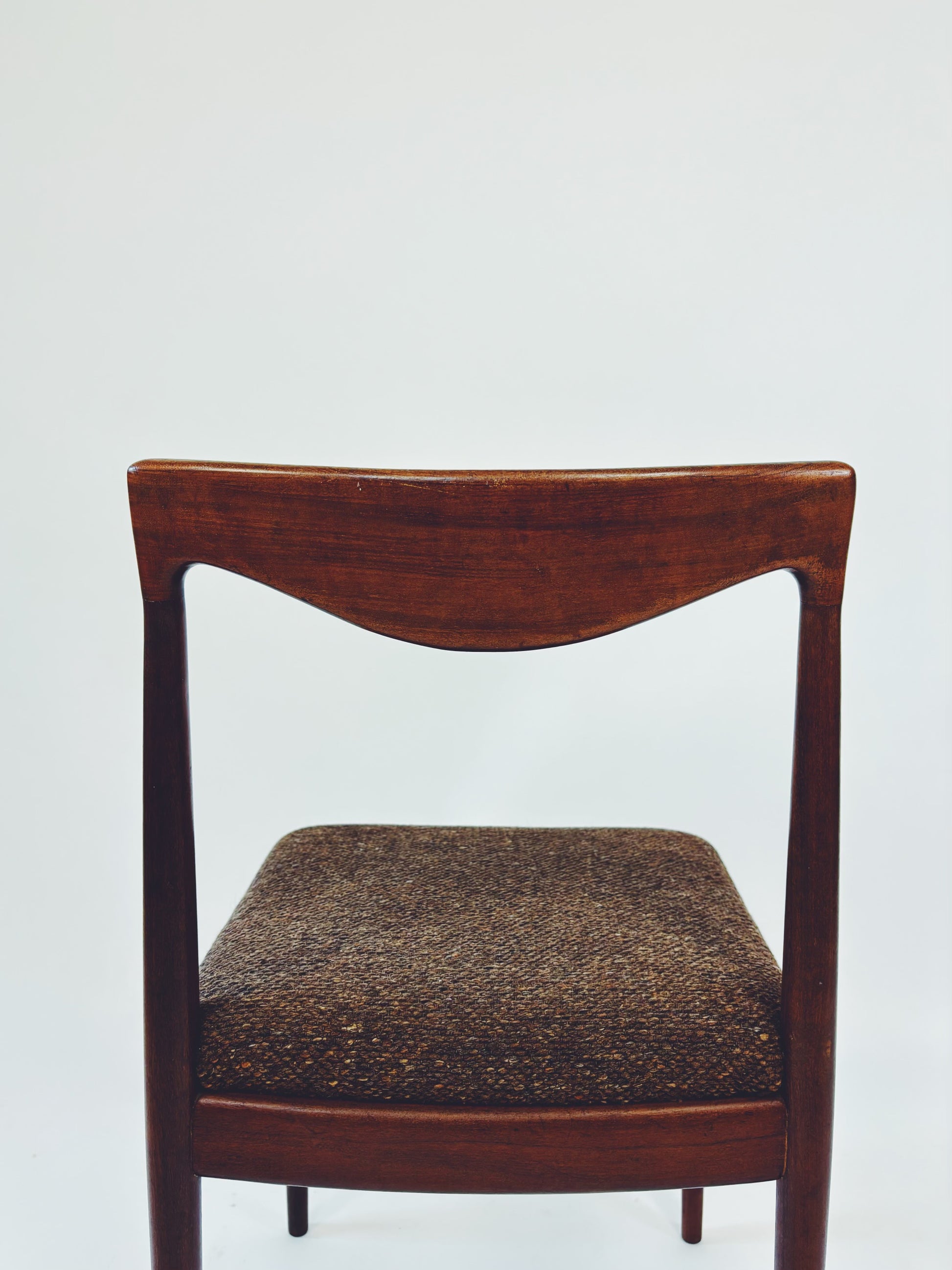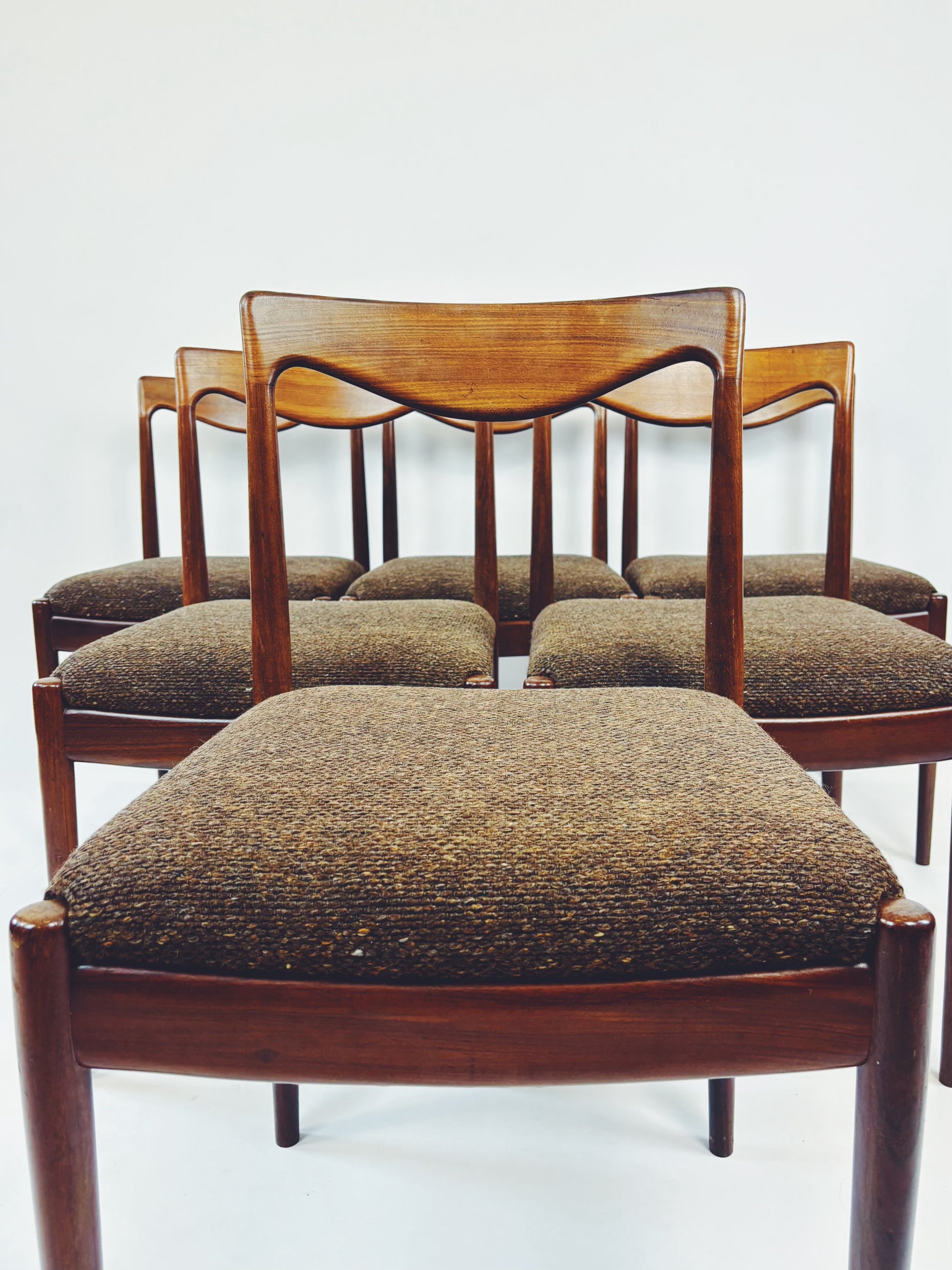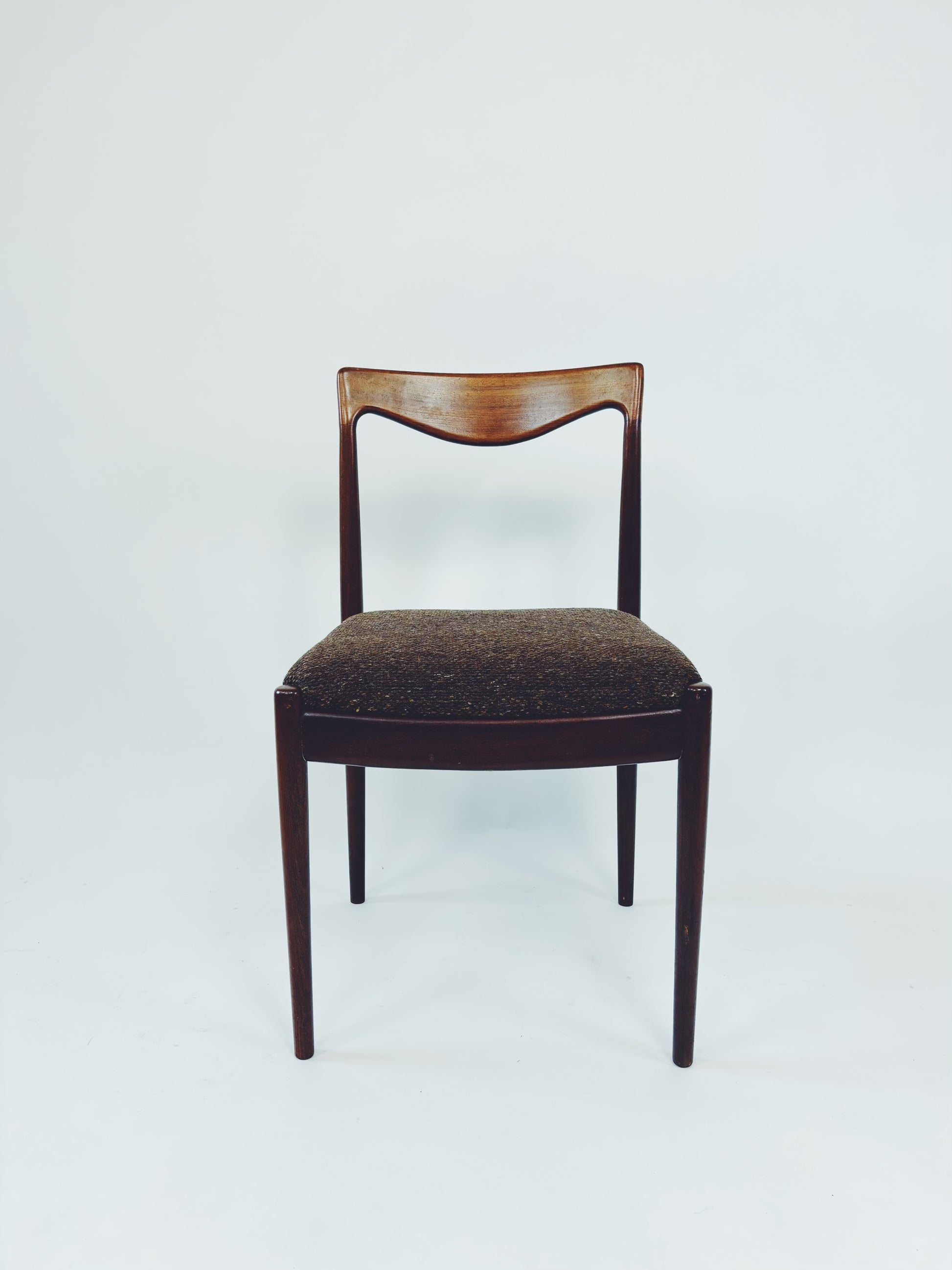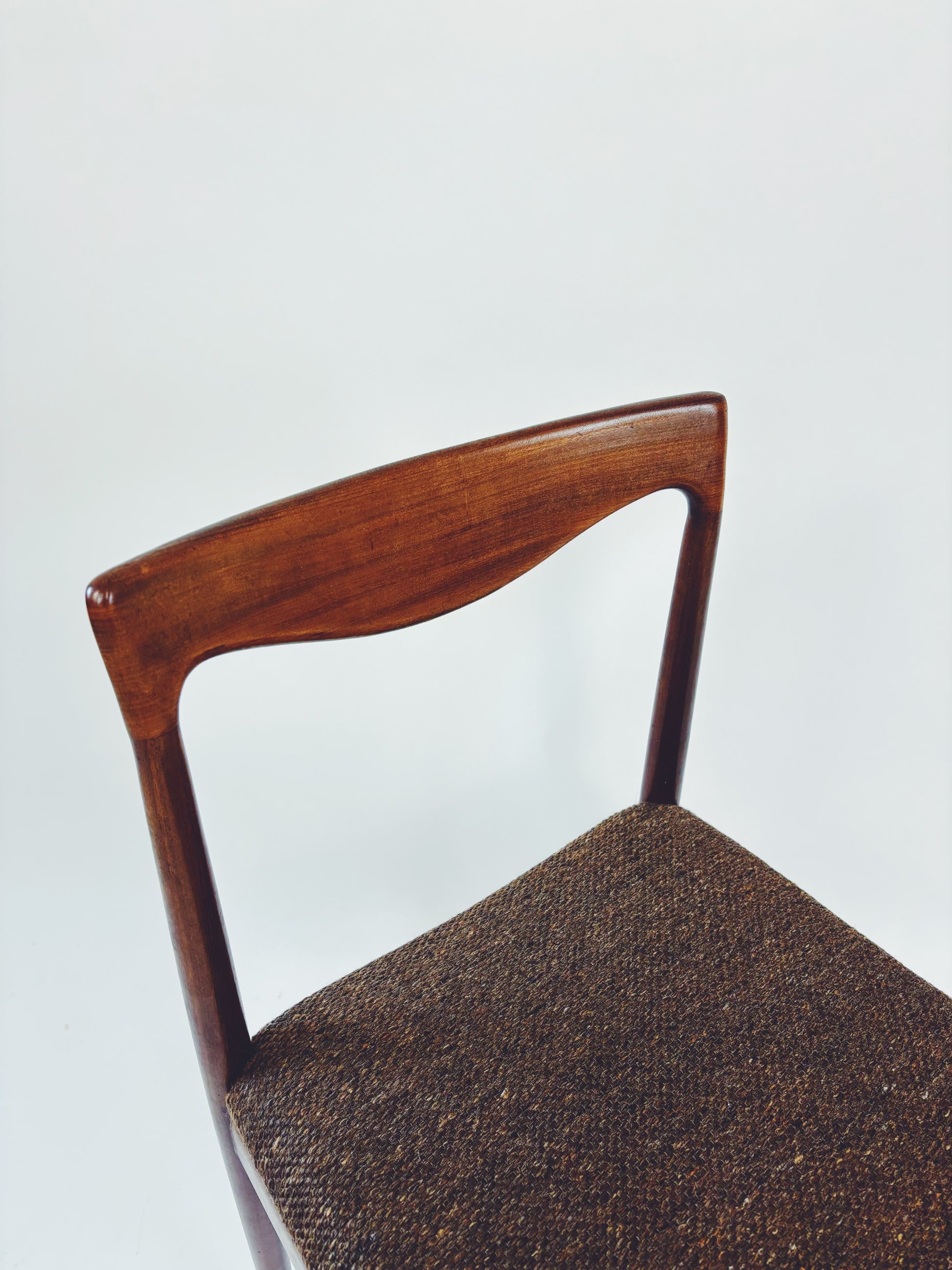 6 dänische Esszimmerstühle aus massivem Palisanderholz mit braunem Webstoff. Die schöne Maserung des Holzes kommt besonders gut auf der Rückenlehne zur Geltung.