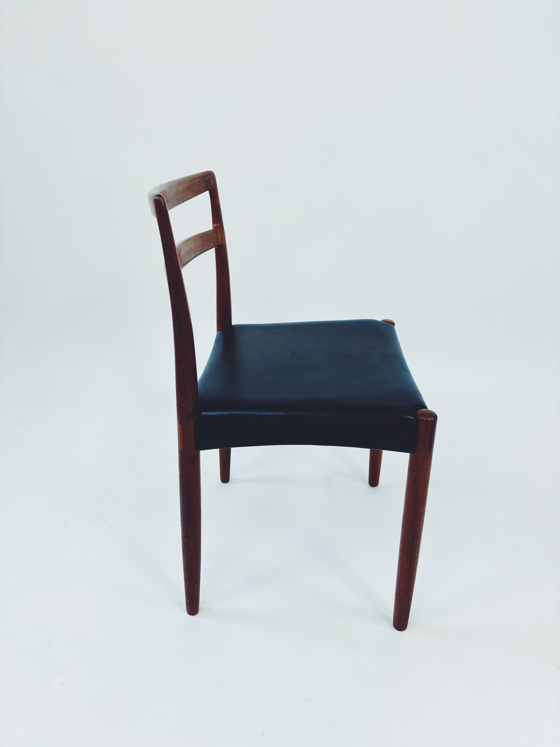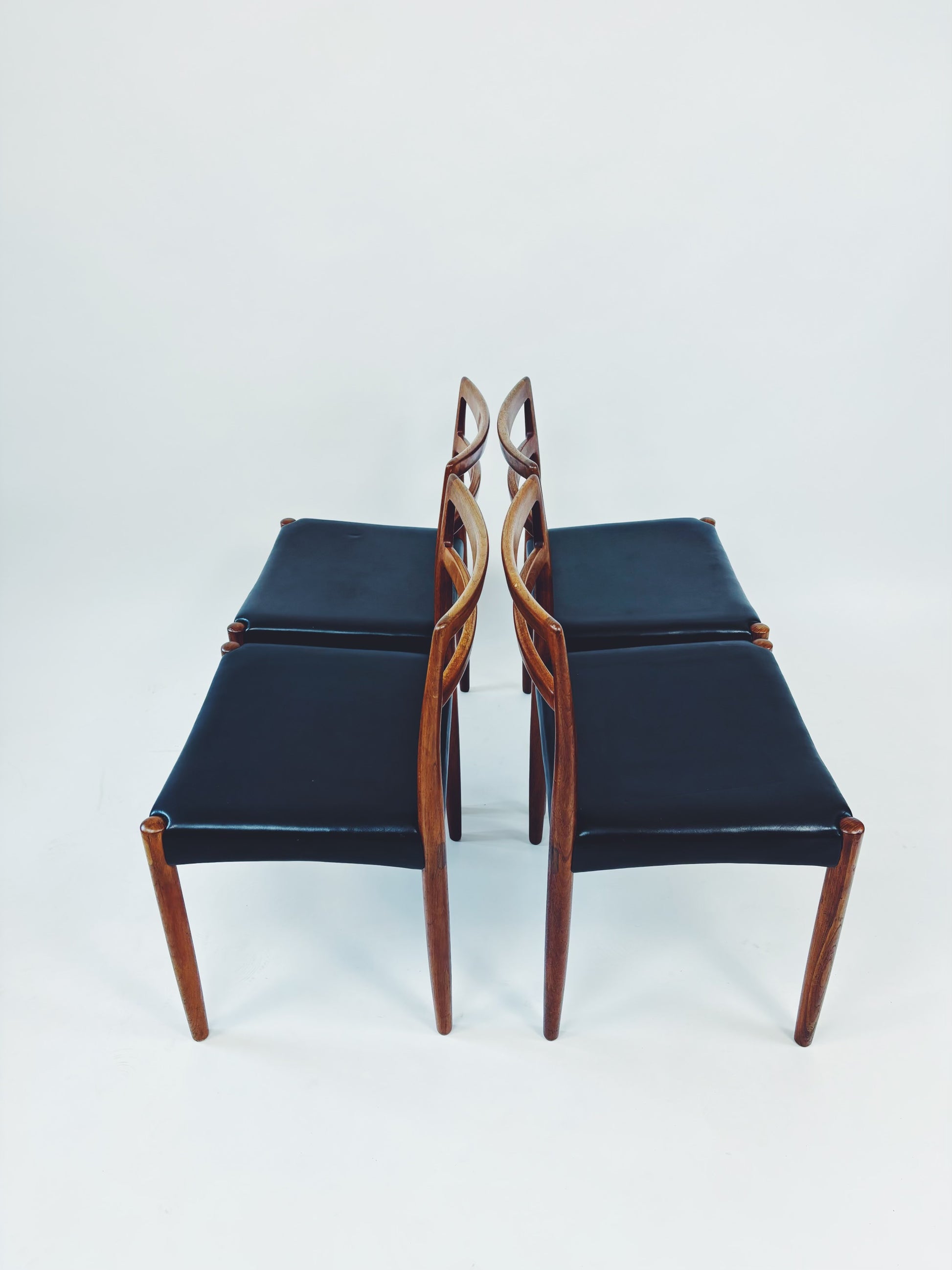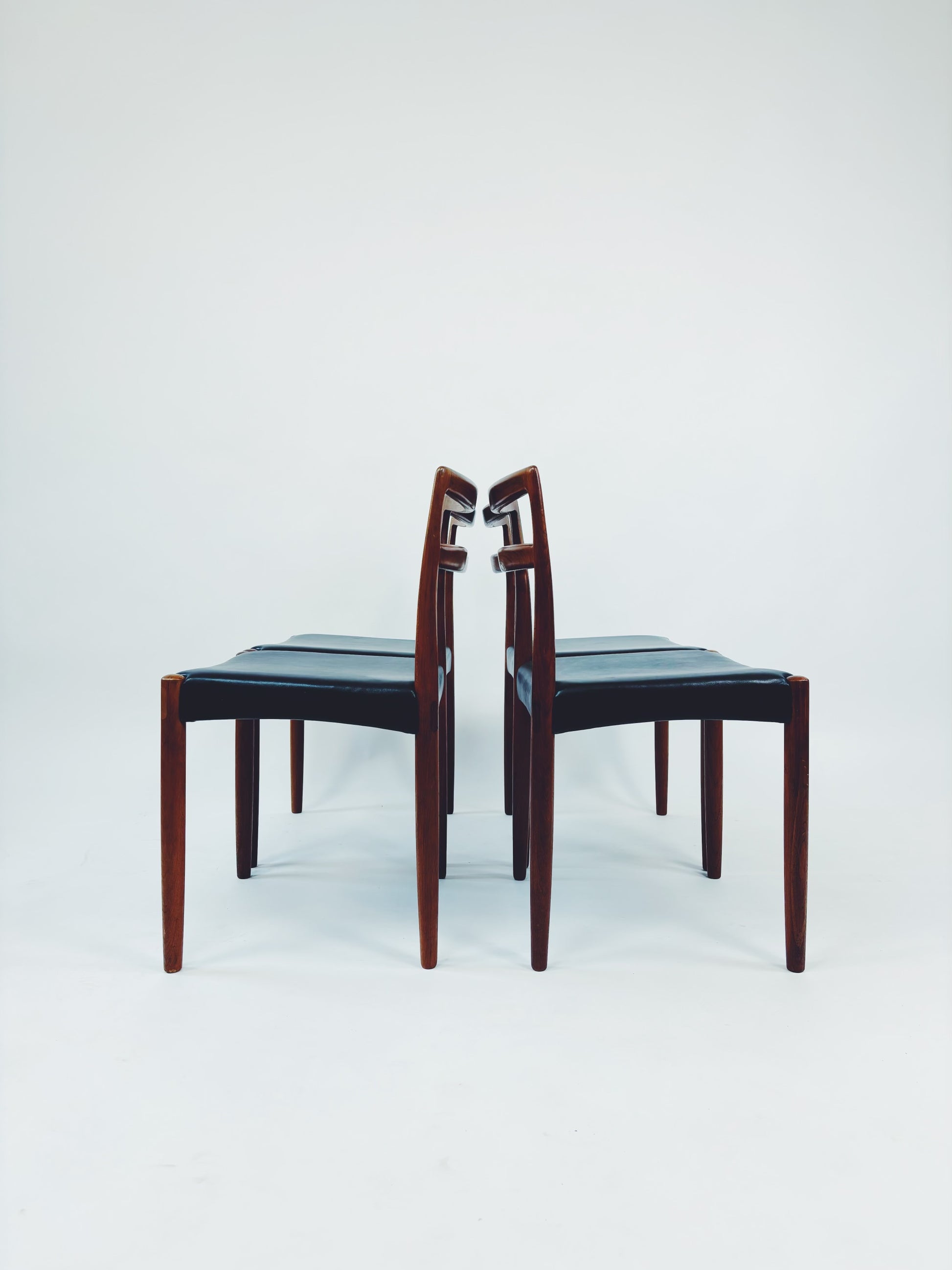 4er Set Esszimmerstühle aus massivem Palisanderholz und schwarzem Skai-Leder, entworfen vom dänischen Designer Harry Østergaard. Hergestellt in Dänemark von der Randers Møbelfabrik.