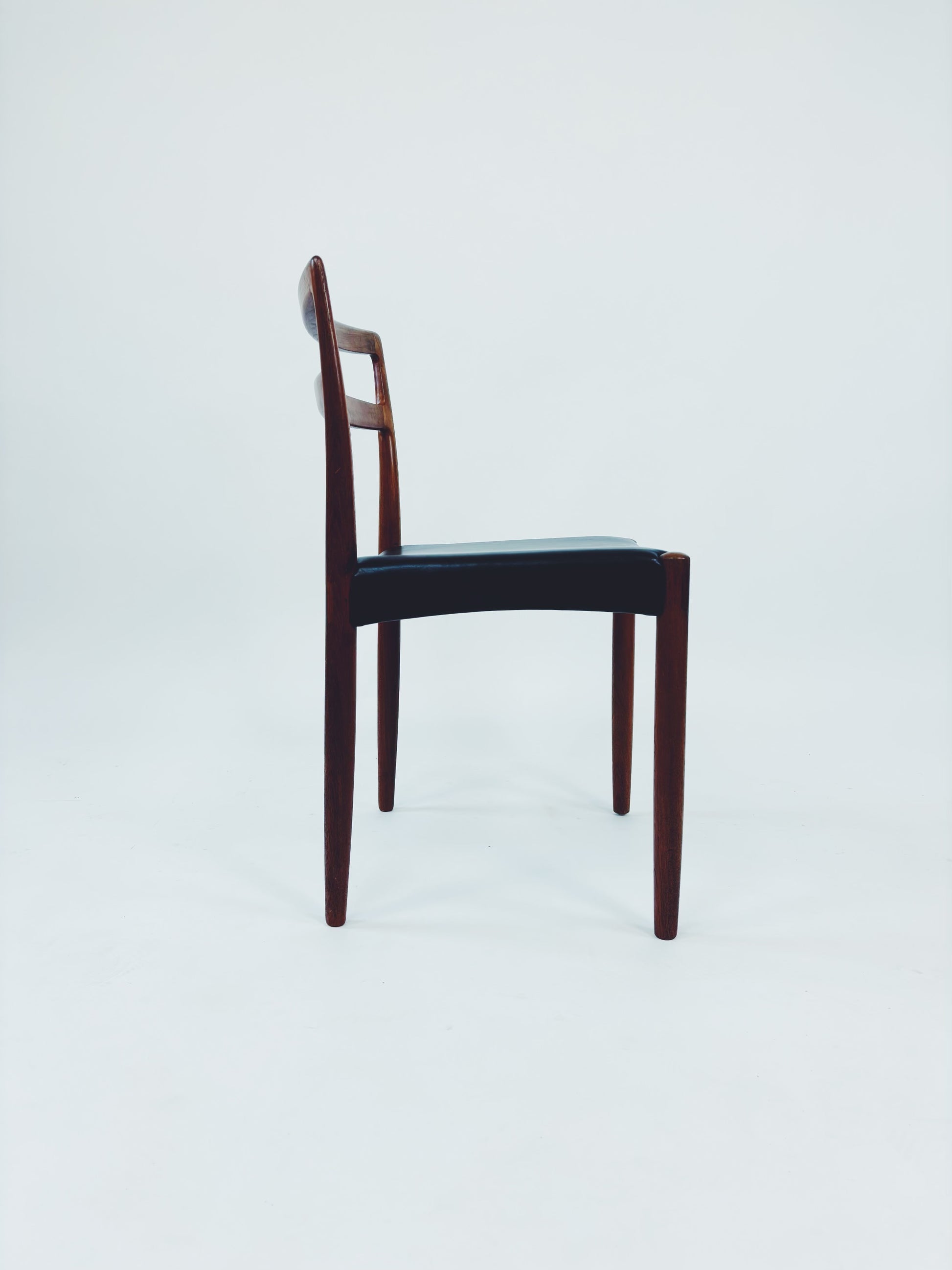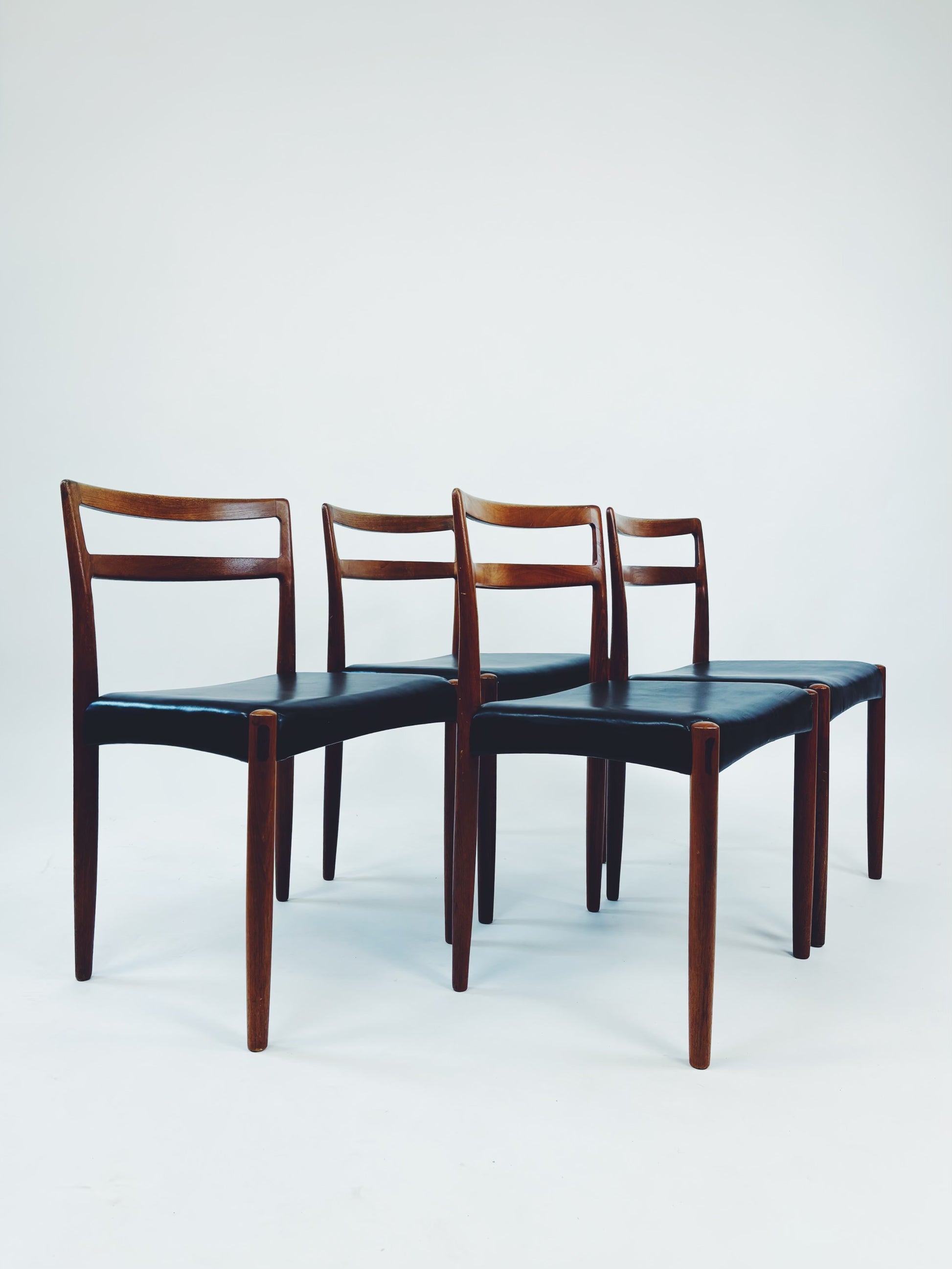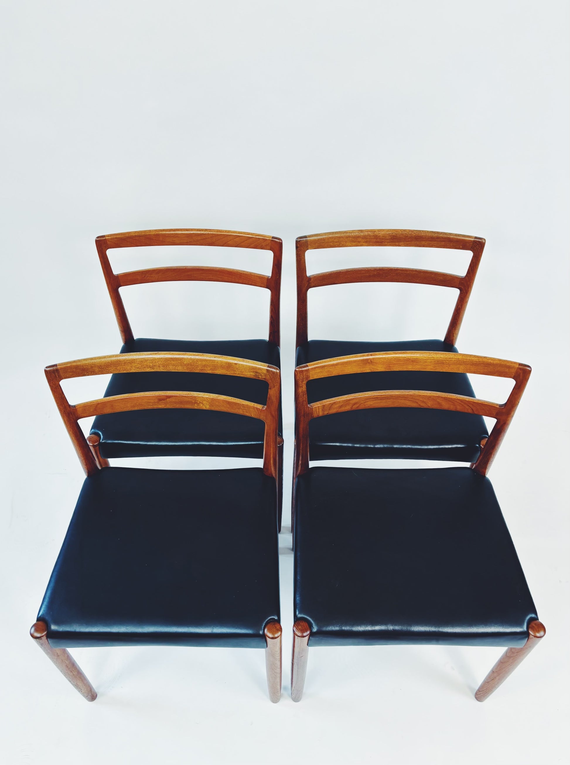 4er Set Esszimmerstühle aus massivem Palisanderholz und schwarzem Skai-Leder, entworfen vom dänischen Designer Harry Østergaard. Hergestellt in Dänemark von der Randers Møbelfabrik.