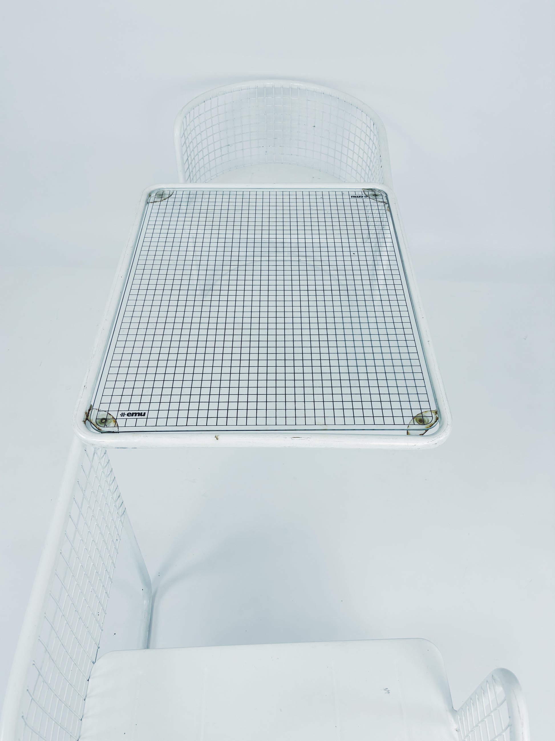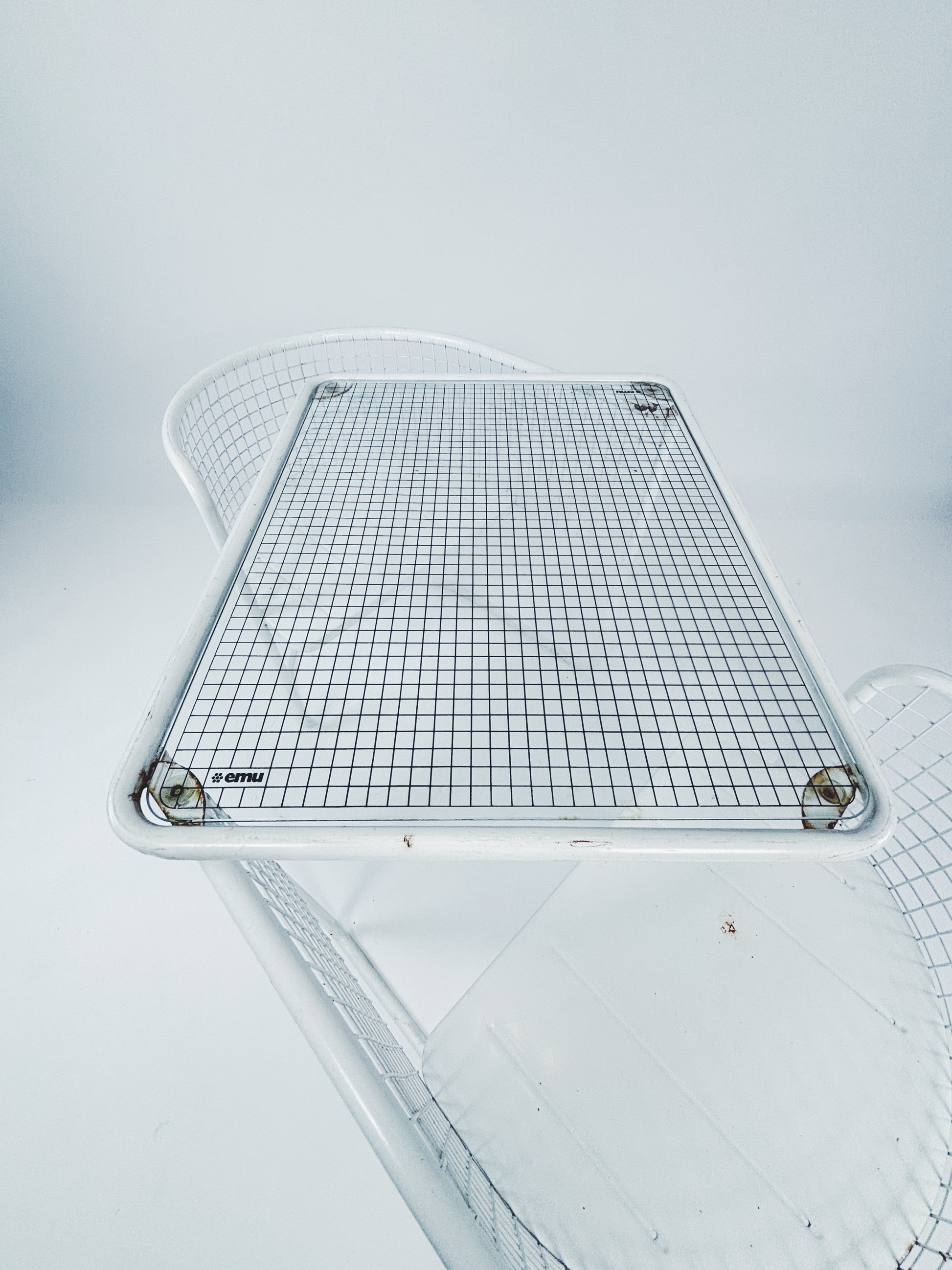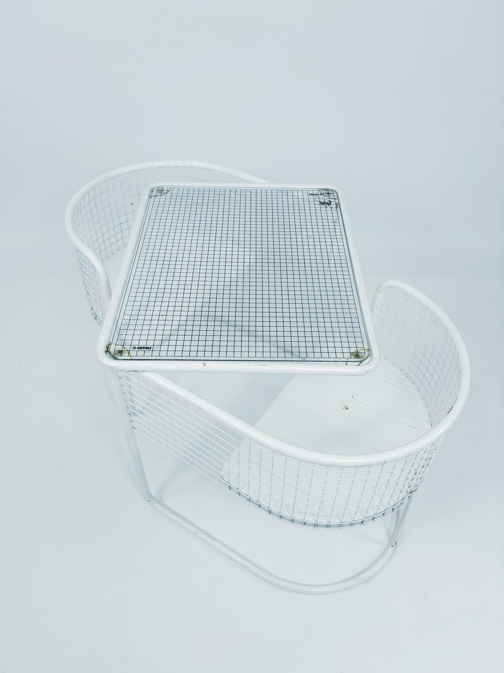 Gartenset hergestellt von Emu (Italien) in den 80ern. Weiß lackierter Metallrahmen mit Glasplatte. Zusammenklappbar.