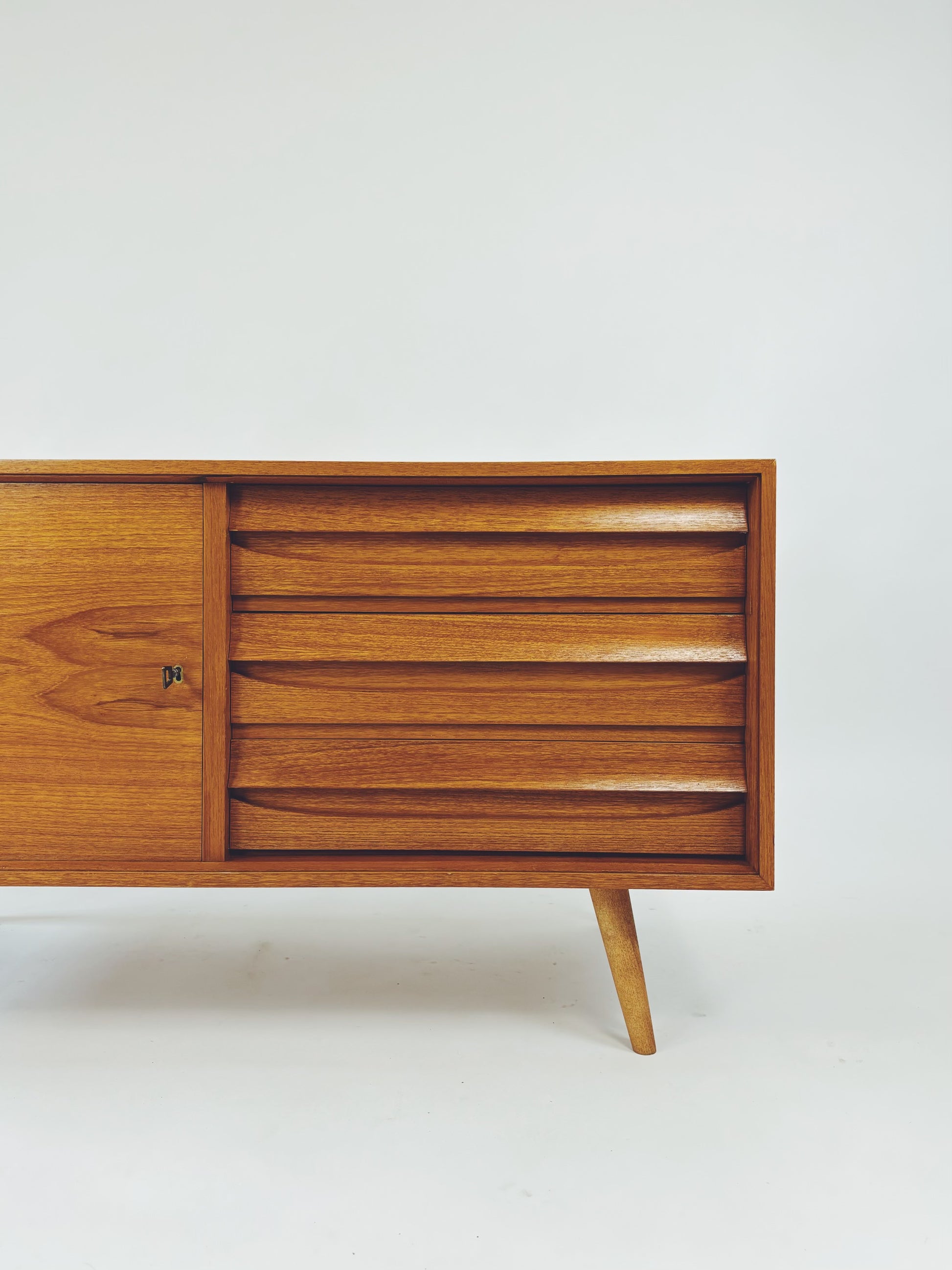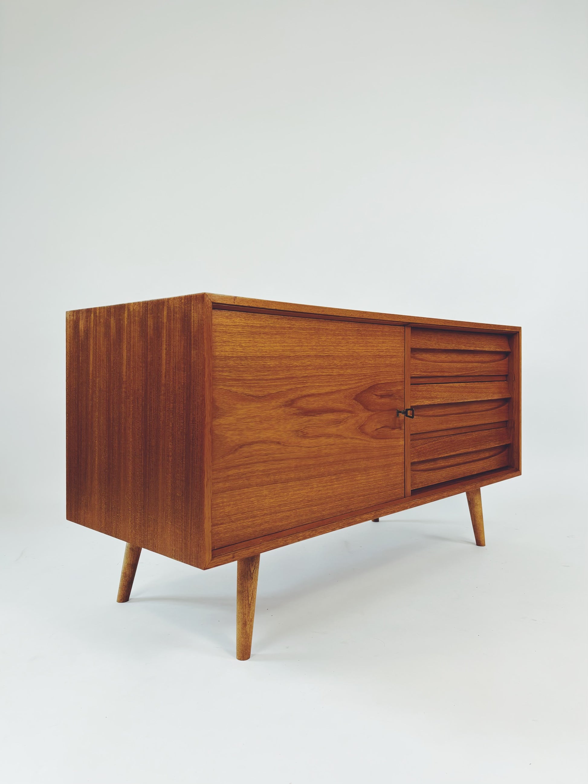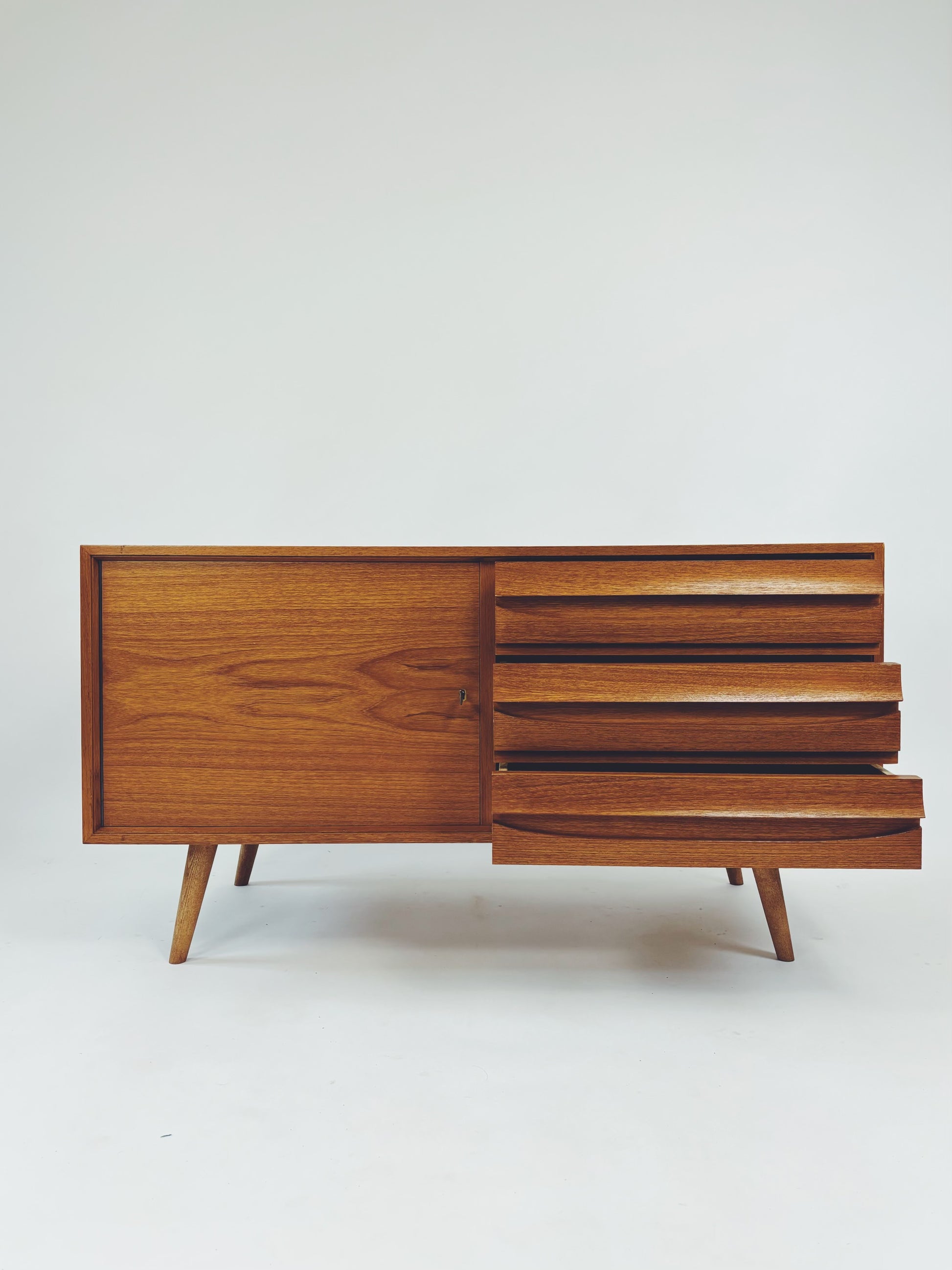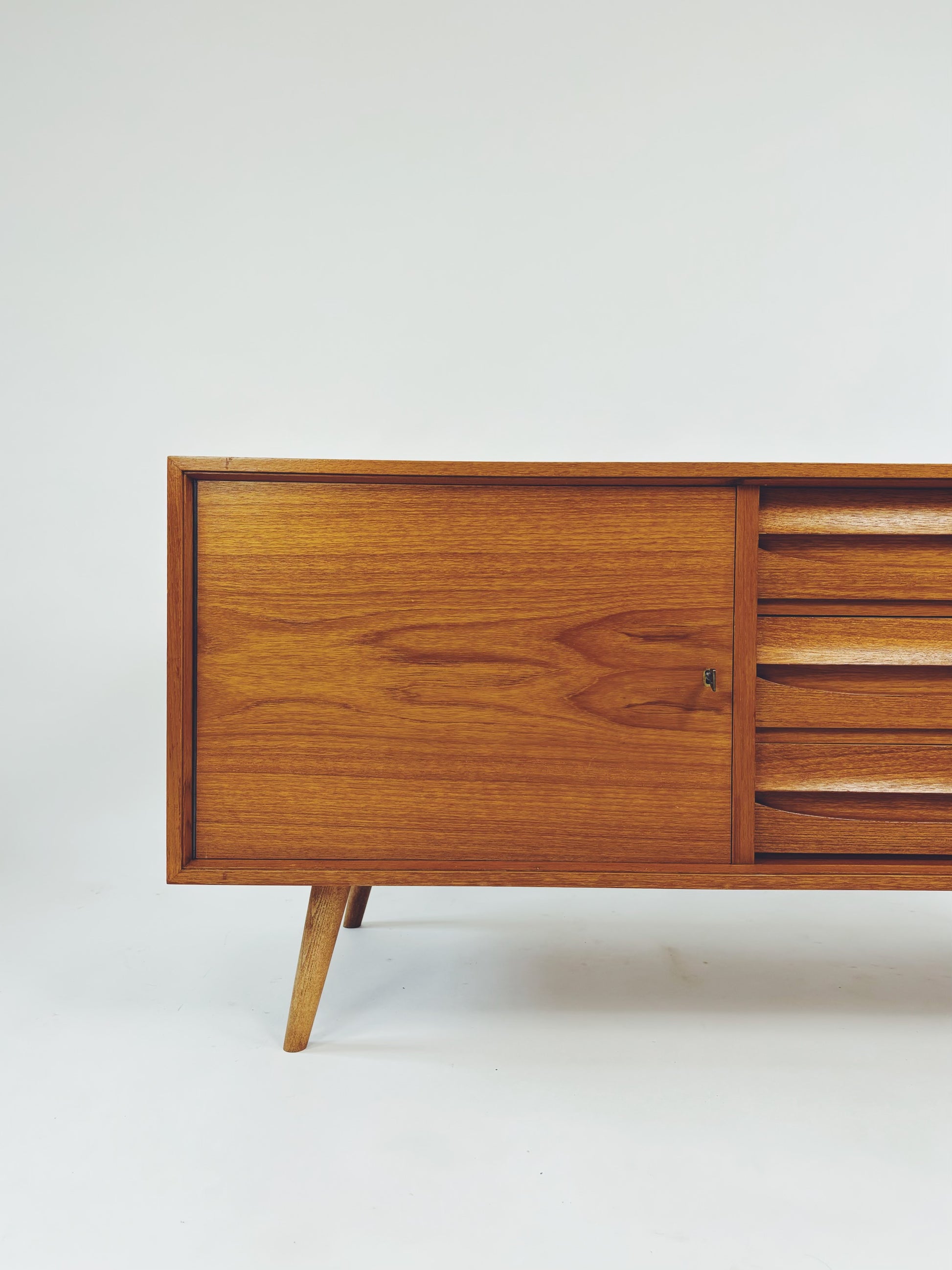 Formschöne Mid-Century Kommode aus Eichenholz von Franzmeyer Möbel aus den 60er Jahren. Besonders hervorzuheben sind die 3 aufwendig gearbeiteten Laden mit versteckter Griffmulde.