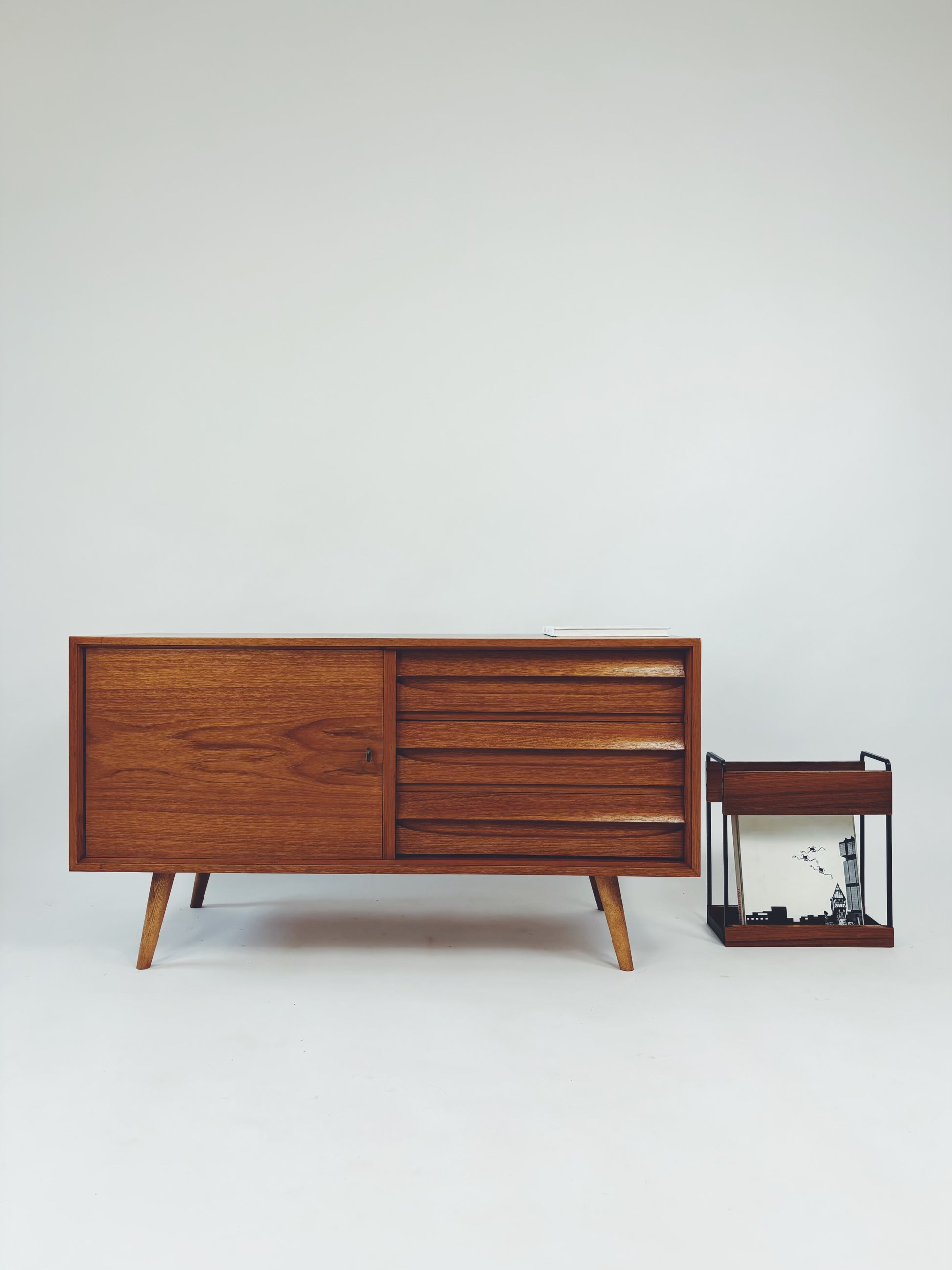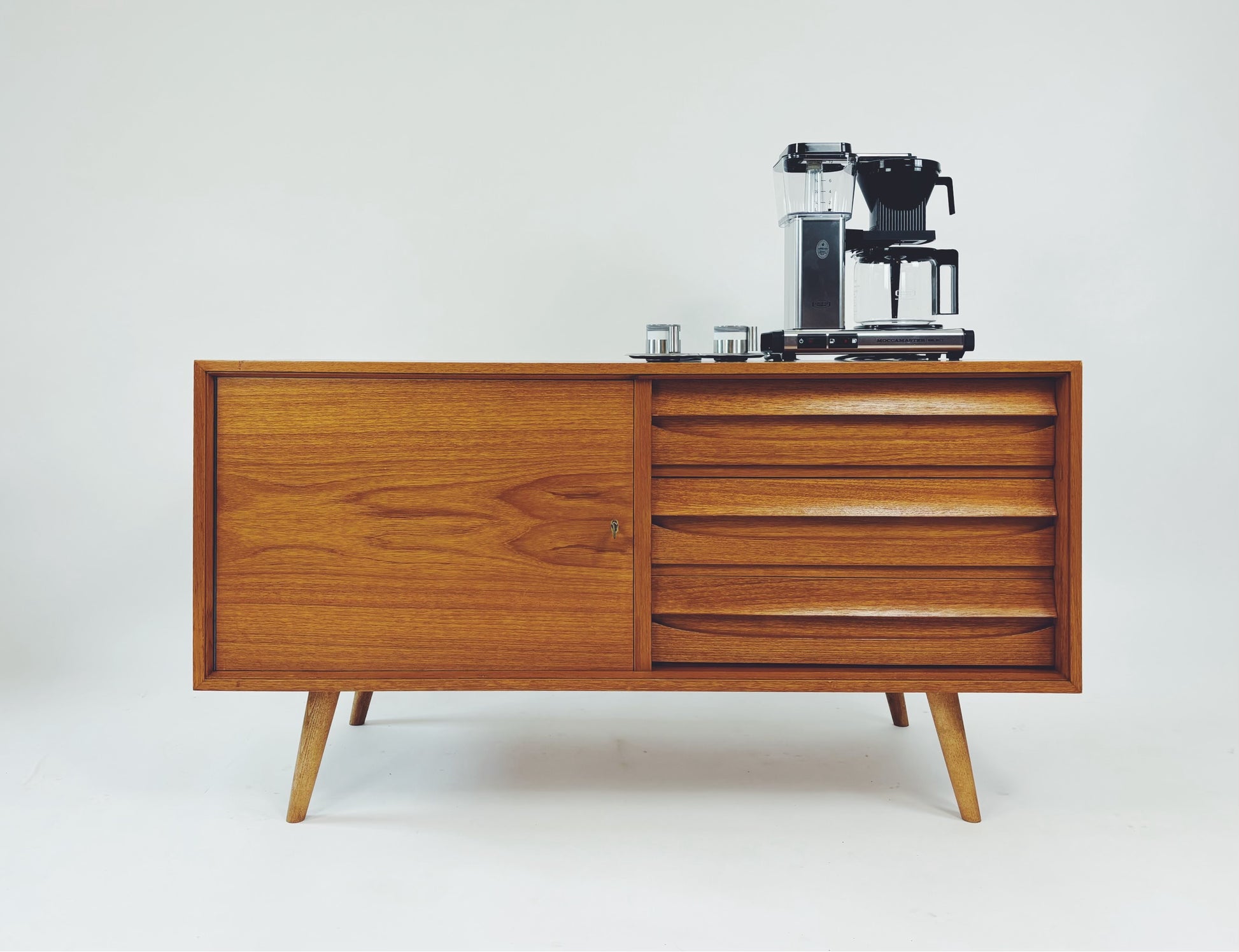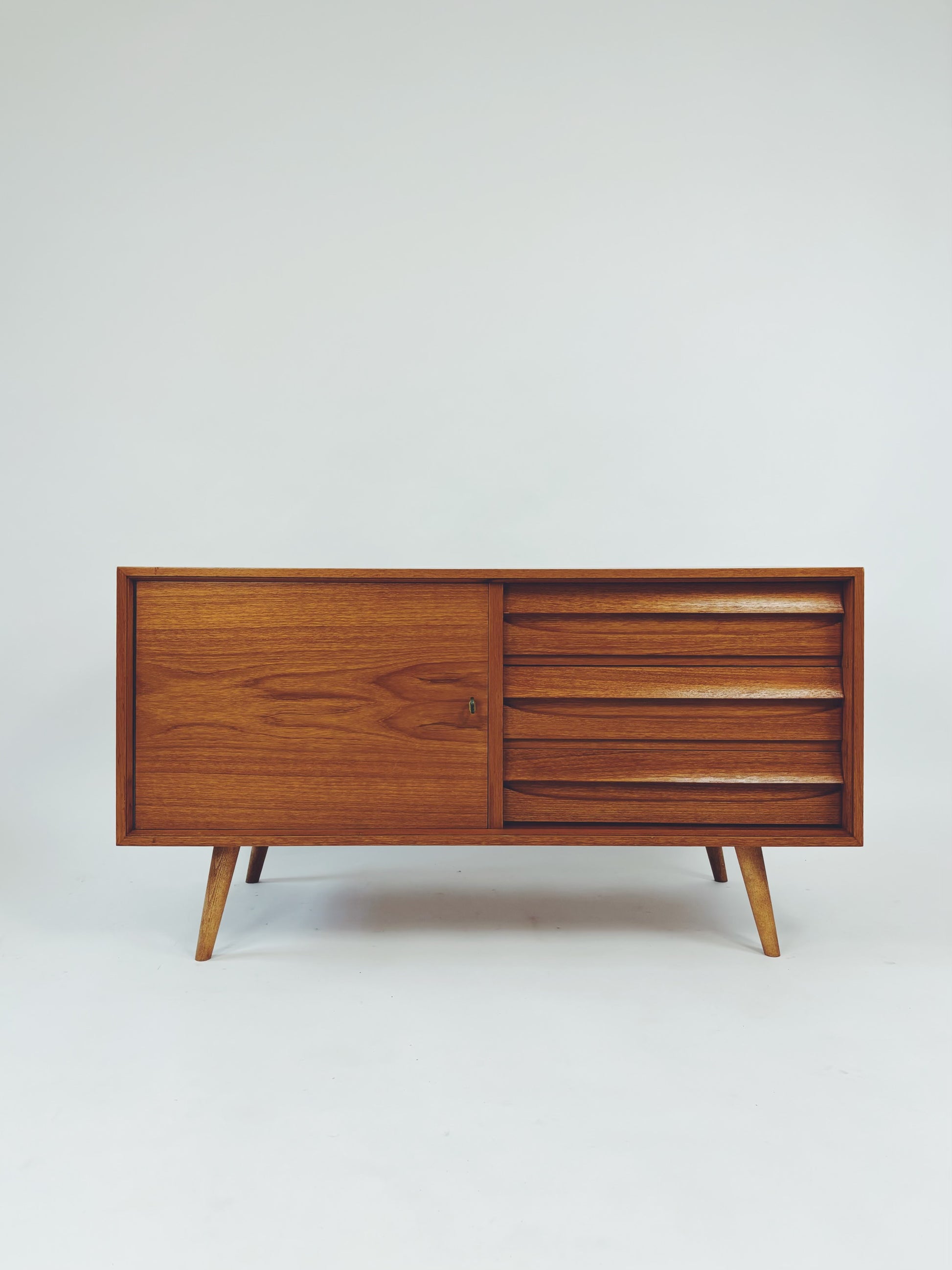 Formschöne Mid-Century Kommode aus Eichenholz von Franzmeyer Möbel aus den 60er Jahren. Besonders hervorzuheben sind die 3 aufwendig gearbeiteten Laden mit versteckter Griffmulde.