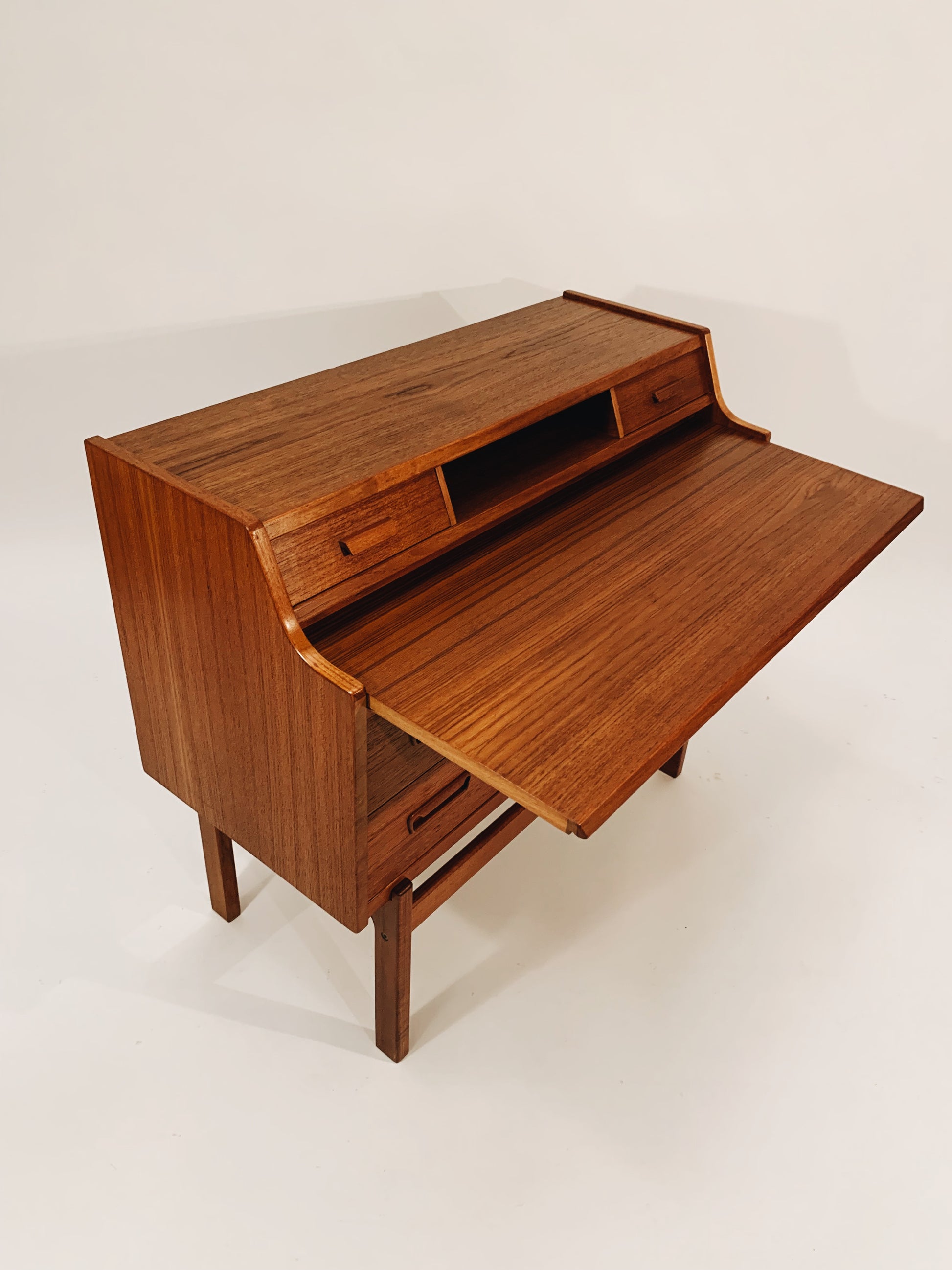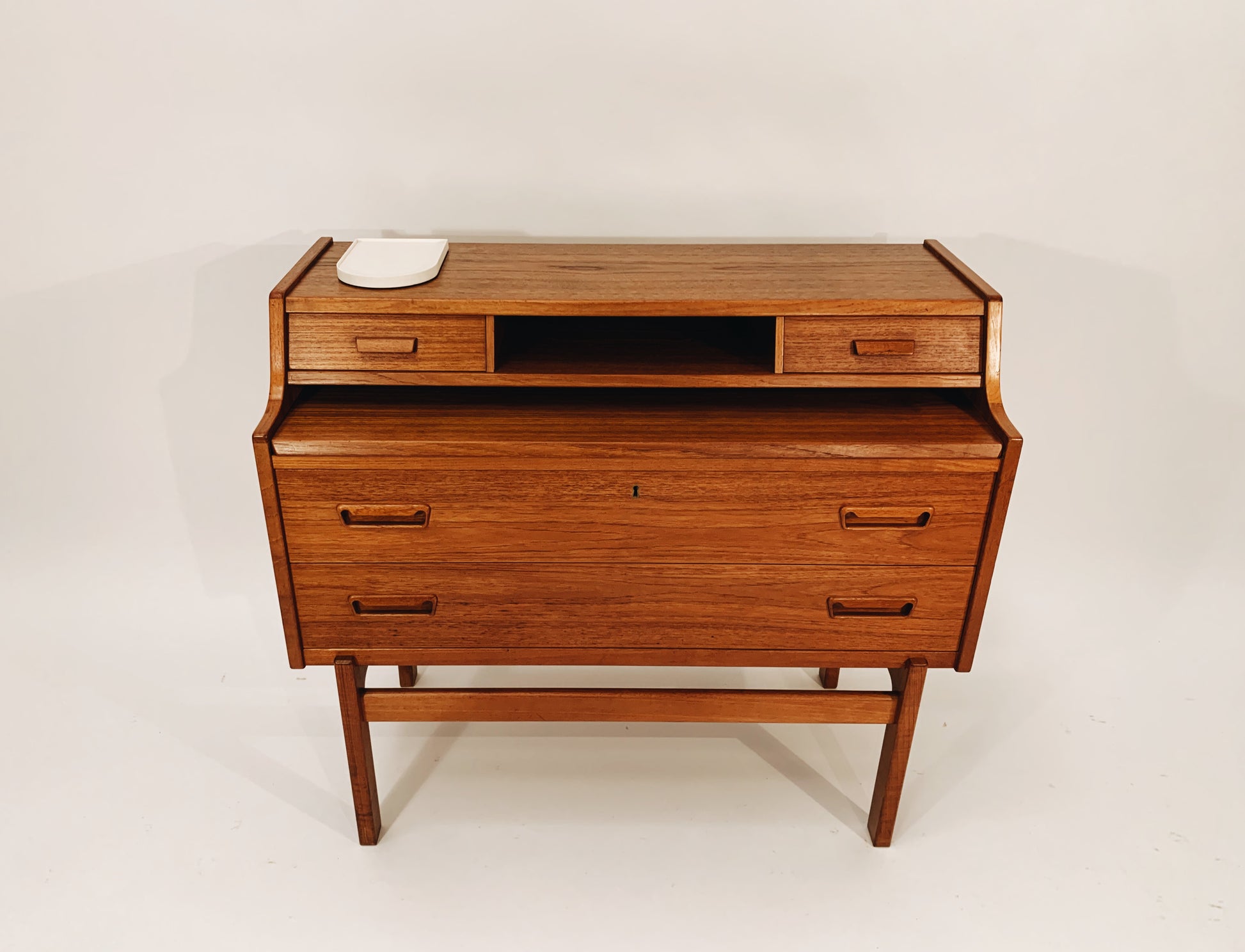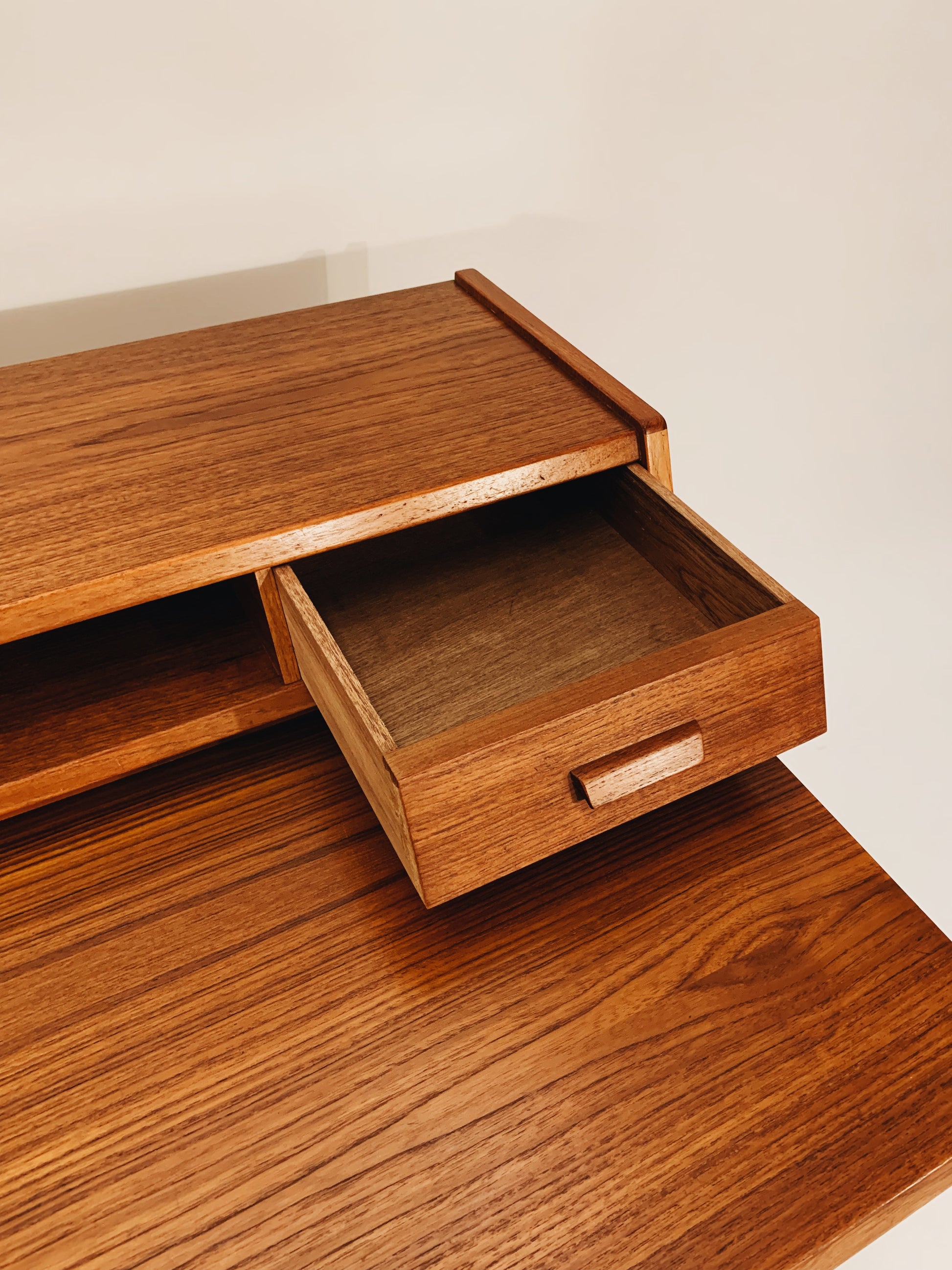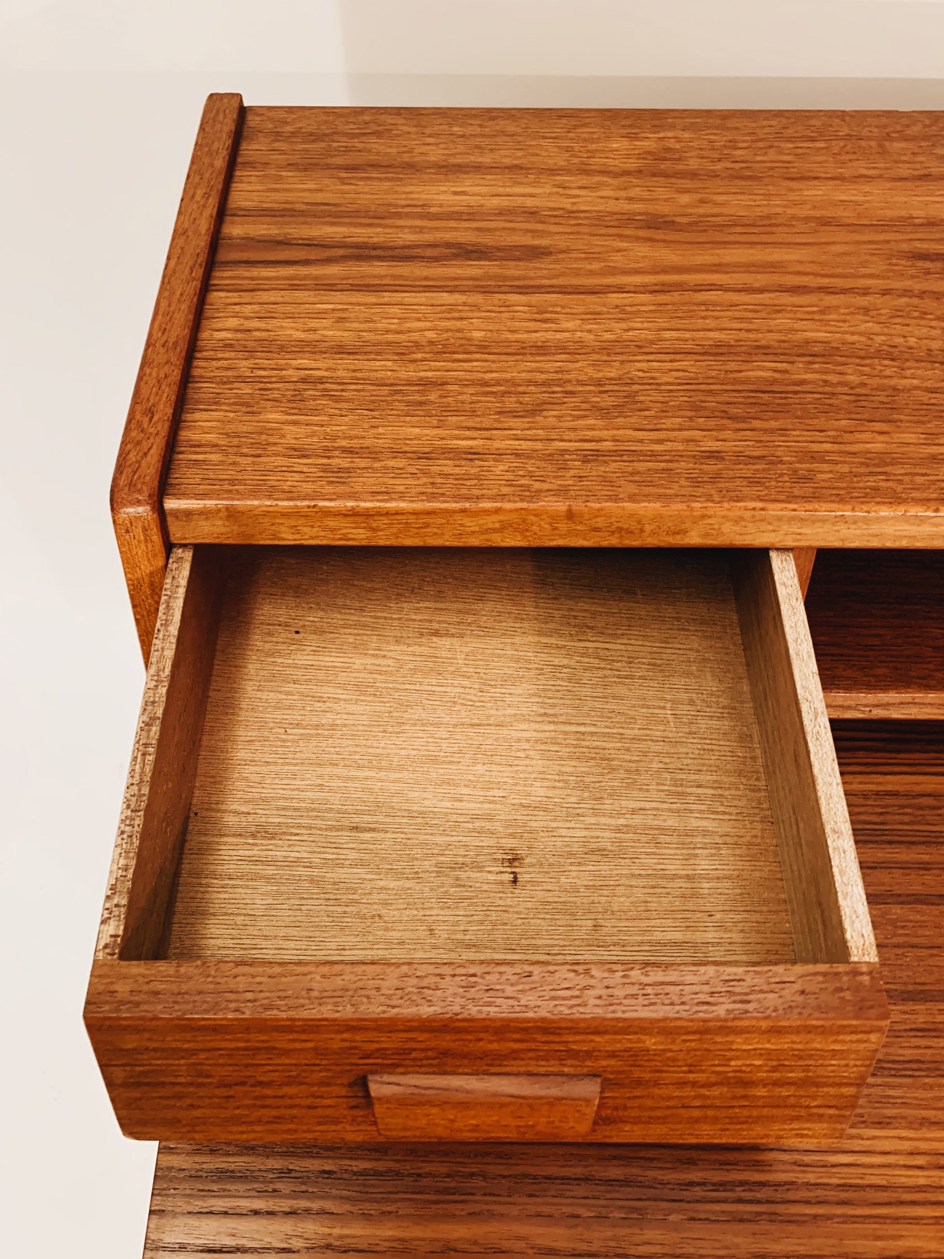 Das Schreibmöbel aus den 60er Jahren besteht aus wertigem Teakholz mit einer abschließbaren Holzlade (Schlüssel vorhanden). Die Arbeitsfläche bietet genug Platz für ein 15" Laptop. Die Laden schließen bündig.