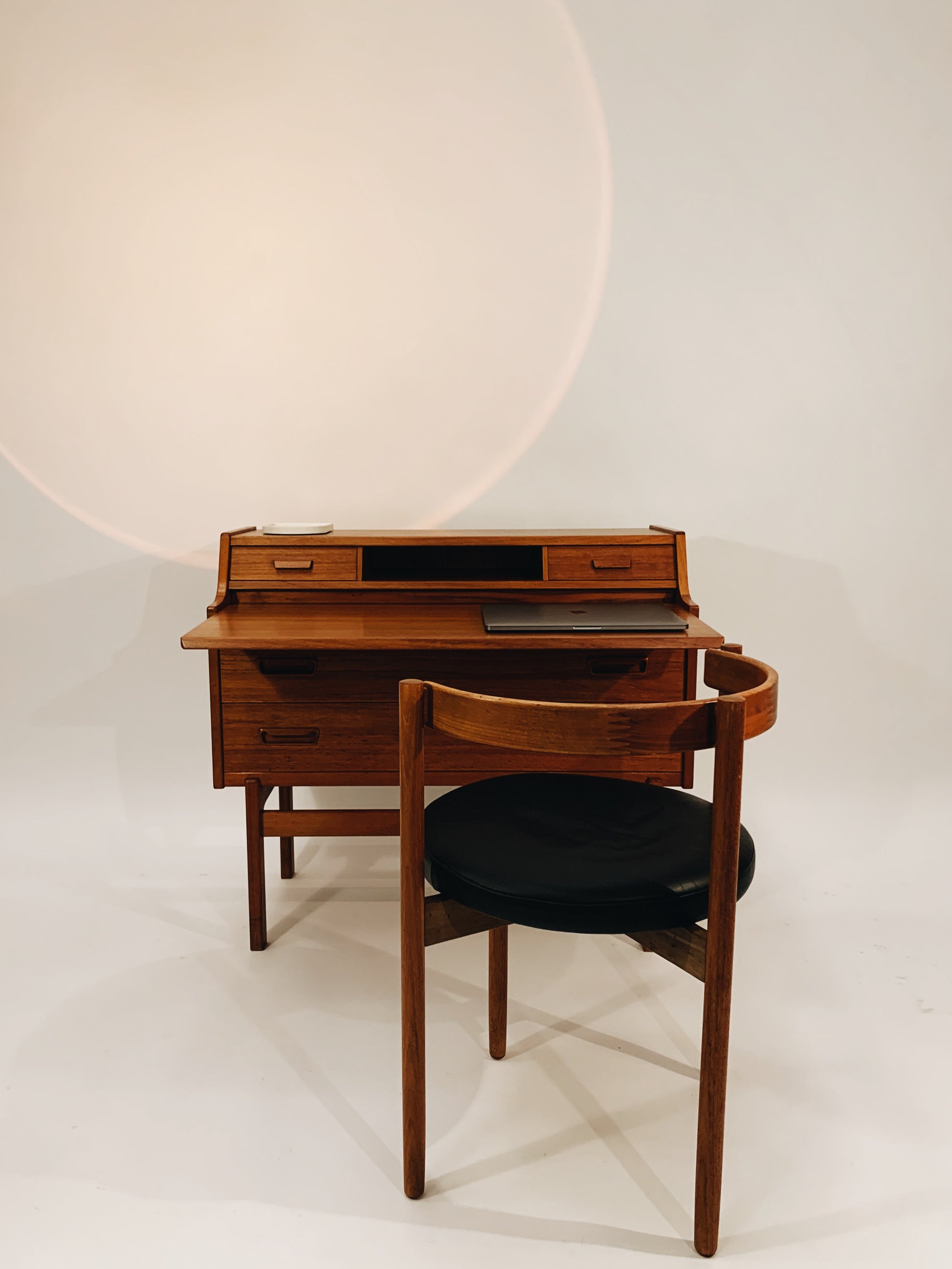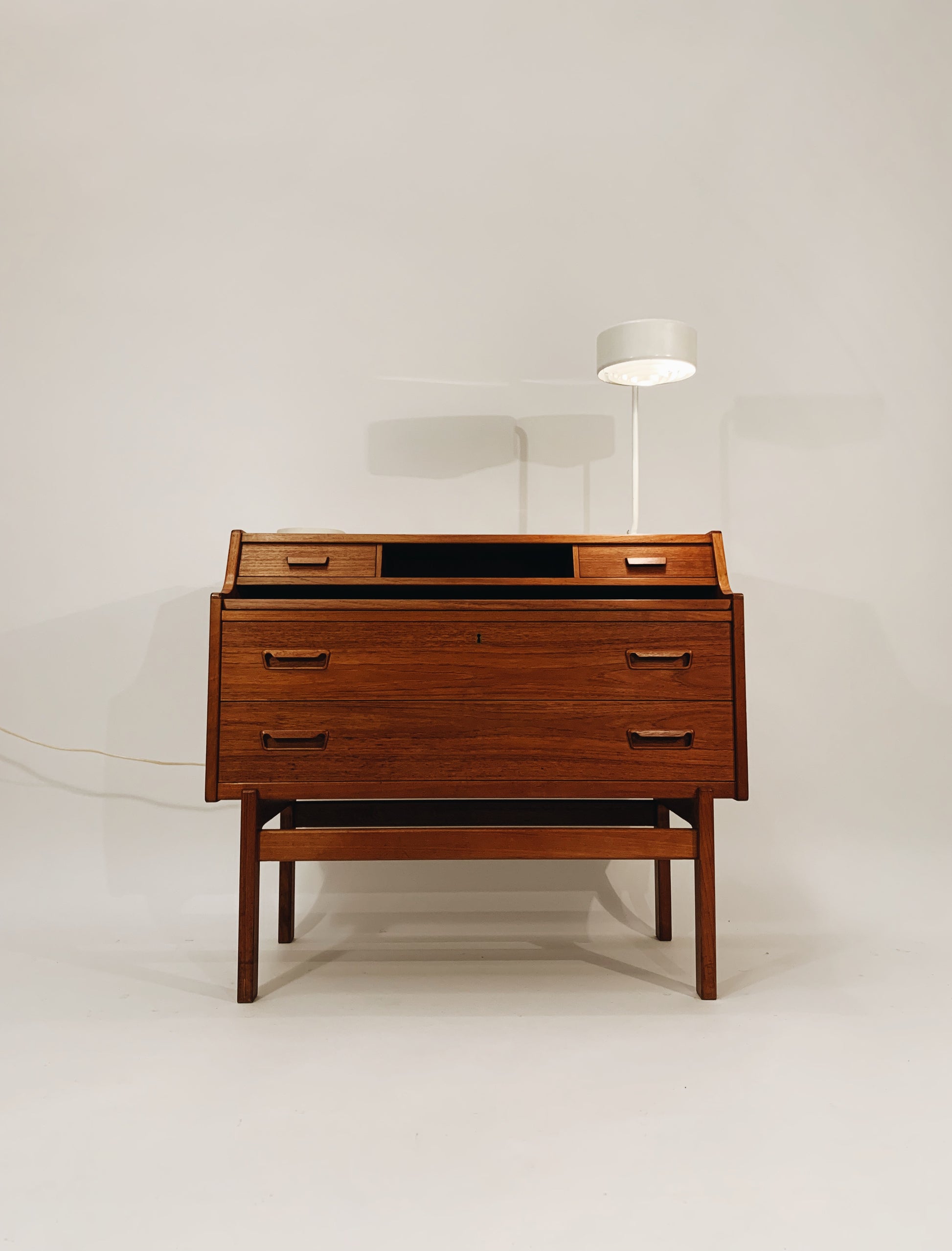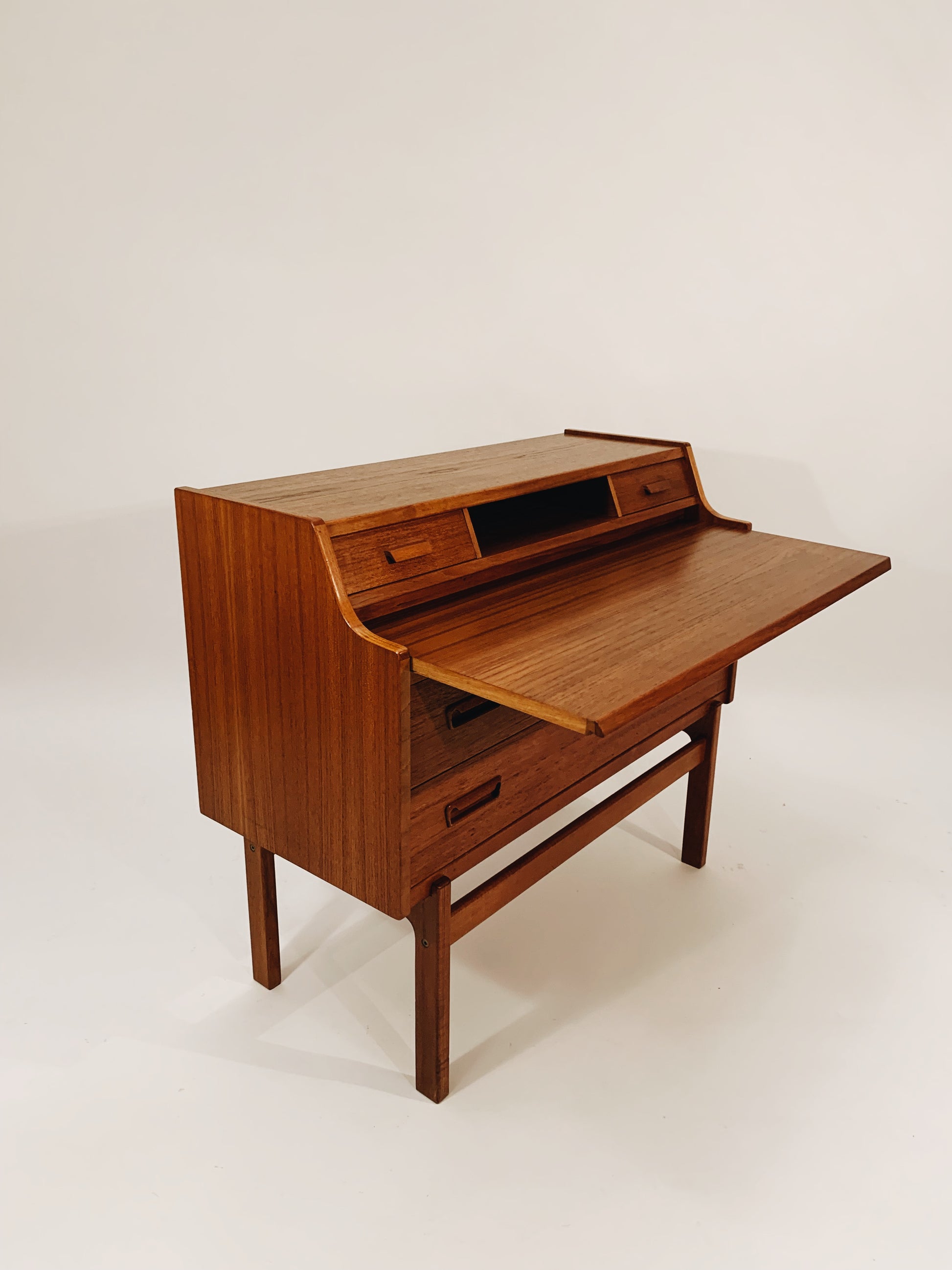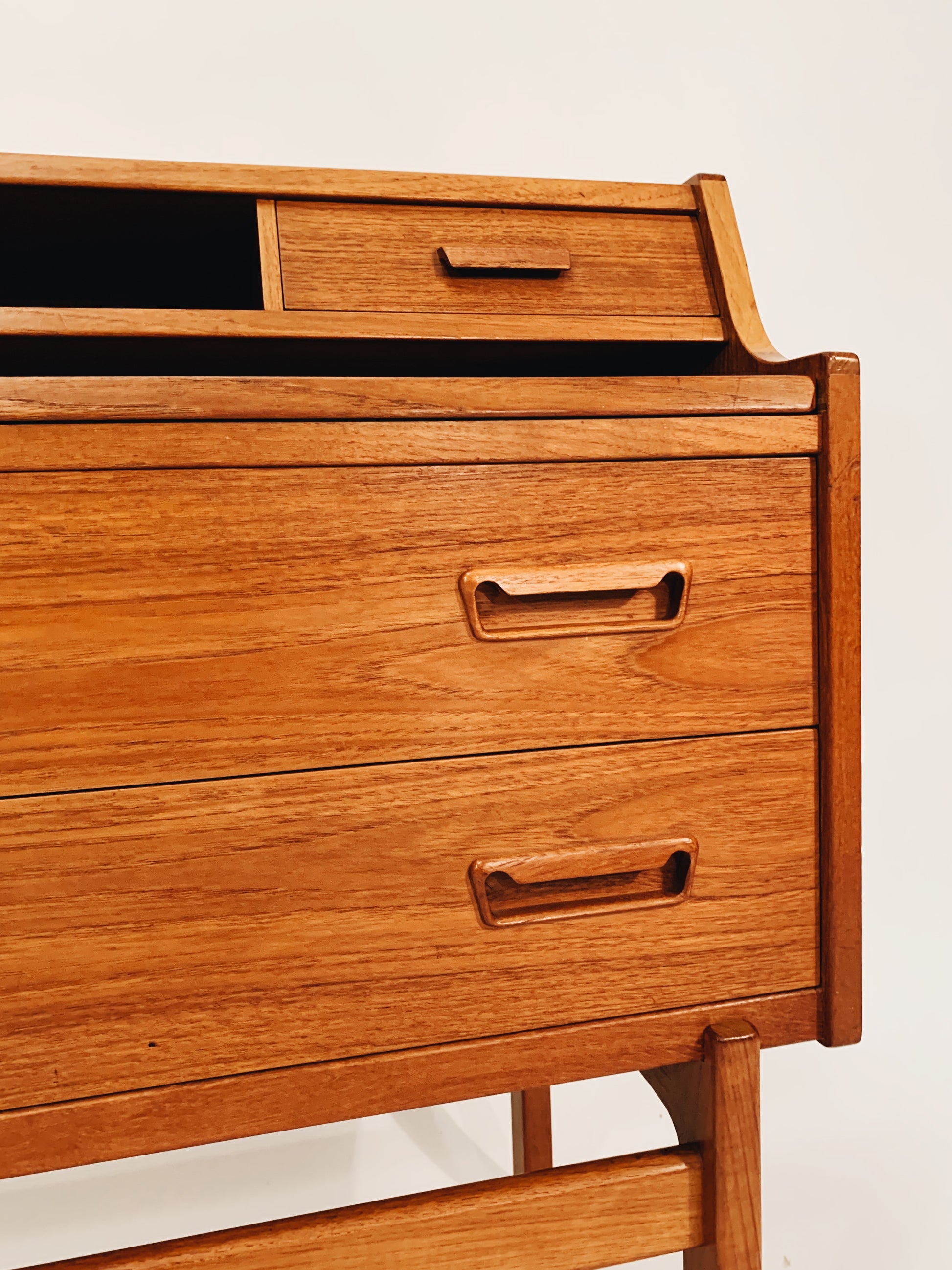 Das Schreibmöbel aus den 60er Jahren besteht aus wertigem Teakholz mit einer abschließbaren Holzlade (Schlüssel vorhanden). Die Arbeitsfläche bietet genug Platz für ein 15" Laptop. Die Laden schließen bündig.
