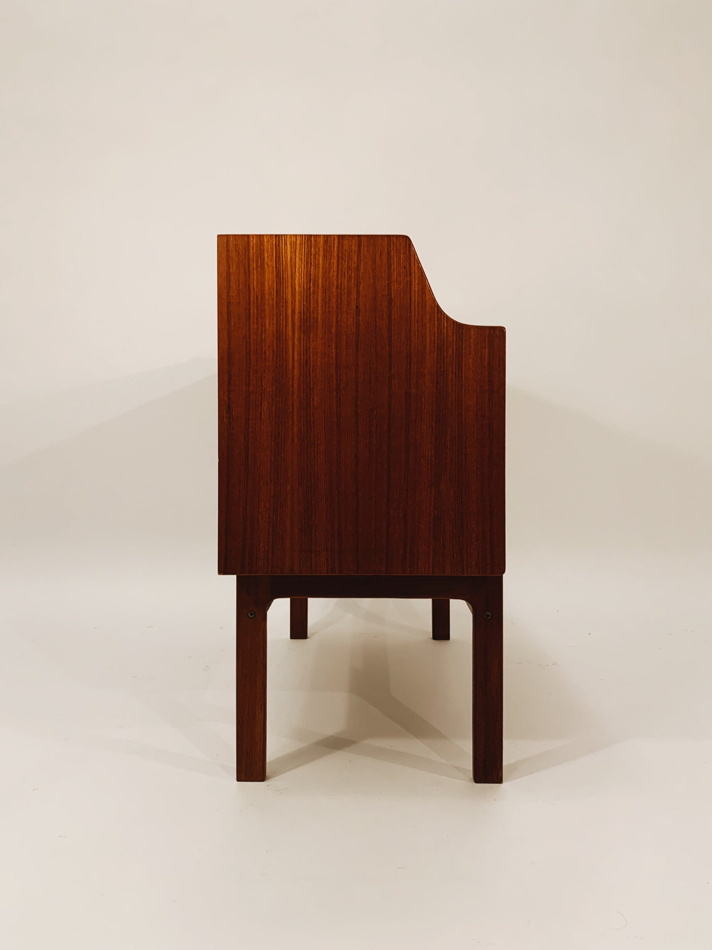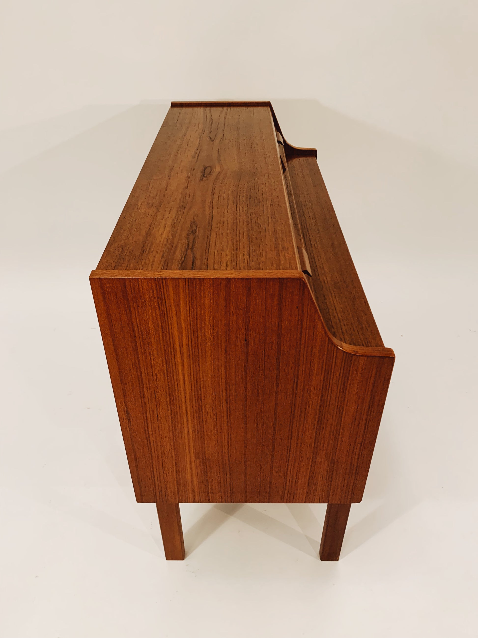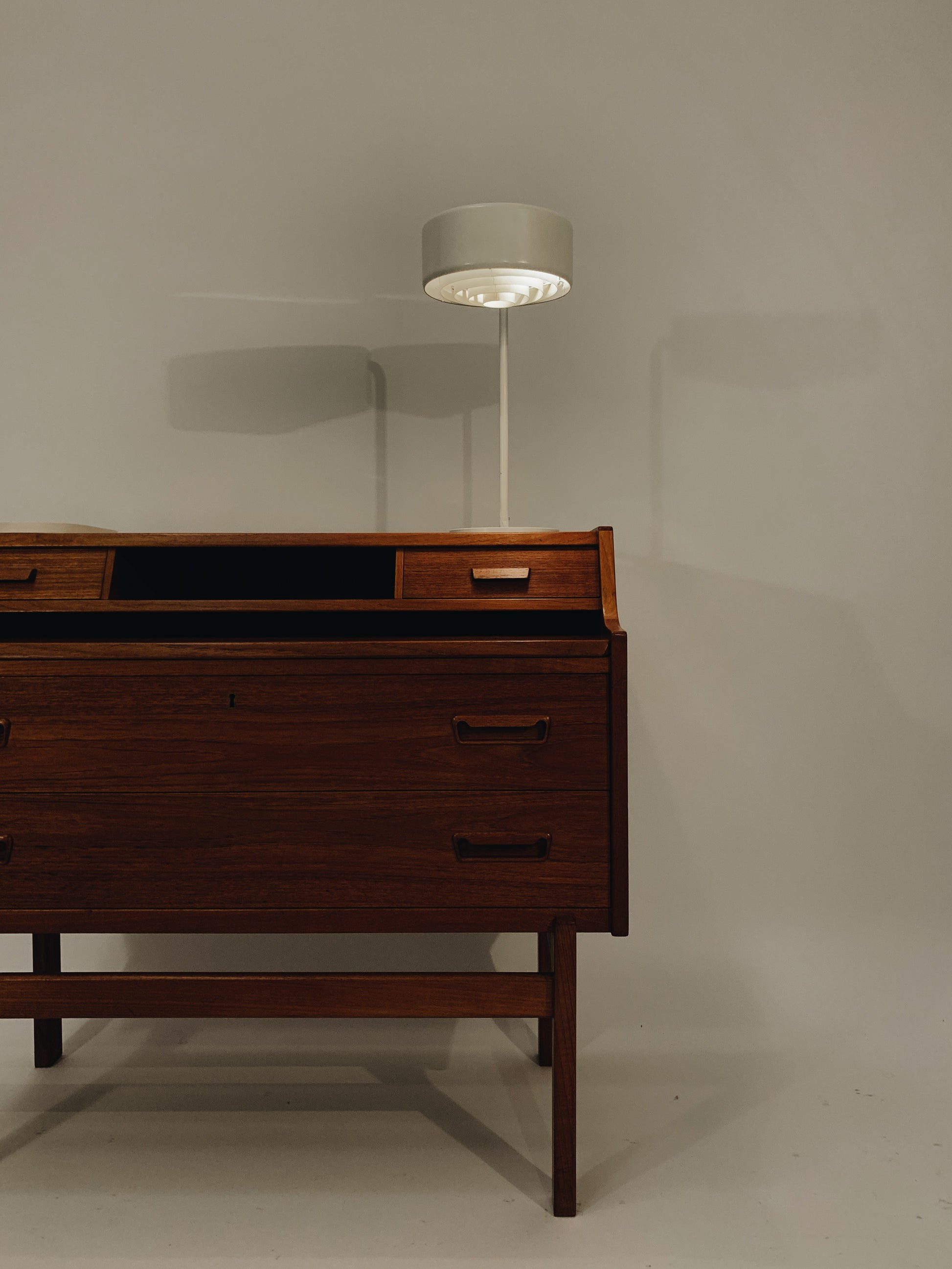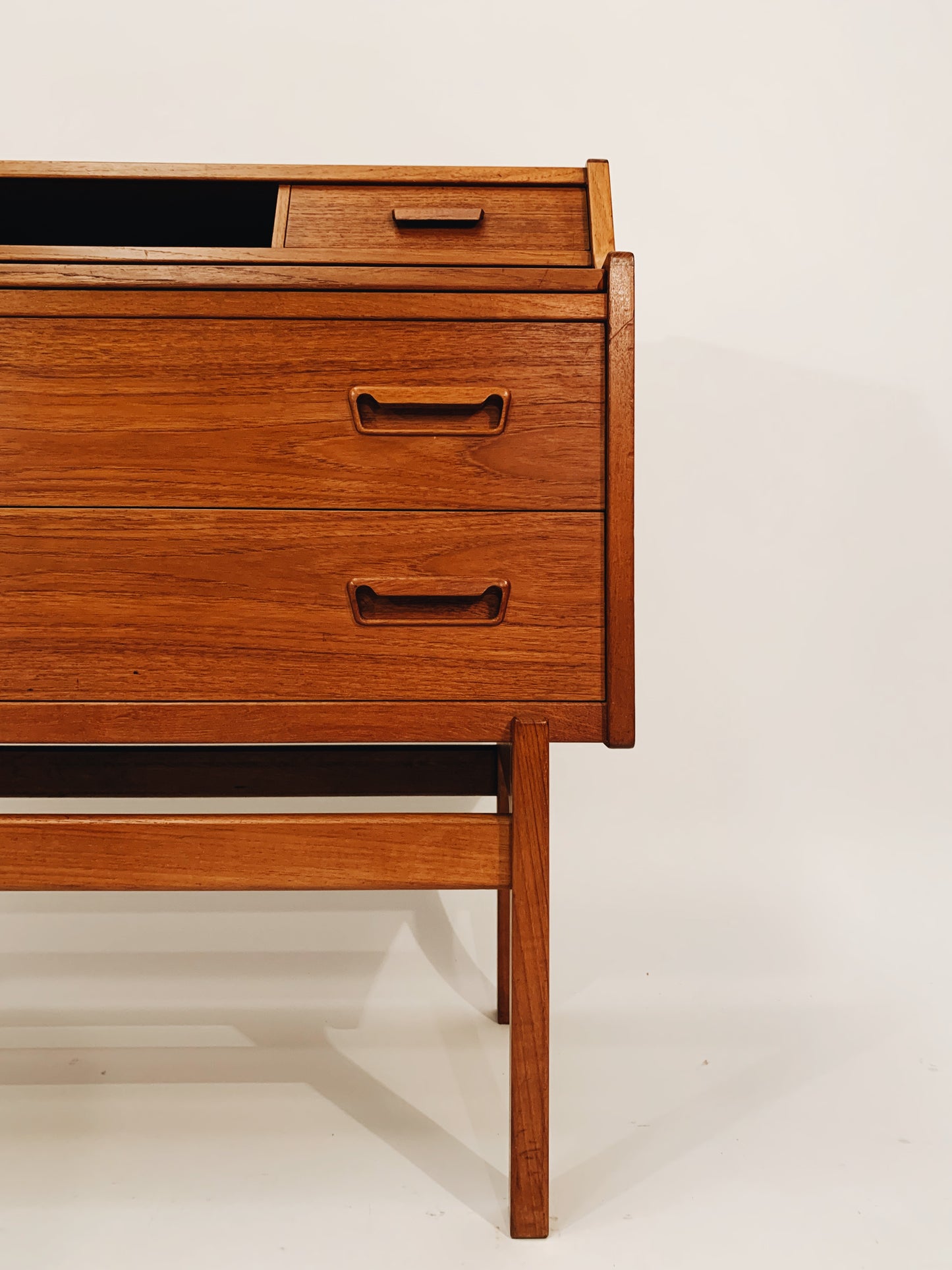 Das Schreibmöbel aus den 60er Jahren besteht aus wertigem Teakholz mit einer abschließbaren Holzlade (Schlüssel vorhanden). Die Arbeitsfläche bietet genug Platz für ein 15" Laptop. Die Laden schließen bündig.