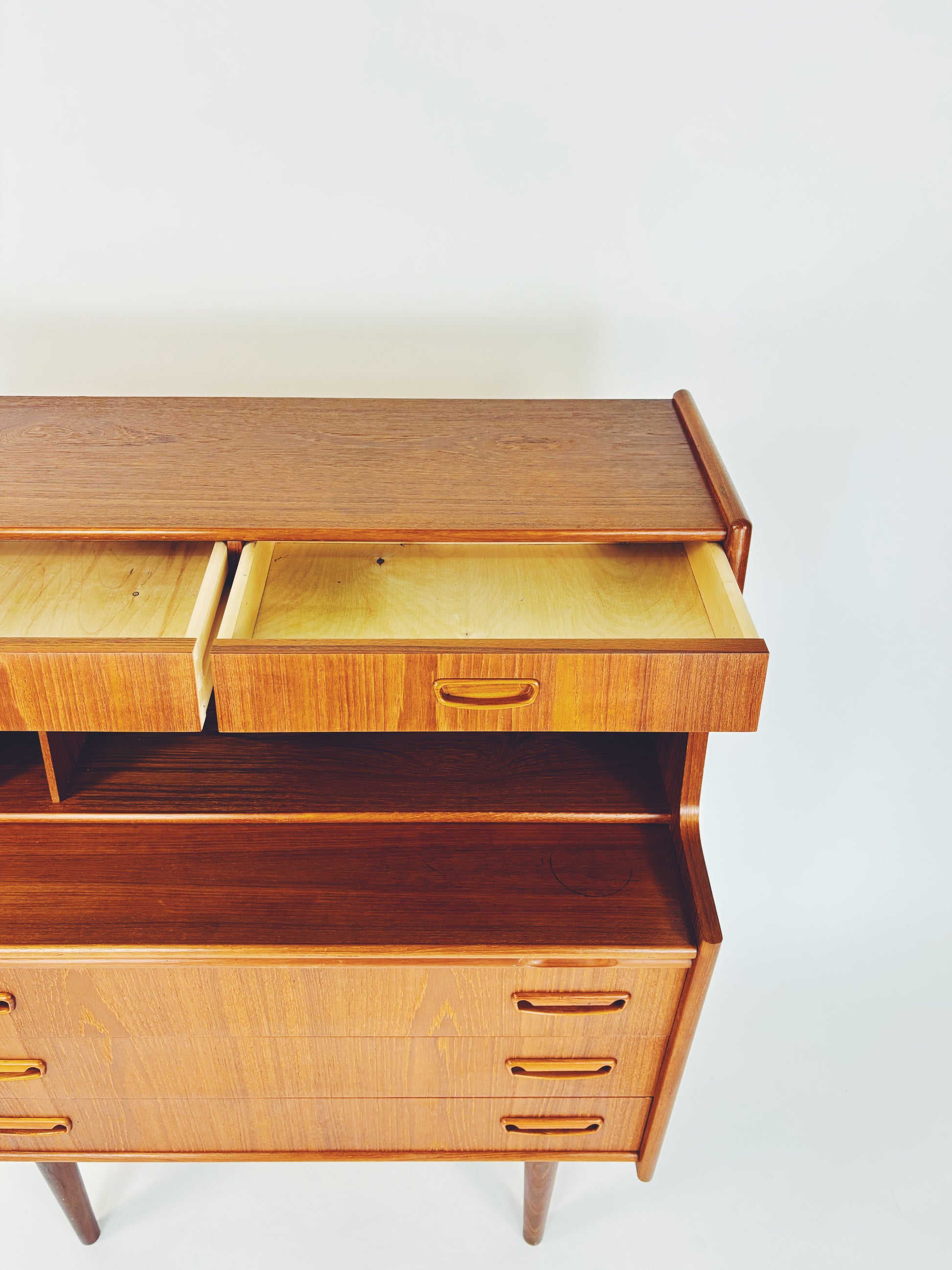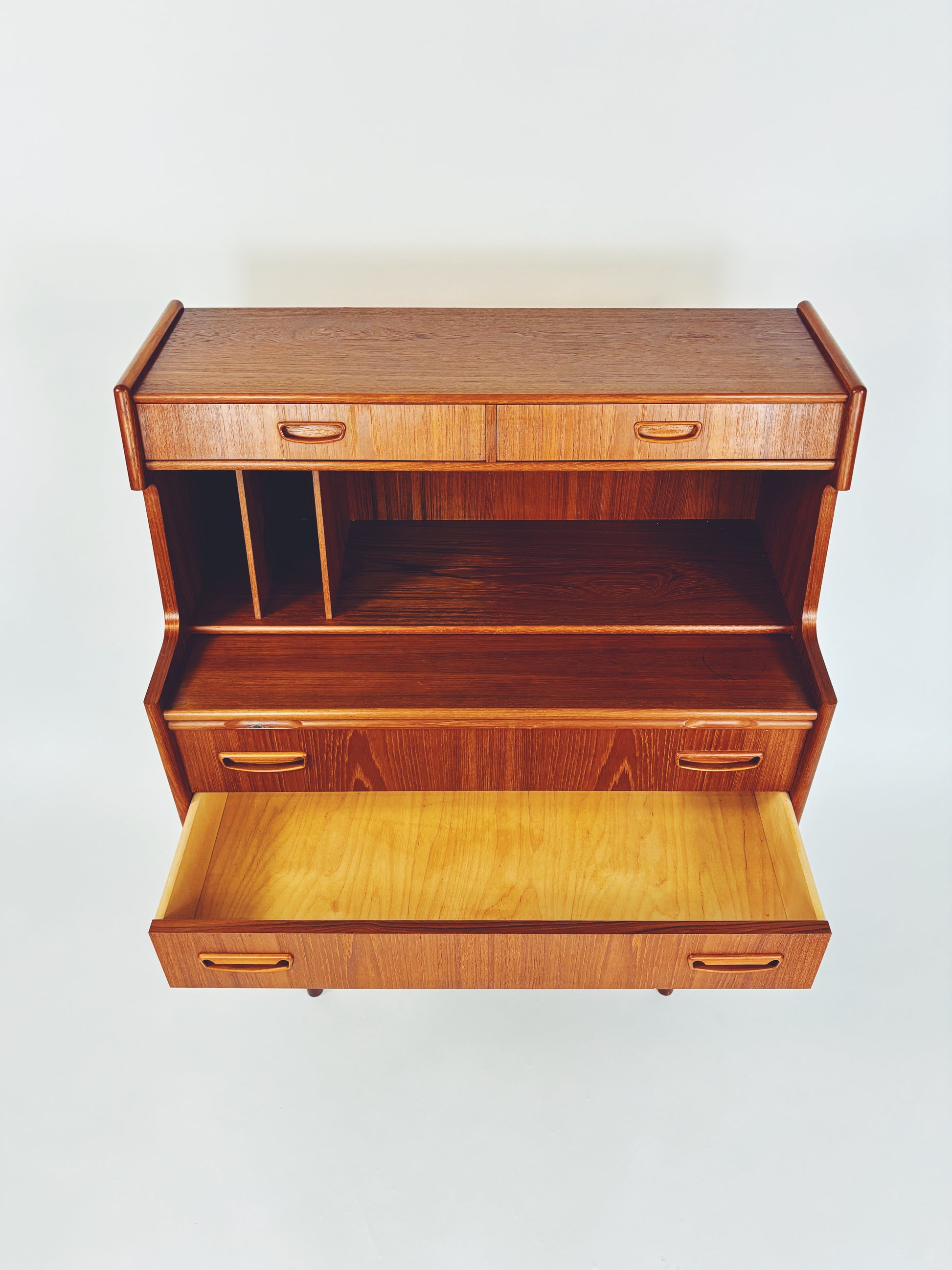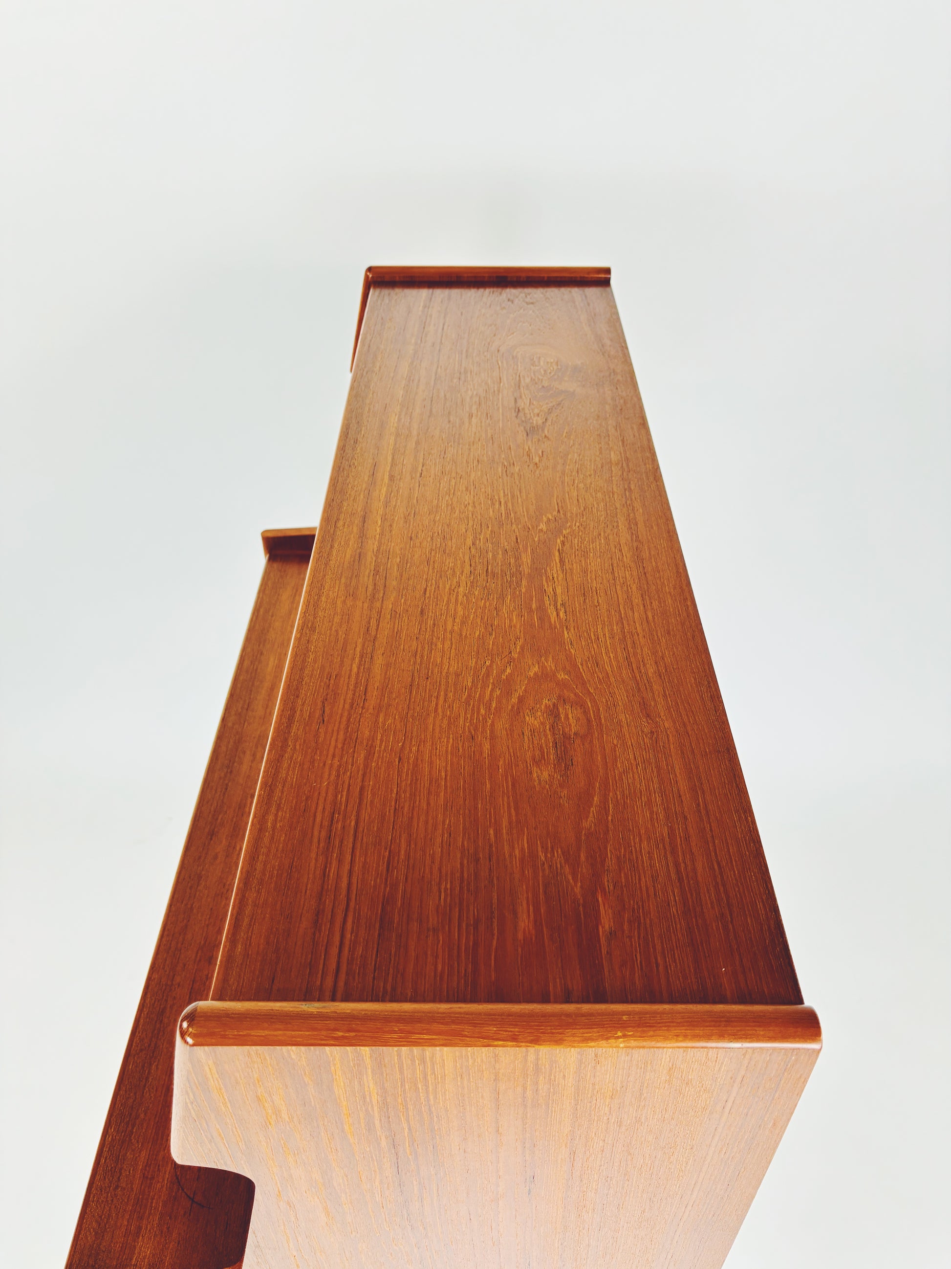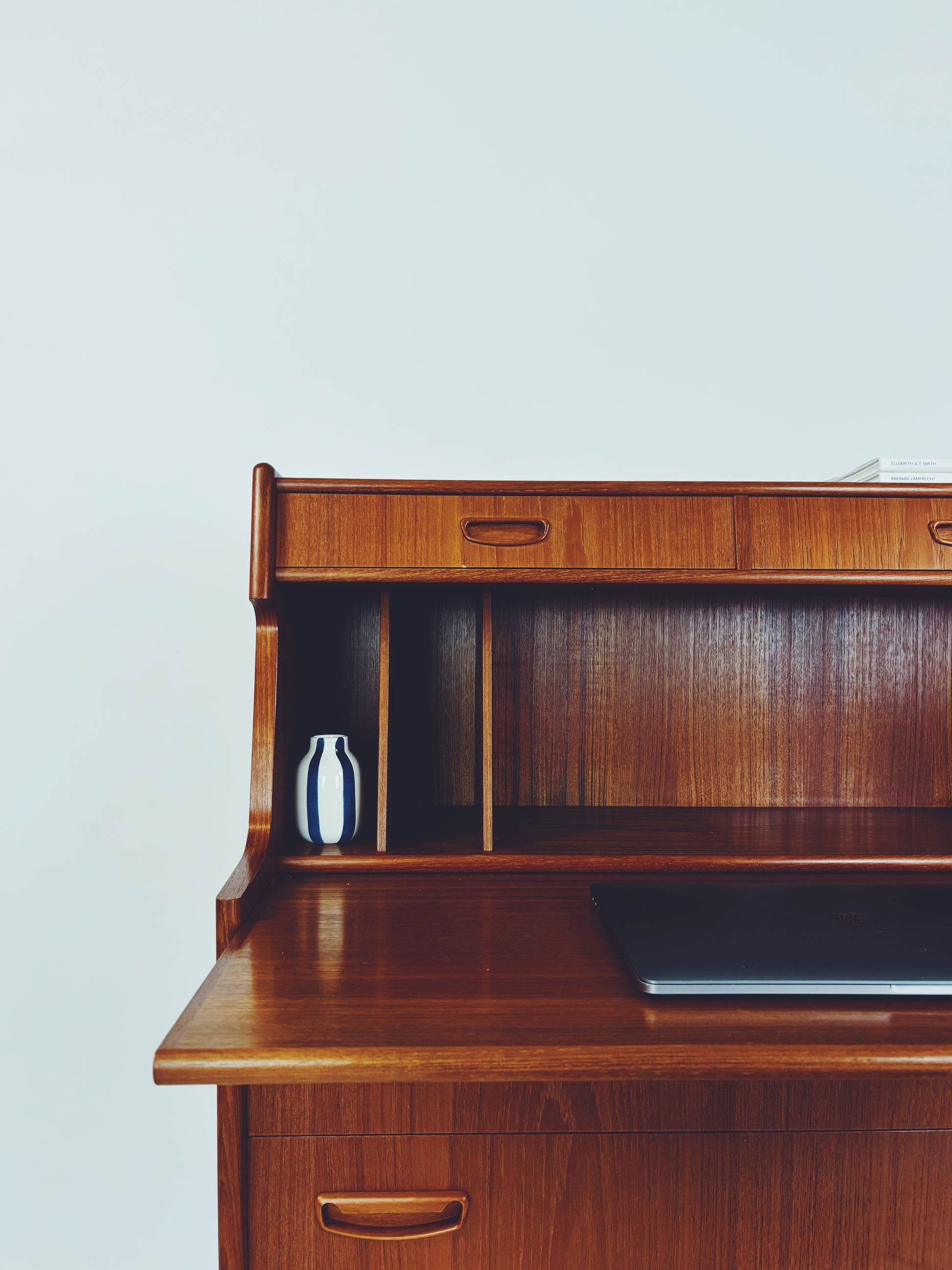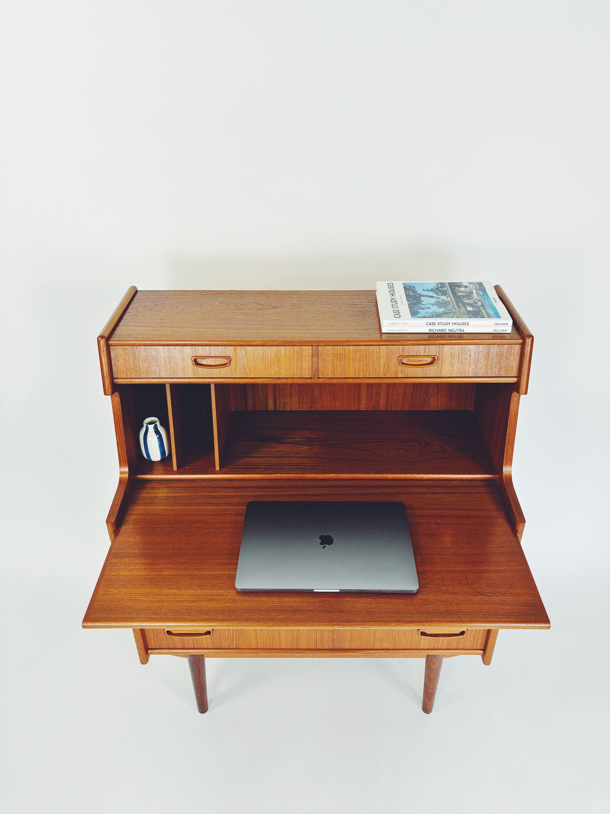 Das Schreibmöbel aus den 60er Jahren besteht aus wertigem Teakholz mit einer ausziehbaren Arbeitsfläche, die ausreichend Platz für ein 15" Laptop bietet. Sowohl die unteren, großen Schubladen, als auch die oberen, kleinen gleiten fein und schließen bündig.