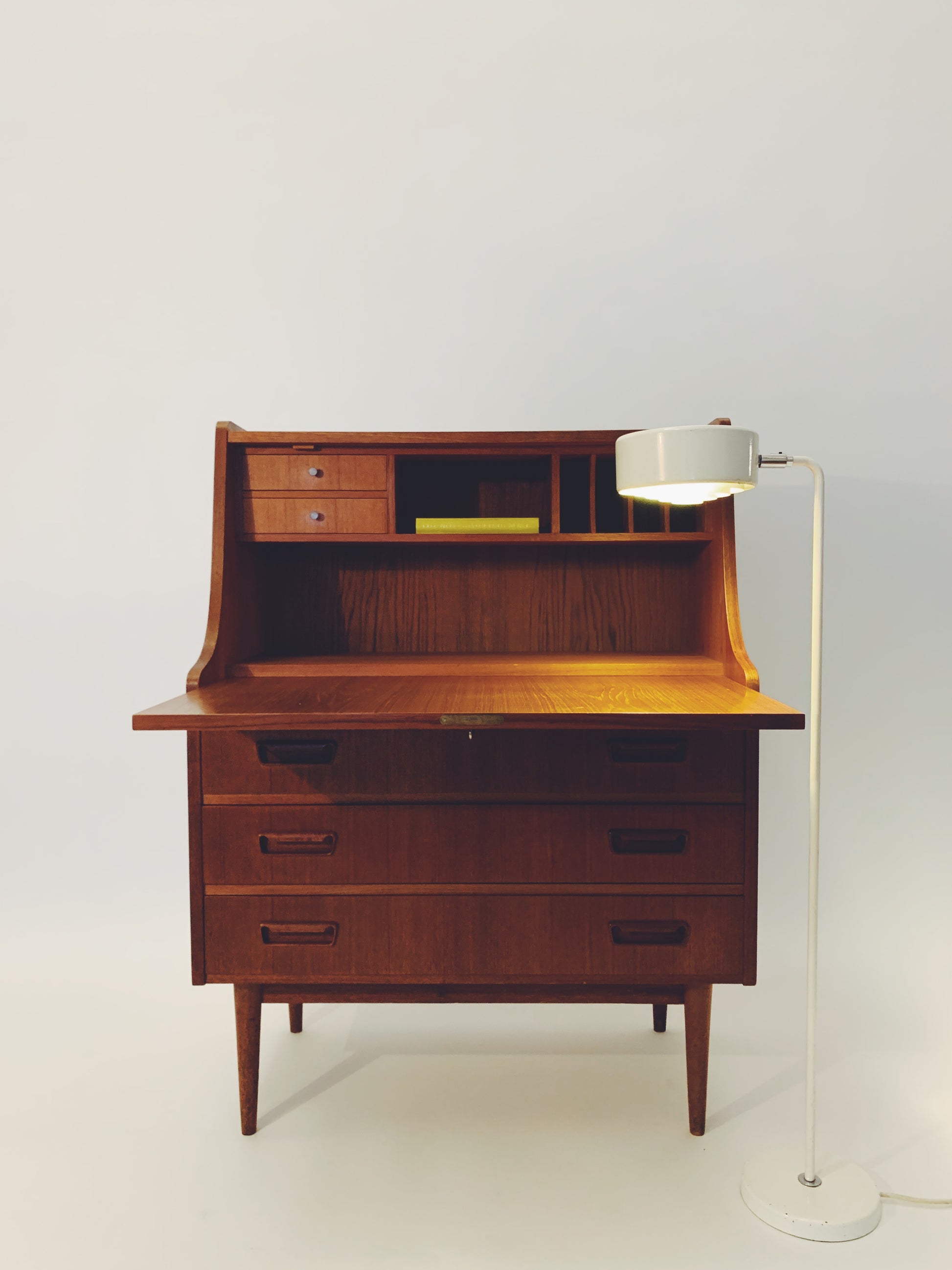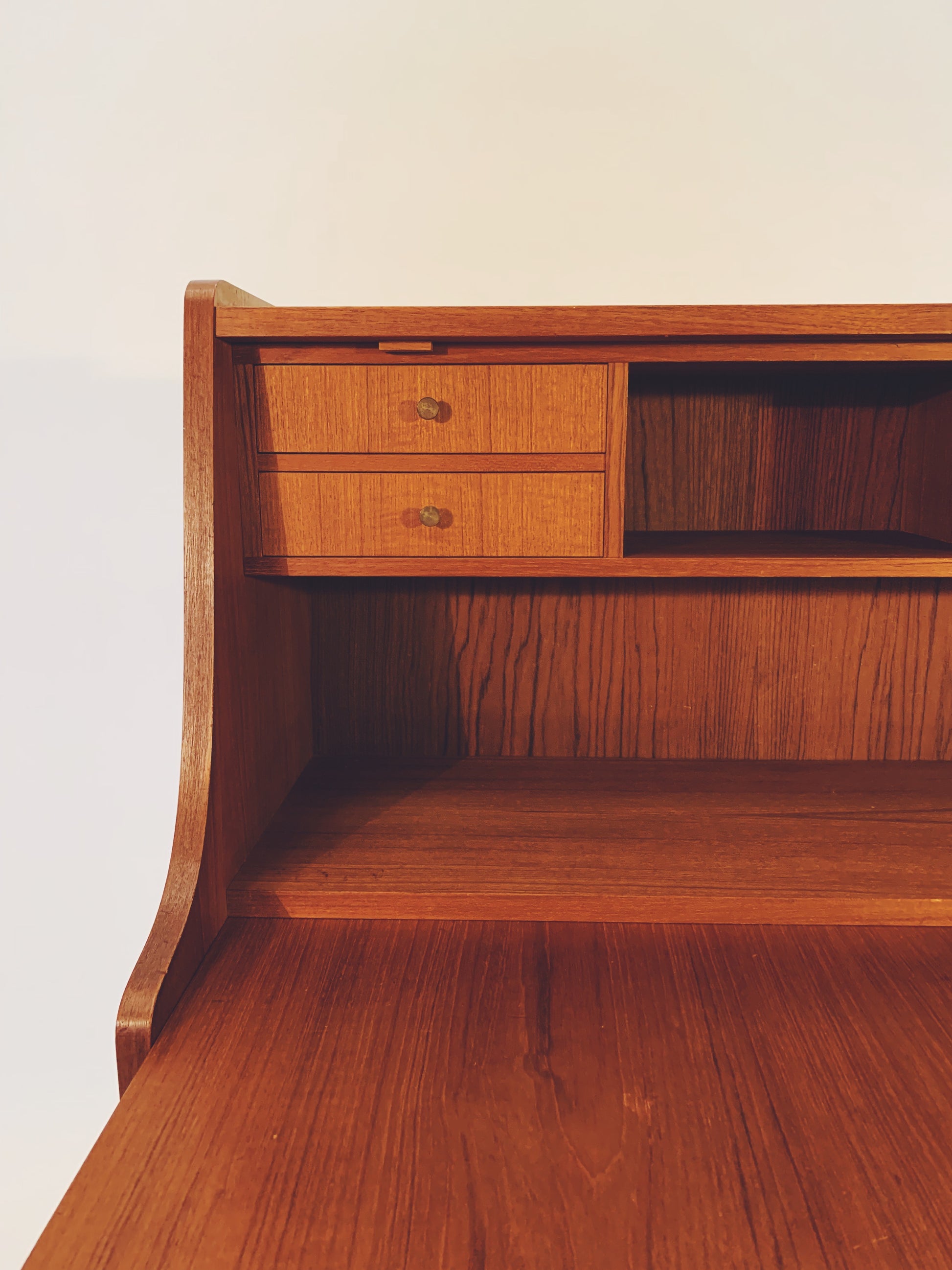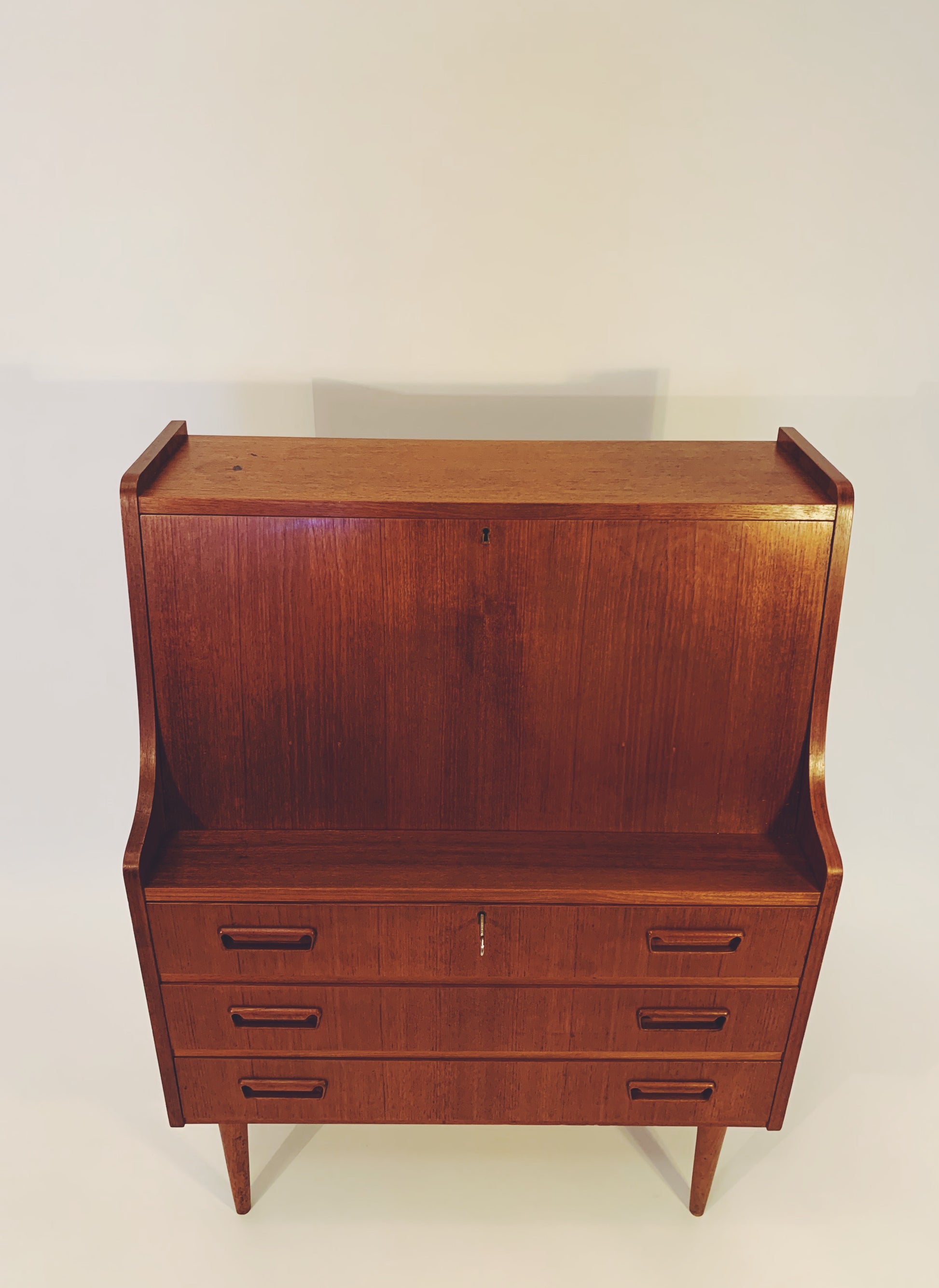 Das Schreibmöbel aus den 60er Jahren besteht aus wertigem Teakholz mit einer abschließbaren Klapptür (Originalschlüssel vorhanden). Die Arbeitsfläche bietet genug Platz für ein 15" Laptop. Die Türe schließt bündig und die drei Laden gleiten fein.