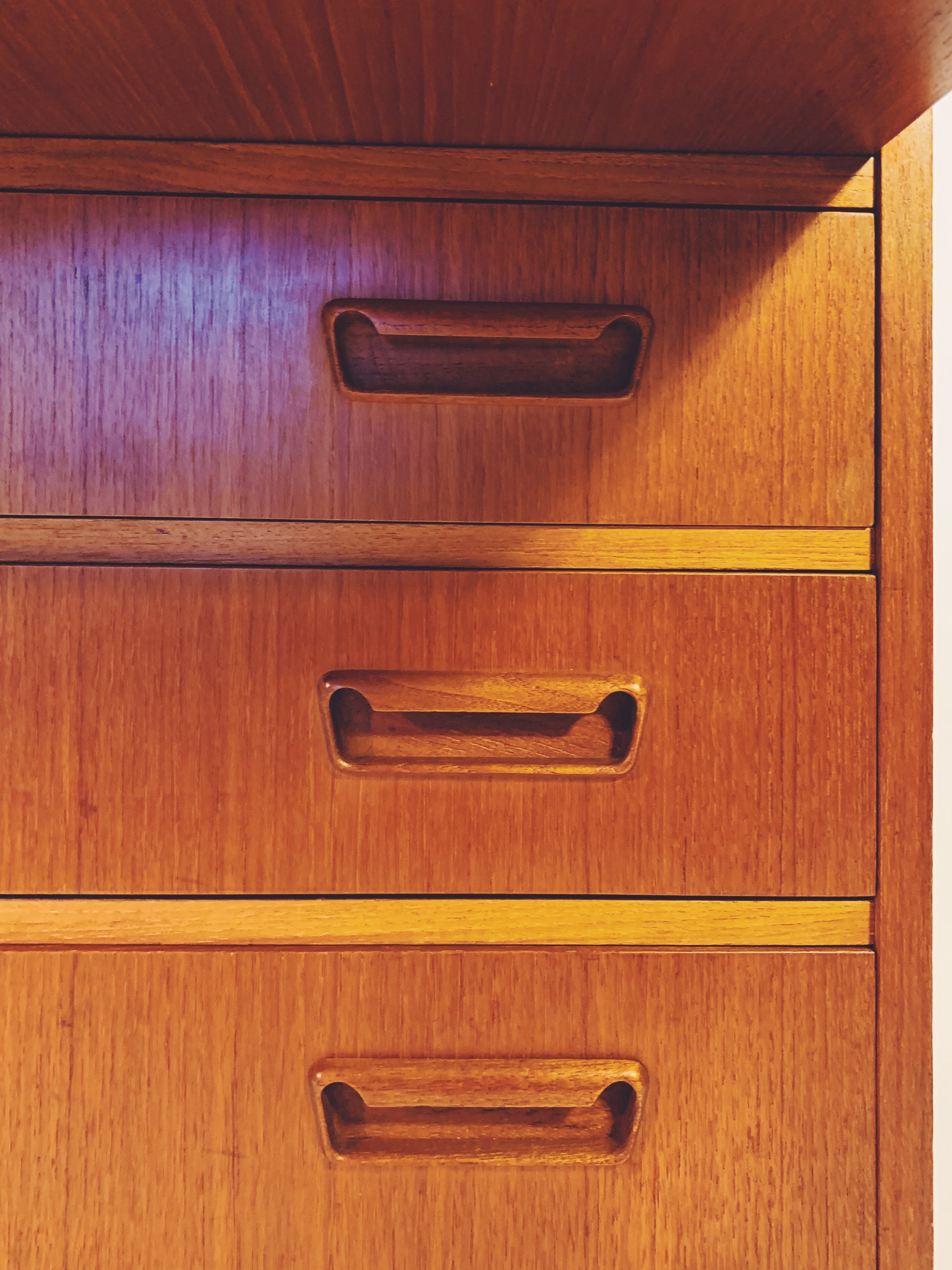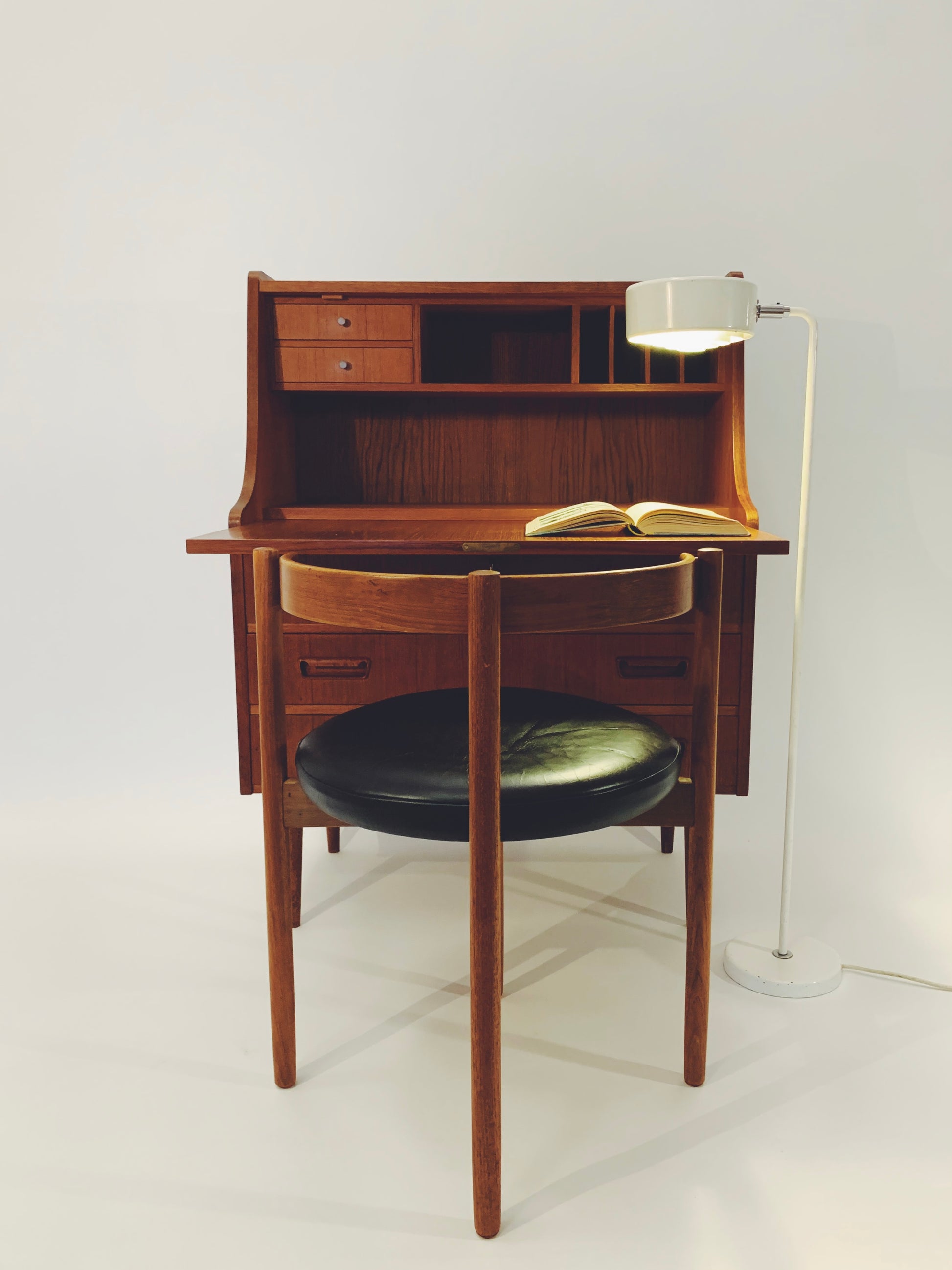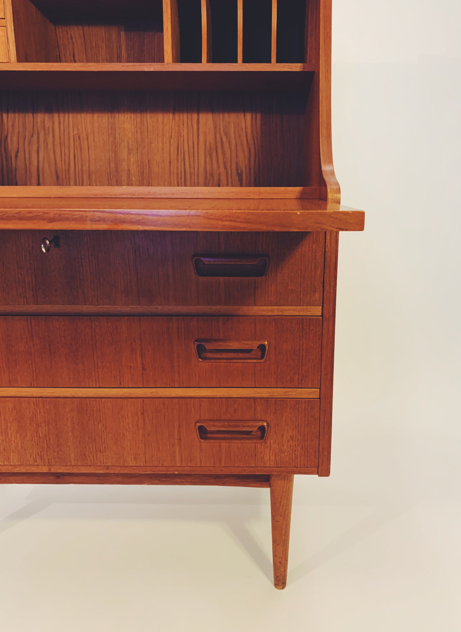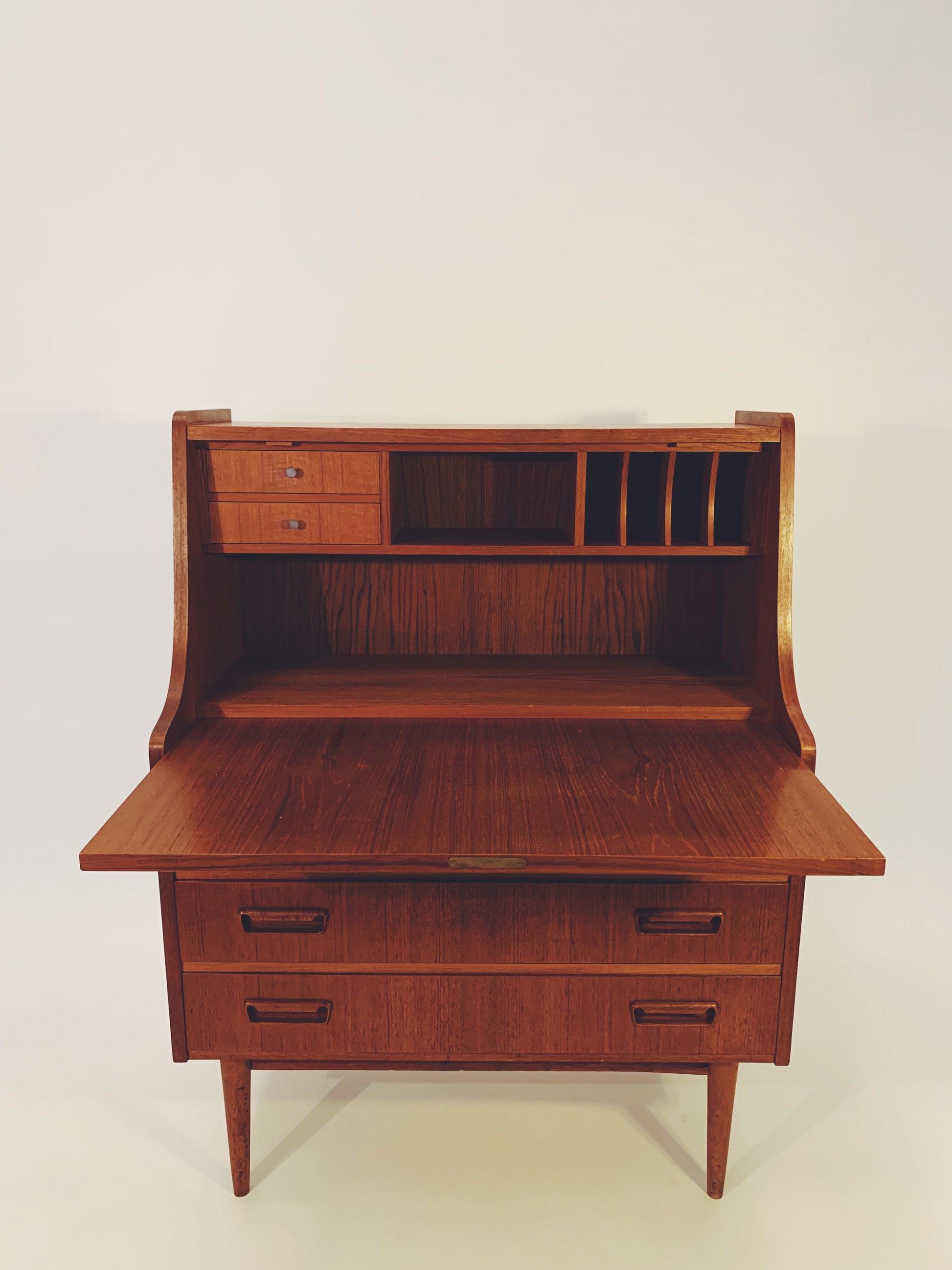 Das Schreibmöbel aus den 60er Jahren besteht aus wertigem Teakholz mit einer abschließbaren Klapptür (Originalschlüssel vorhanden). Die Arbeitsfläche bietet genug Platz für ein 15" Laptop. Die Türe schließt bündig und die drei Laden gleiten fein.