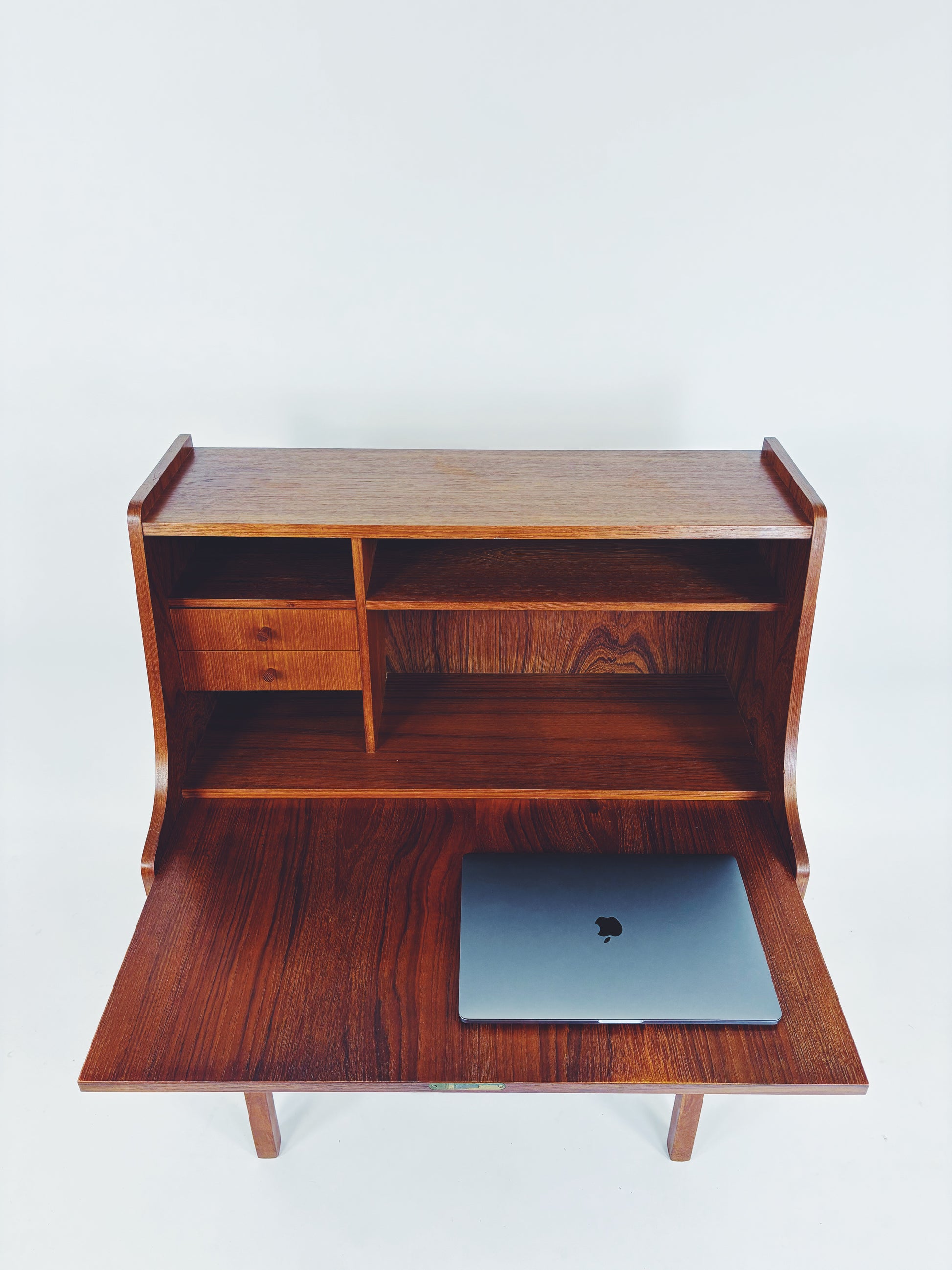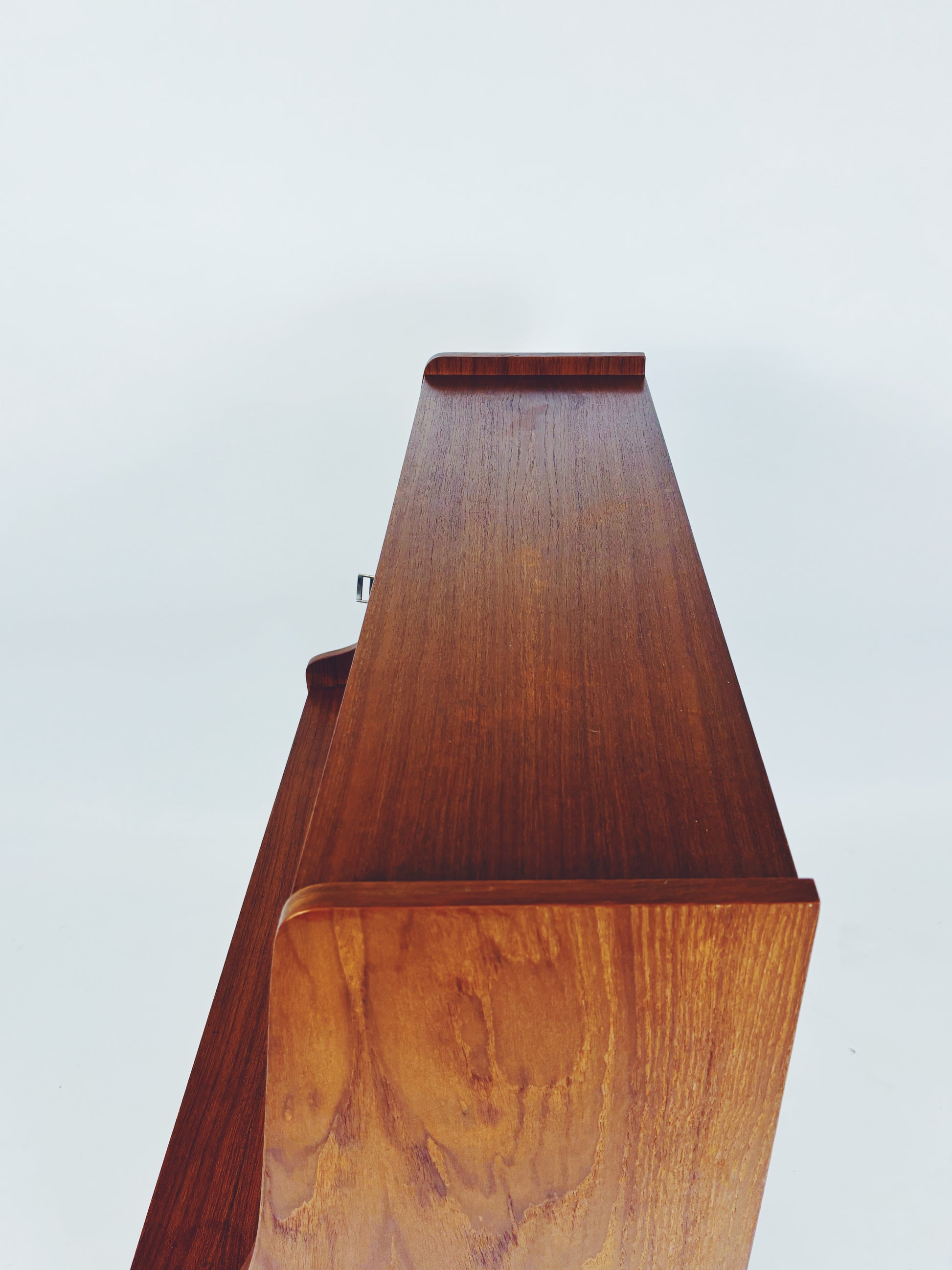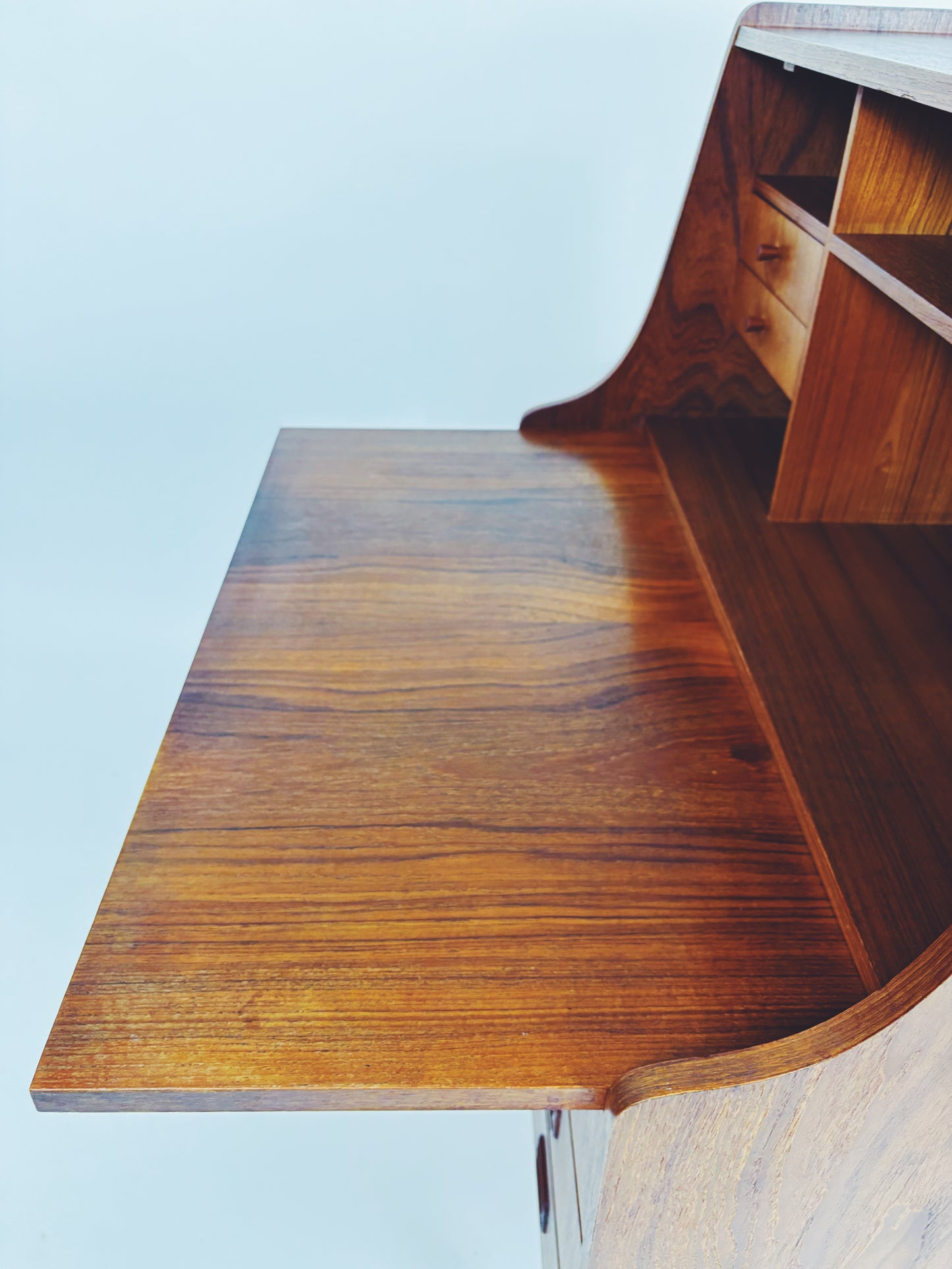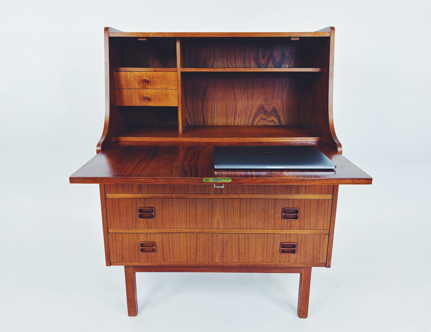 Das Schreibmöbel aus den 60er Jahren besteht aus wertigem Teakholz mit einer abschließbaren Klapptür (Originalschlüssel vorhanden). Die Arbeitsfläche bietet genug Platz für ein 15" Laptop. Die Türe schließt bündig und die drei Laden gleiten fein.