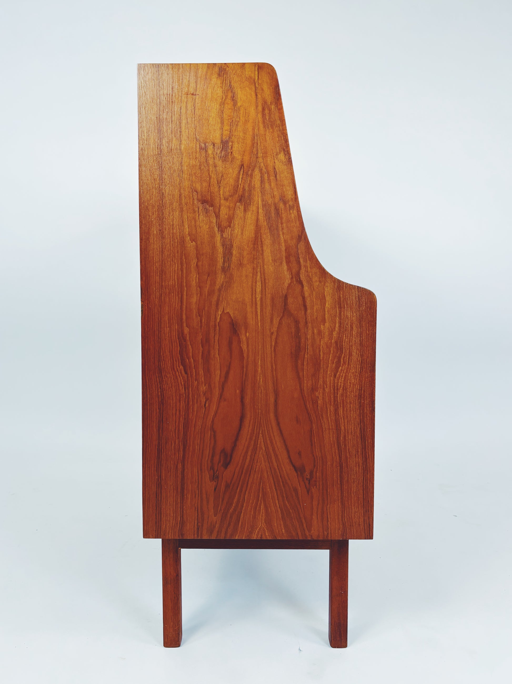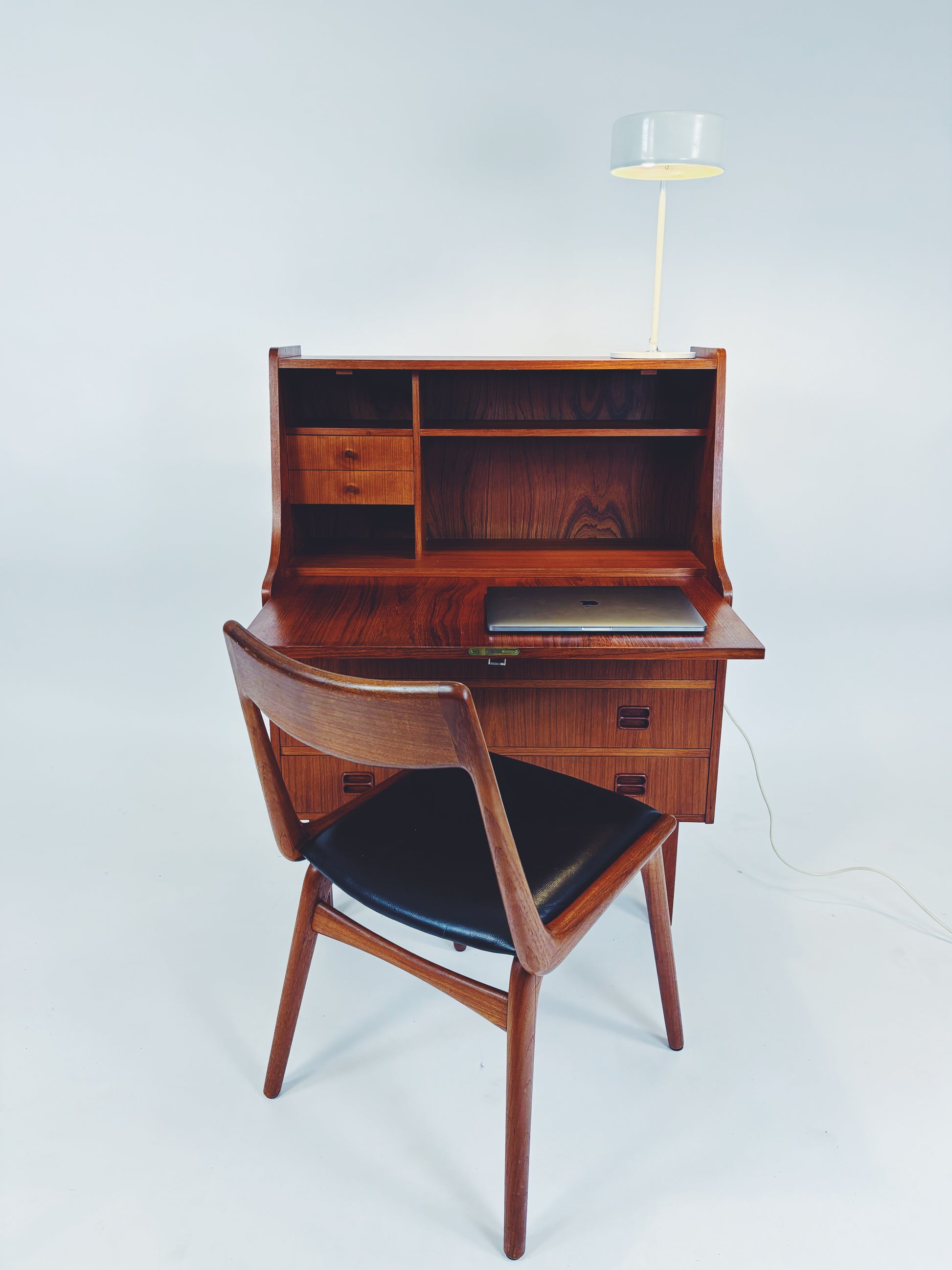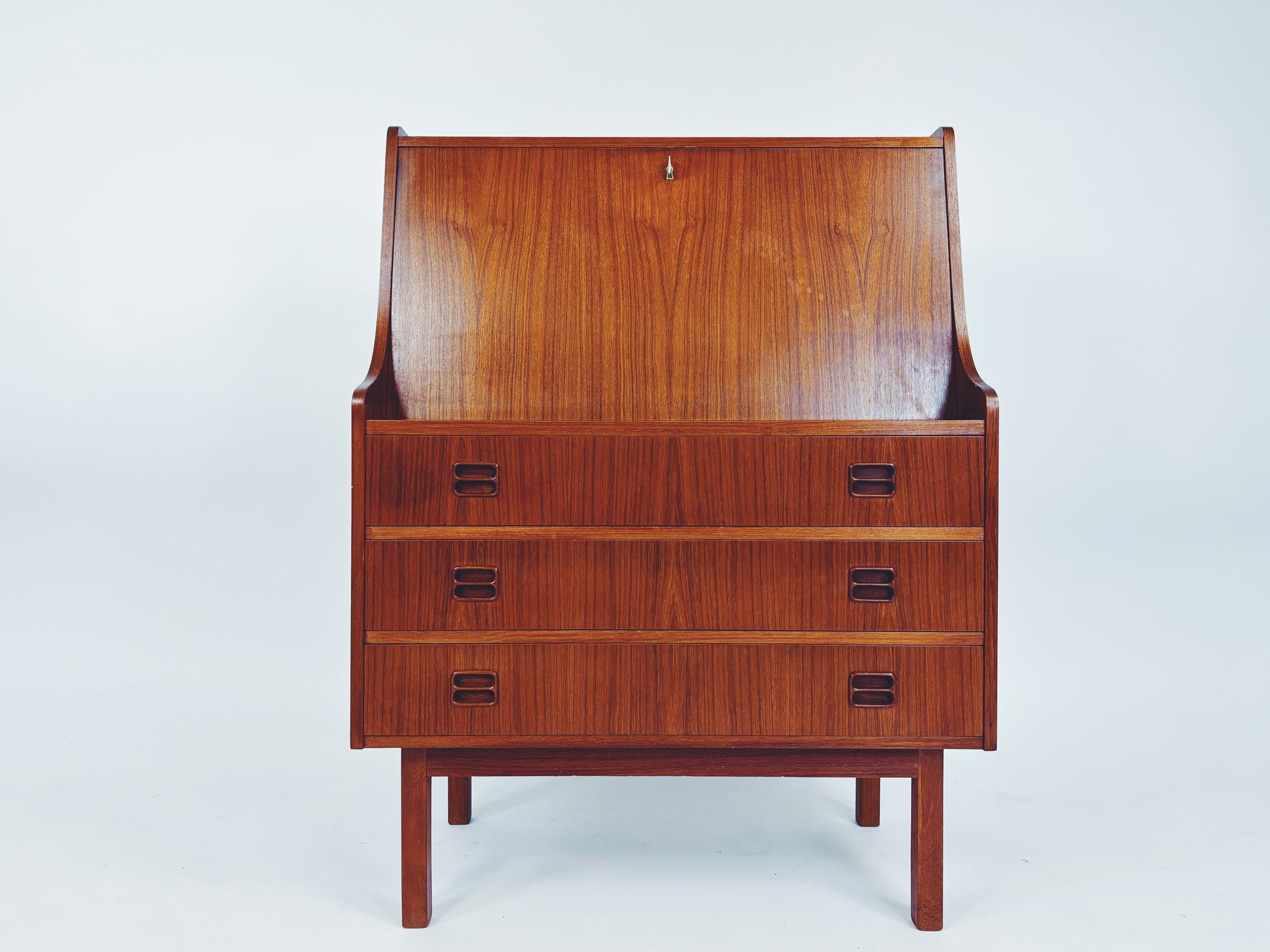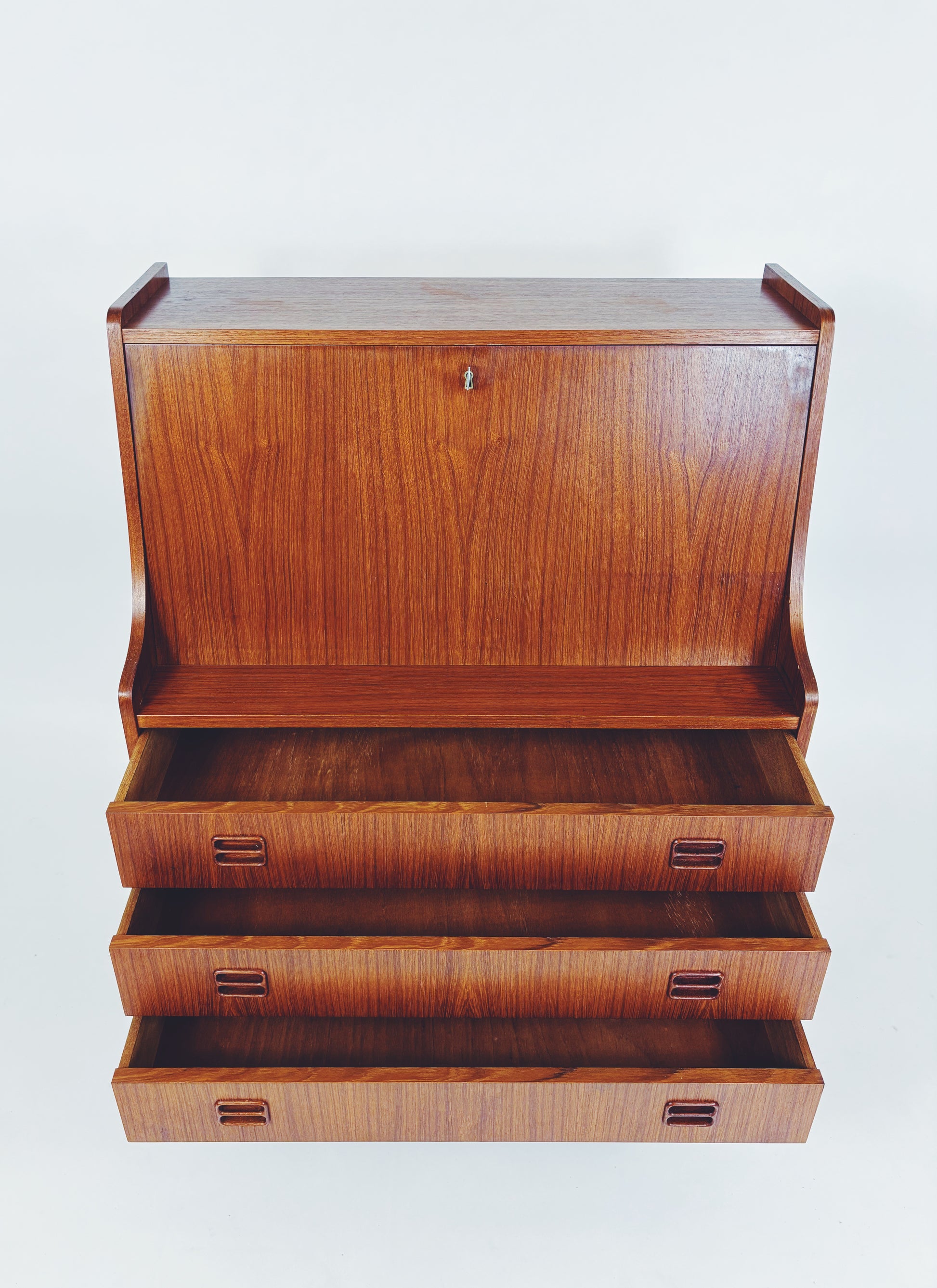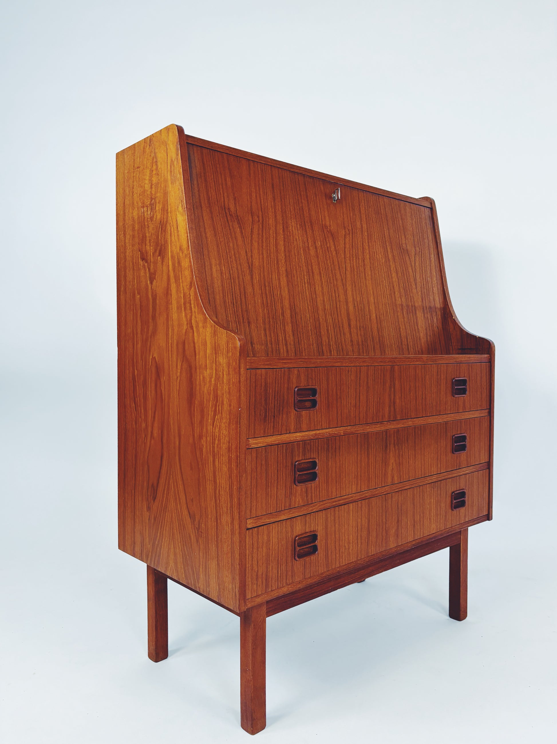 Das Schreibmöbel aus den 60er Jahren besteht aus wertigem Teakholz mit einer abschließbaren Klapptür (Originalschlüssel vorhanden). Die Arbeitsfläche bietet genug Platz für ein 15" Laptop. Die Türe schließt bündig und die drei Laden gleiten fein.