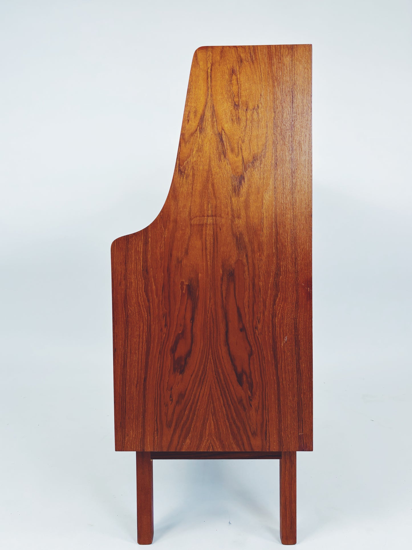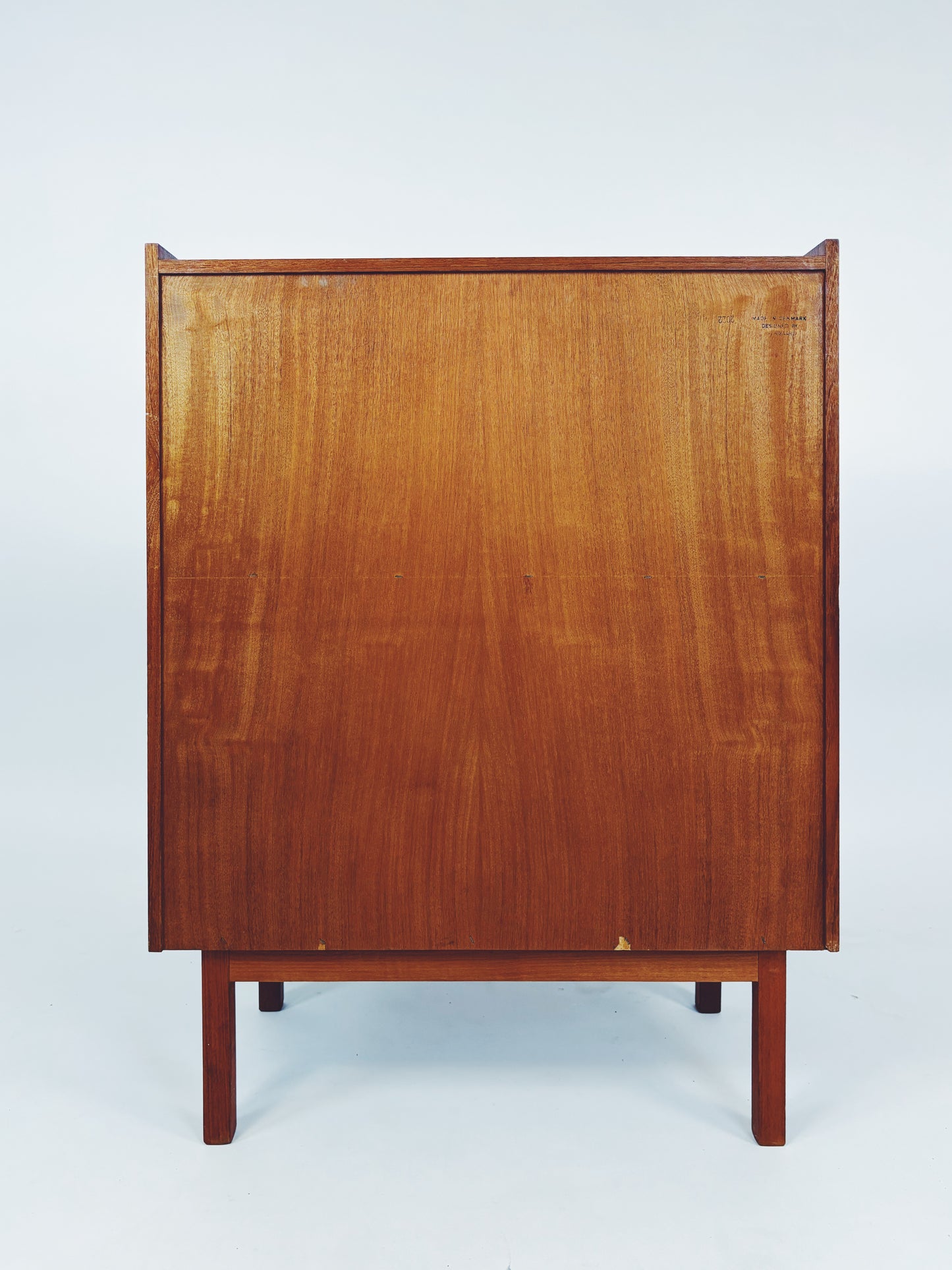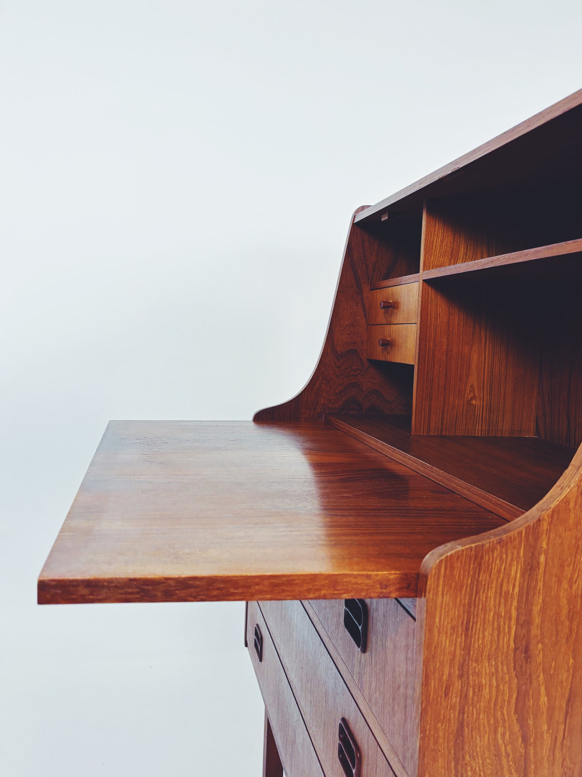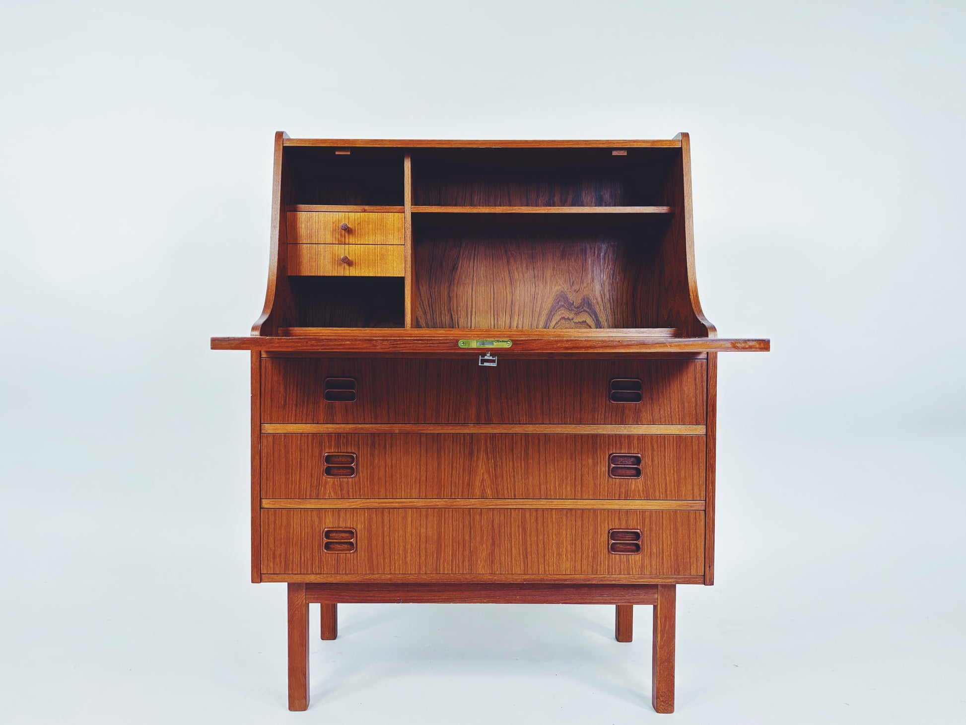 Das Schreibmöbel aus den 60er Jahren besteht aus wertigem Teakholz mit einer abschließbaren Klapptür (Originalschlüssel vorhanden). Die Arbeitsfläche bietet genug Platz für ein 15" Laptop. Die Türe schließt bündig und die drei Laden gleiten fein.
