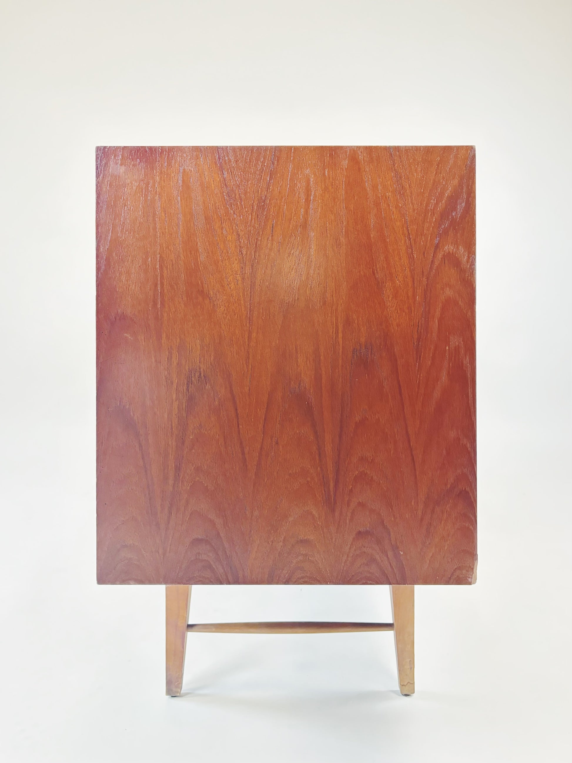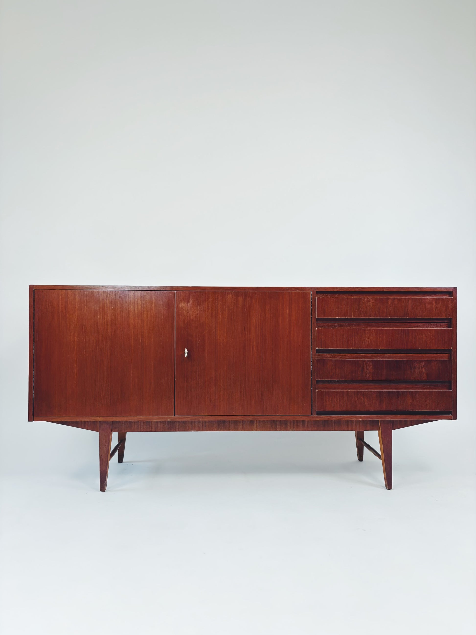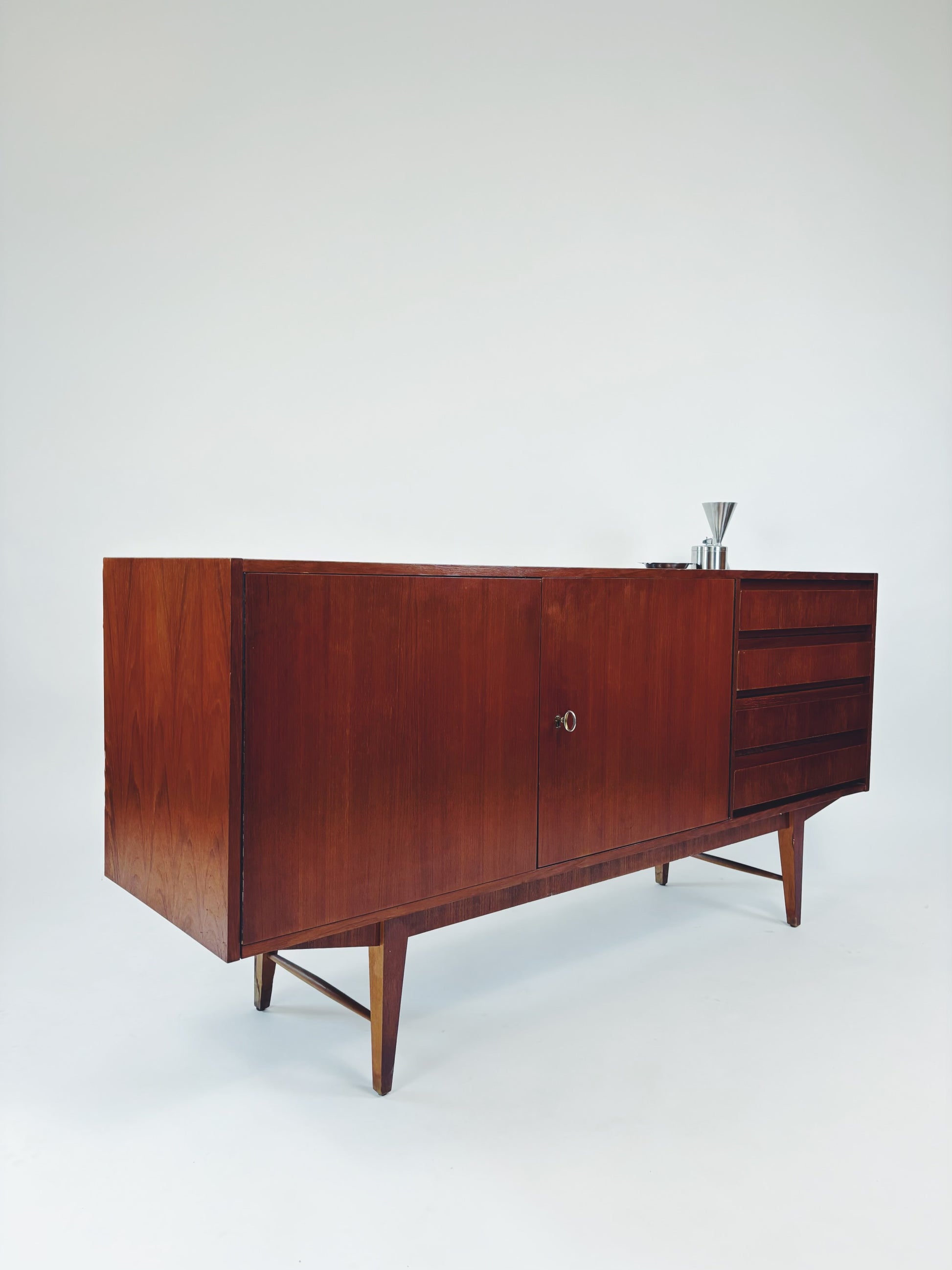 Das Sideboard aus Teakholz verfügt über zwei abschließbare Türen und 4 Schubladen.