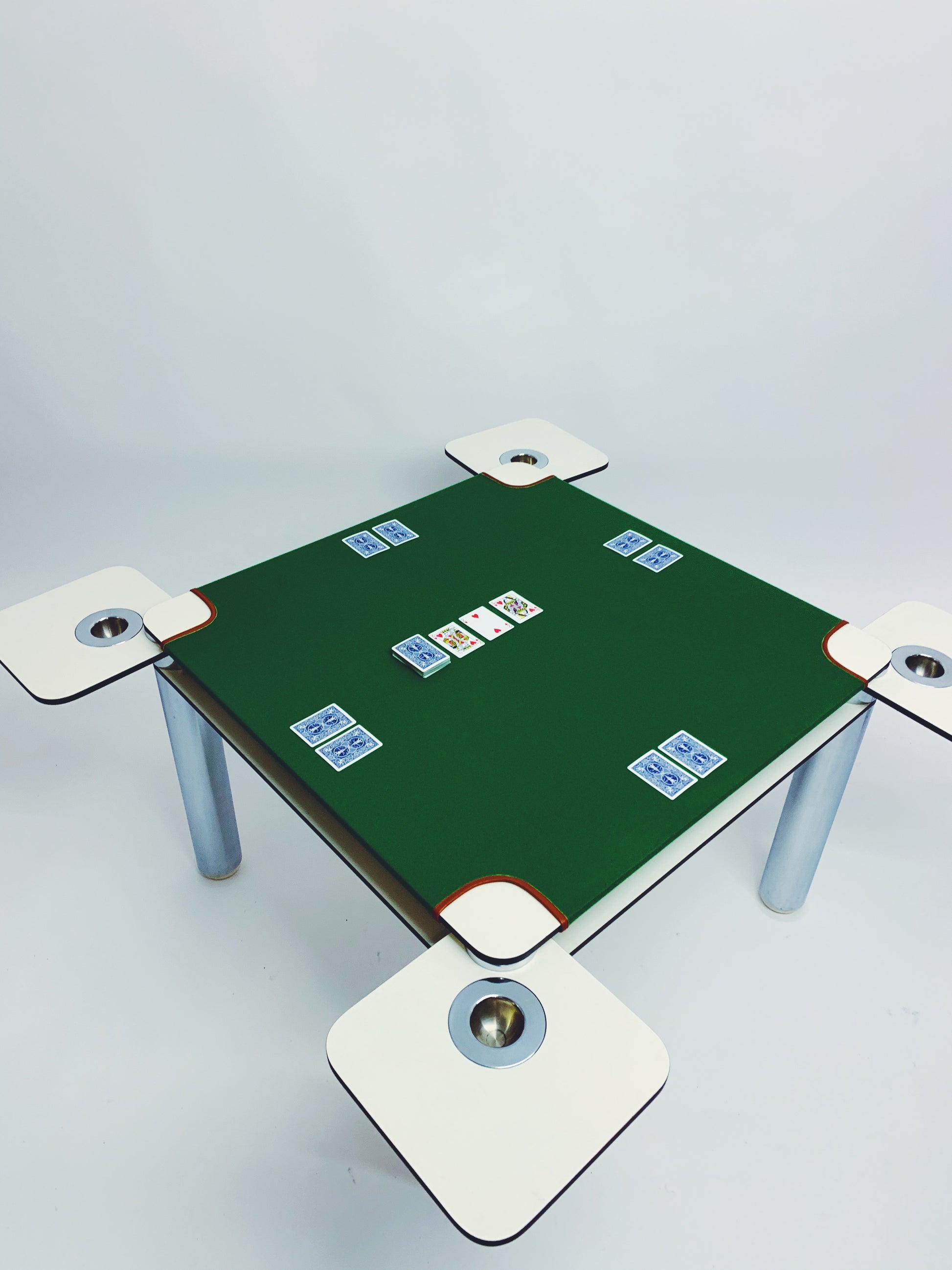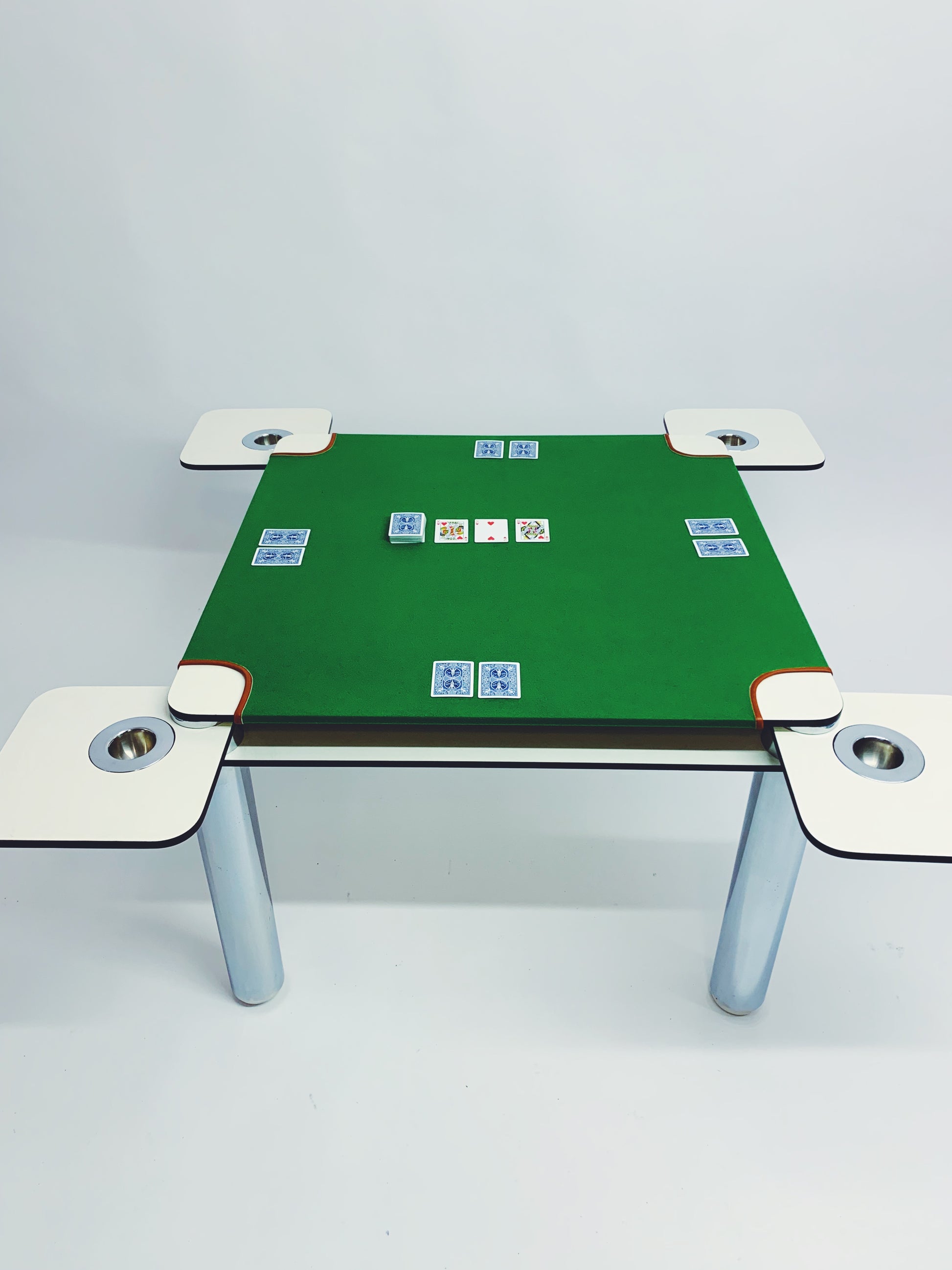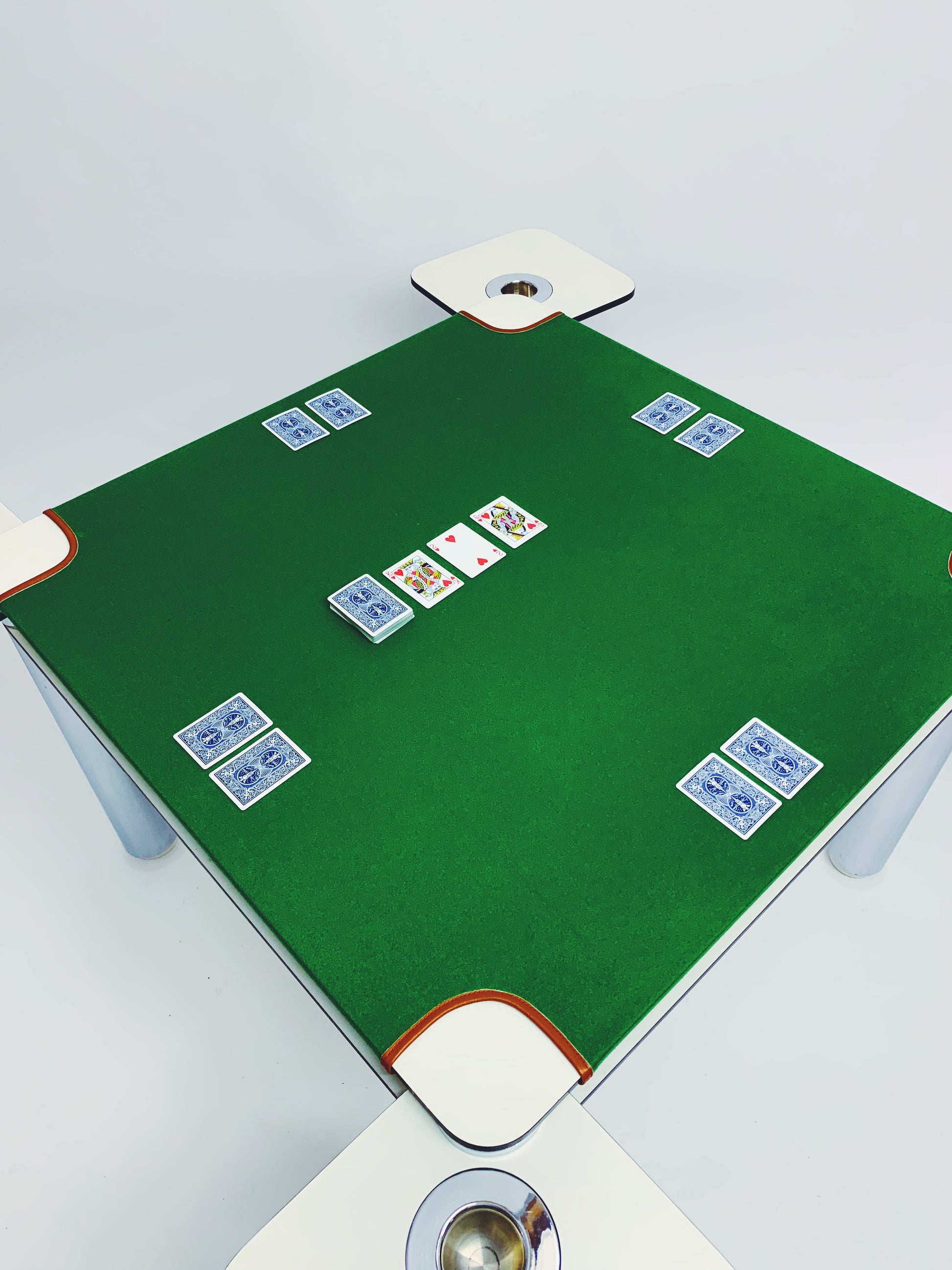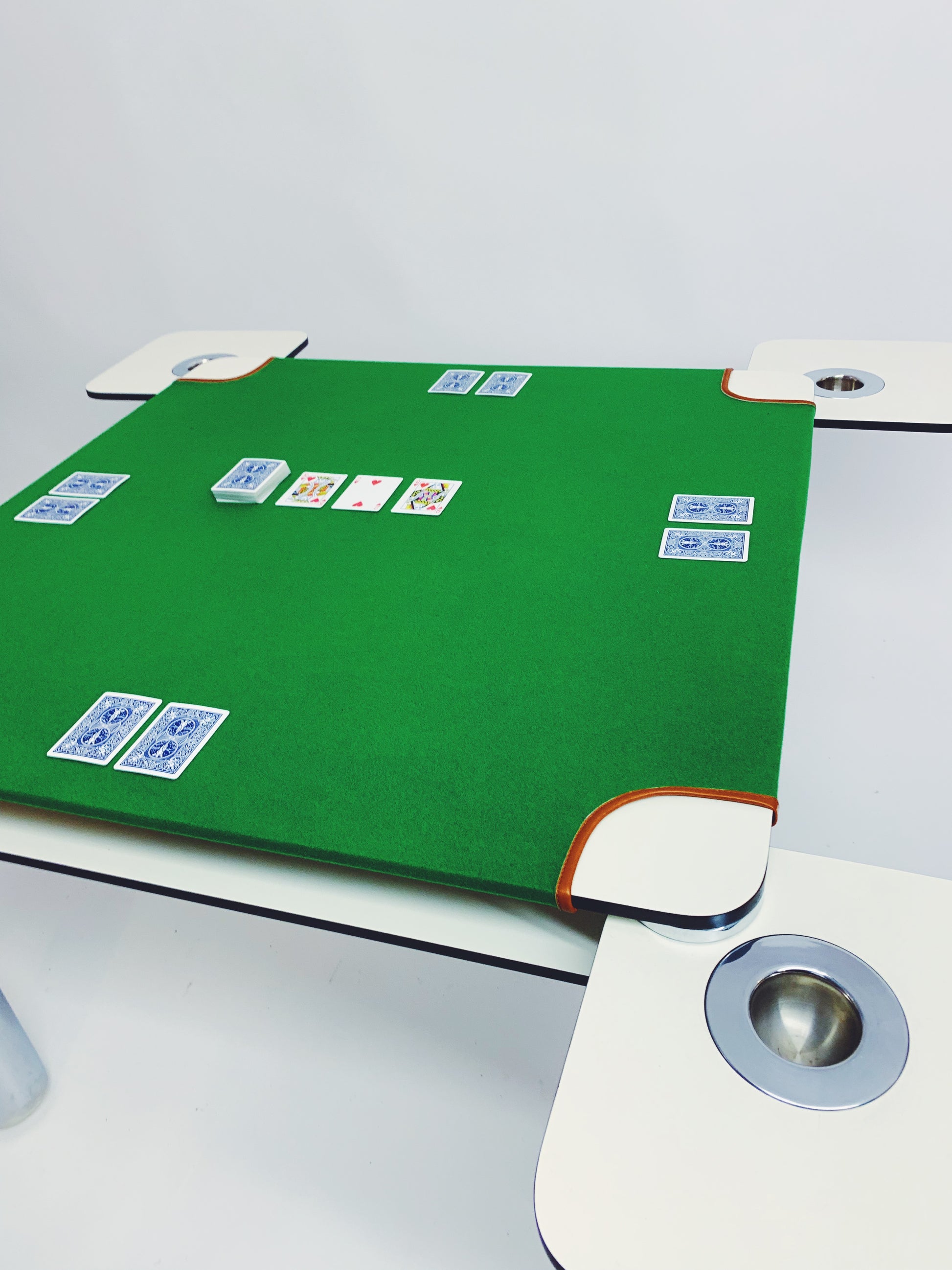 Der Pokertisch von Joe Colombo ist ein zeitloses Meisterwerk des italienischen Designs (erster Entwurf 1966). Der Spieltisch besteht aus zwei Tischplatten aus hochwertigem Kunststofflaminat. Die obere Tischplatte kann mit einem grünen Filztuch mit braunem Lederrand bezogen werden.