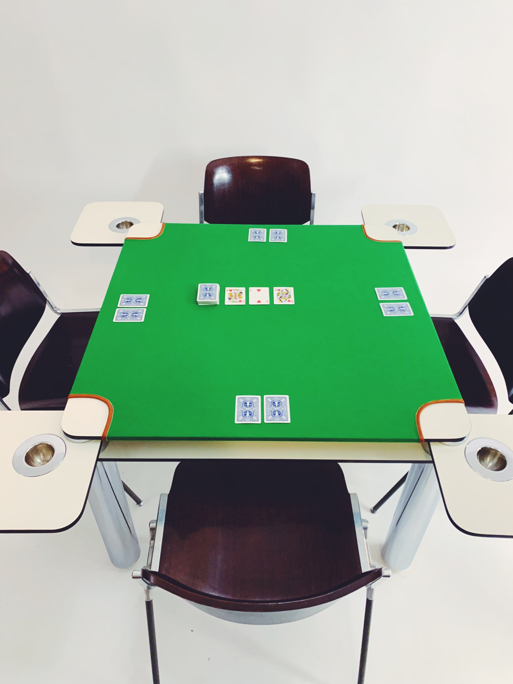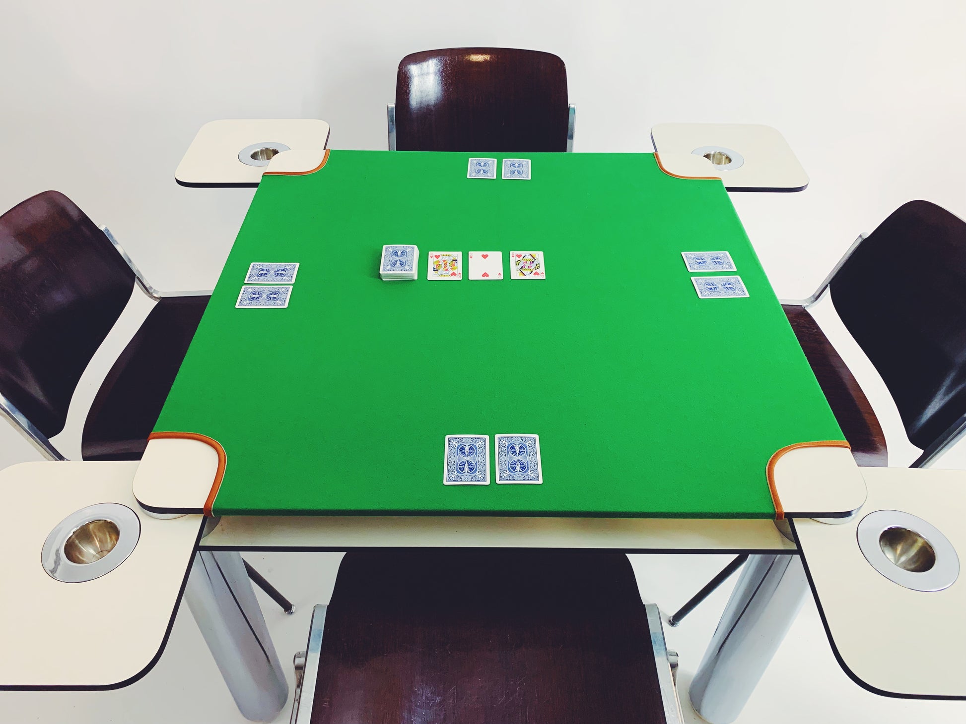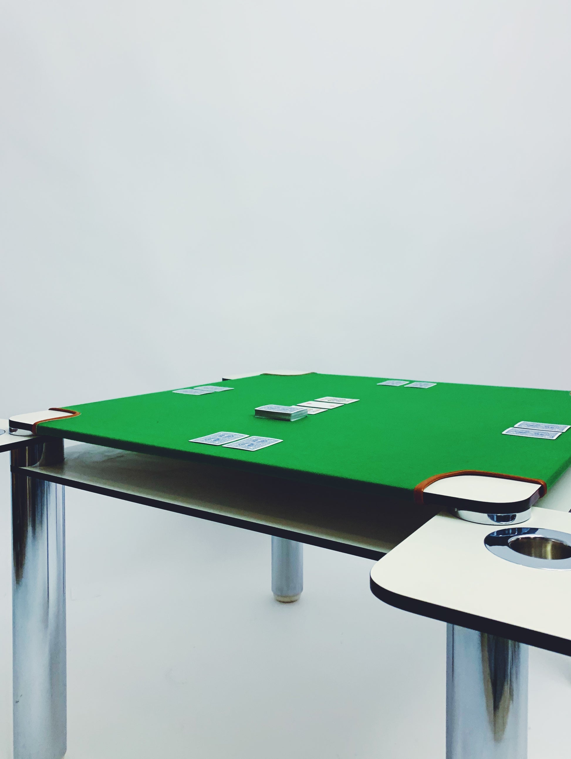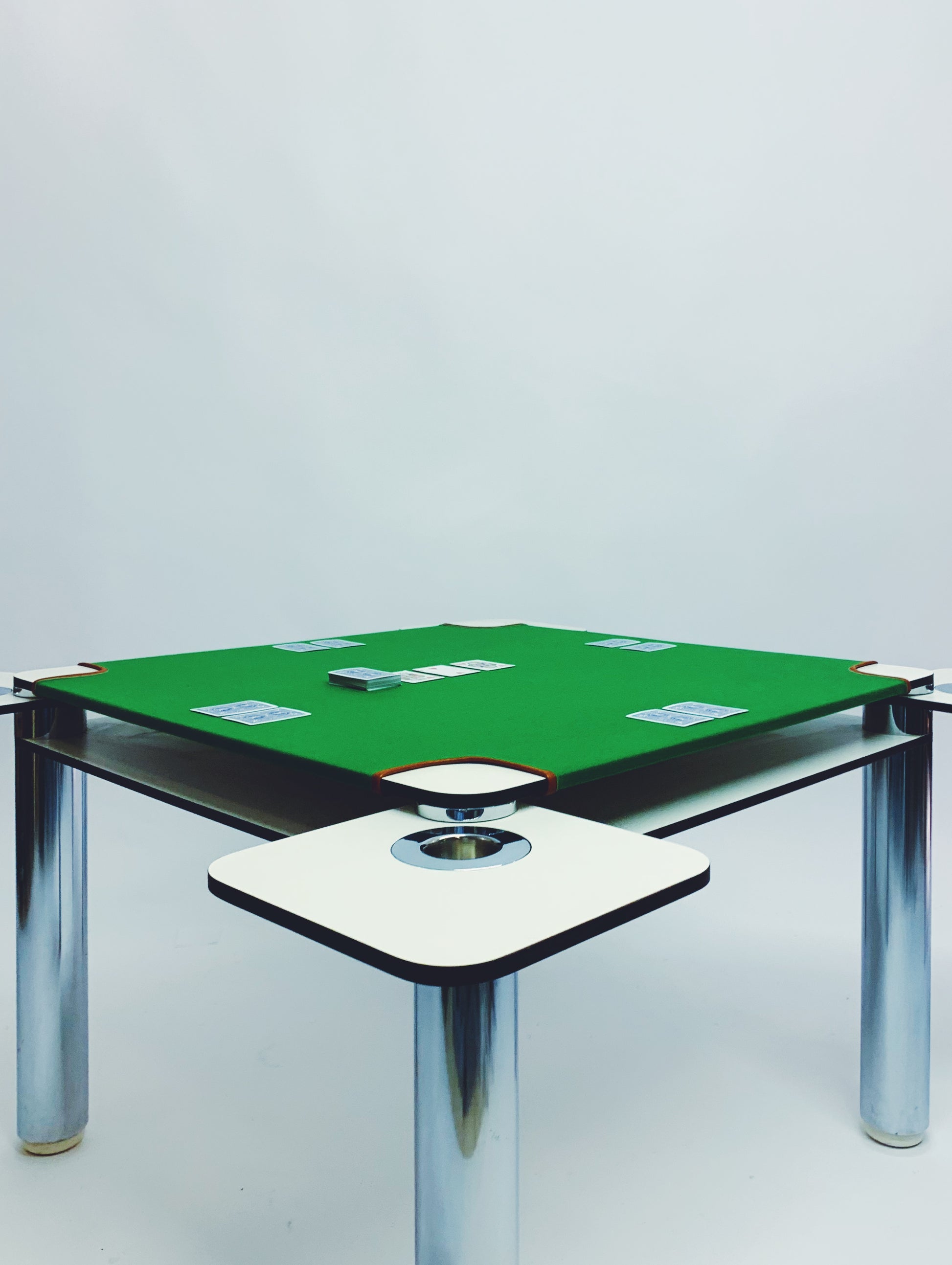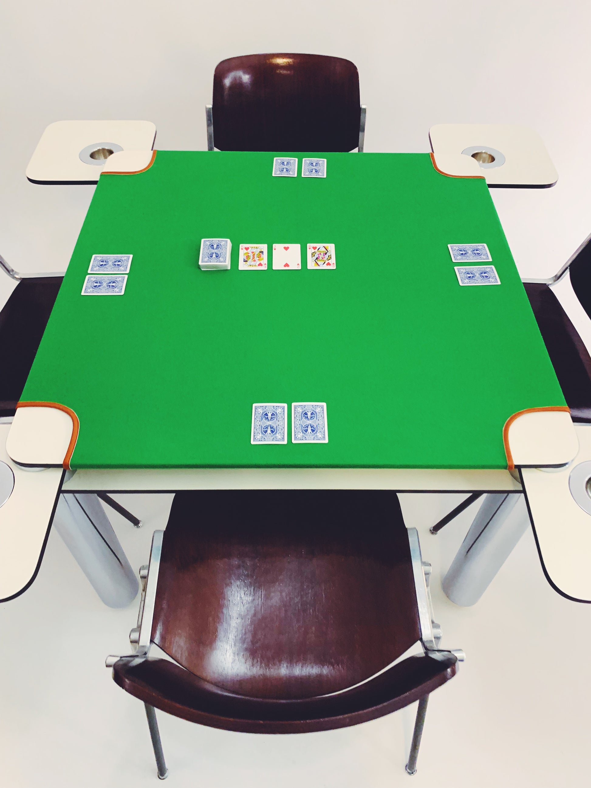 Der Pokertisch von Joe Colombo ist ein zeitloses Meisterwerk des italienischen Designs (erster Entwurf 1966). Der Spieltisch besteht aus zwei Tischplatten aus hochwertigem Kunststofflaminat. Die obere Tischplatte kann mit einem grünen Filztuch mit braunem Lederrand bezogen werden.
