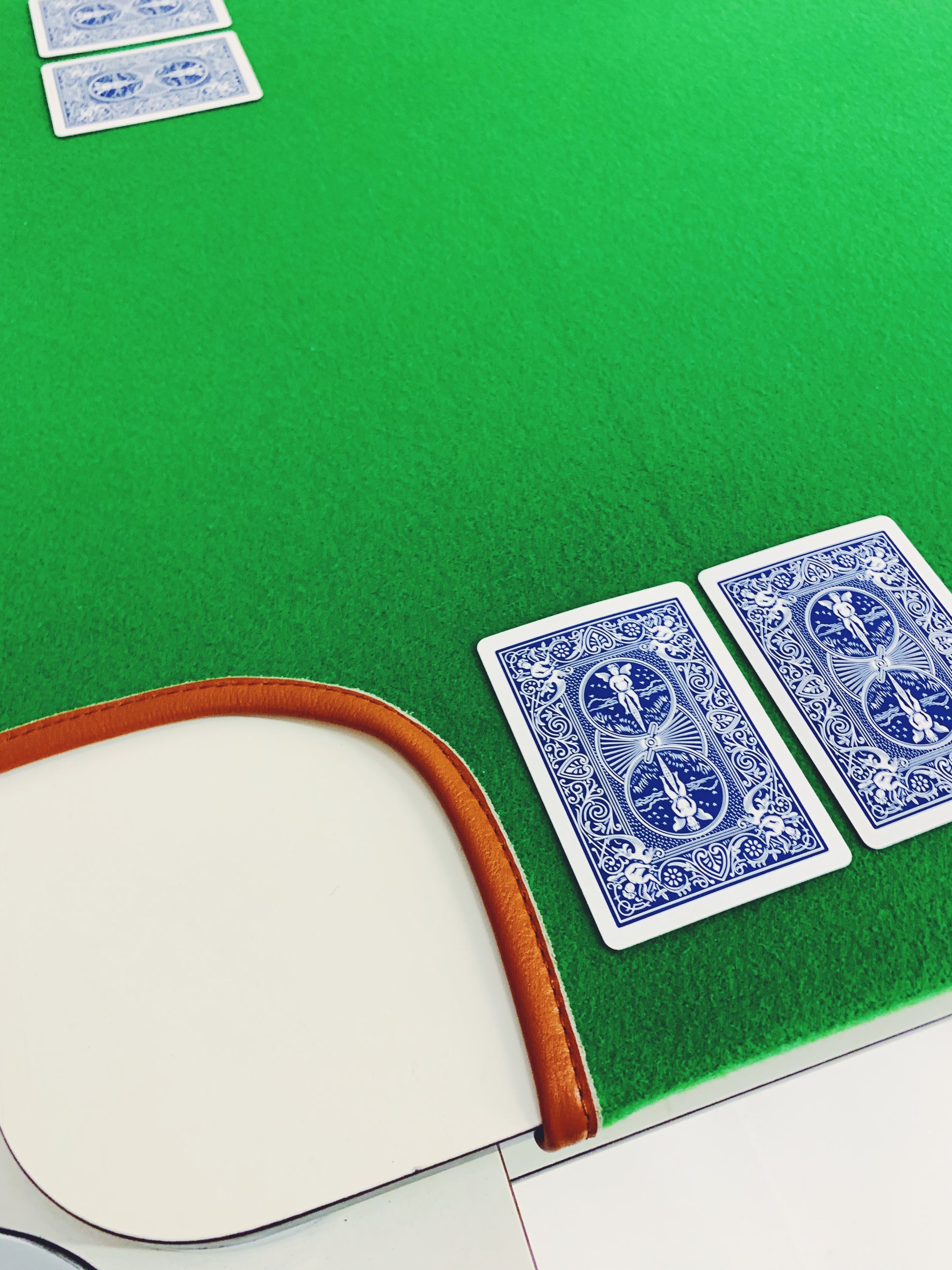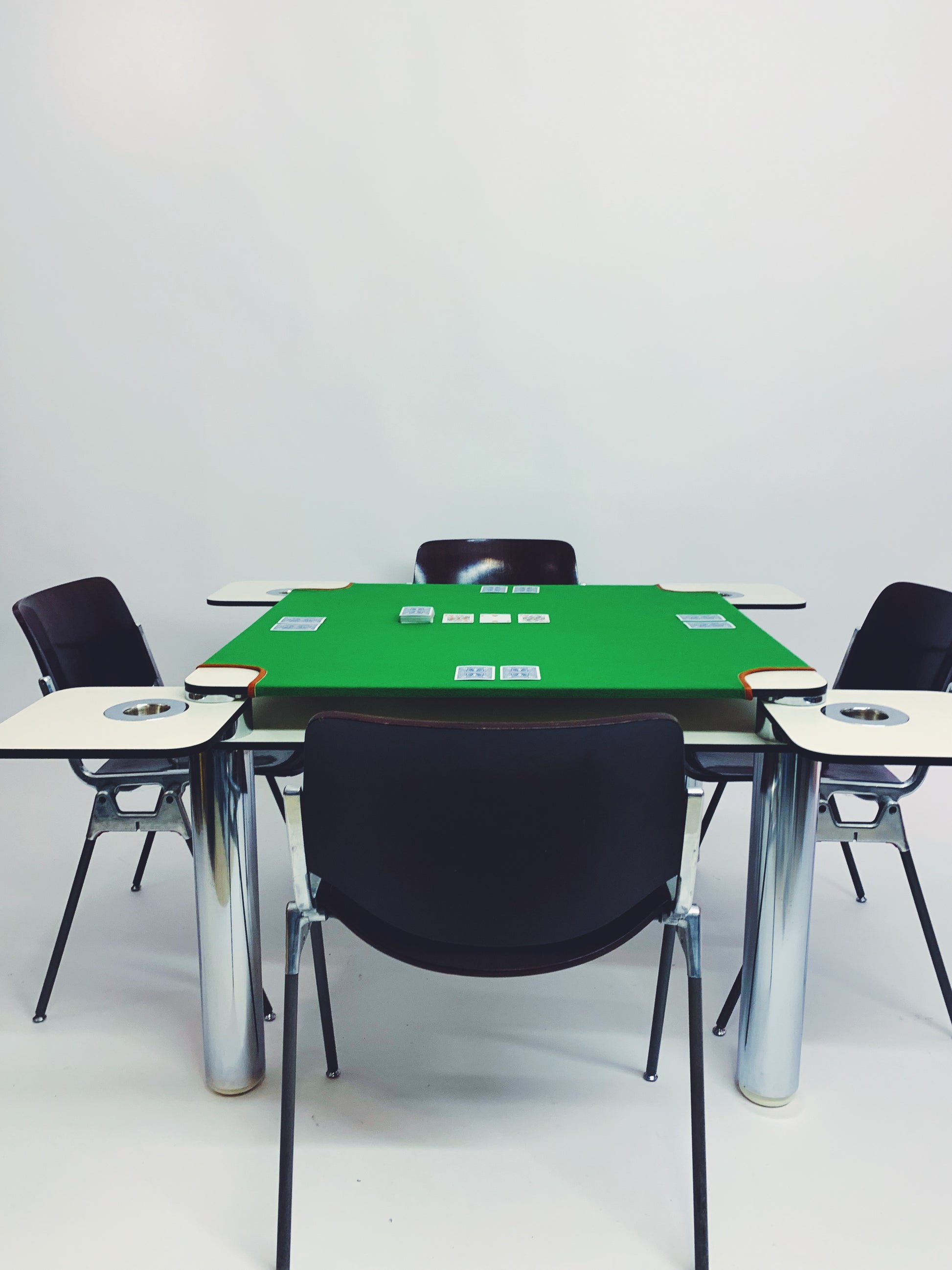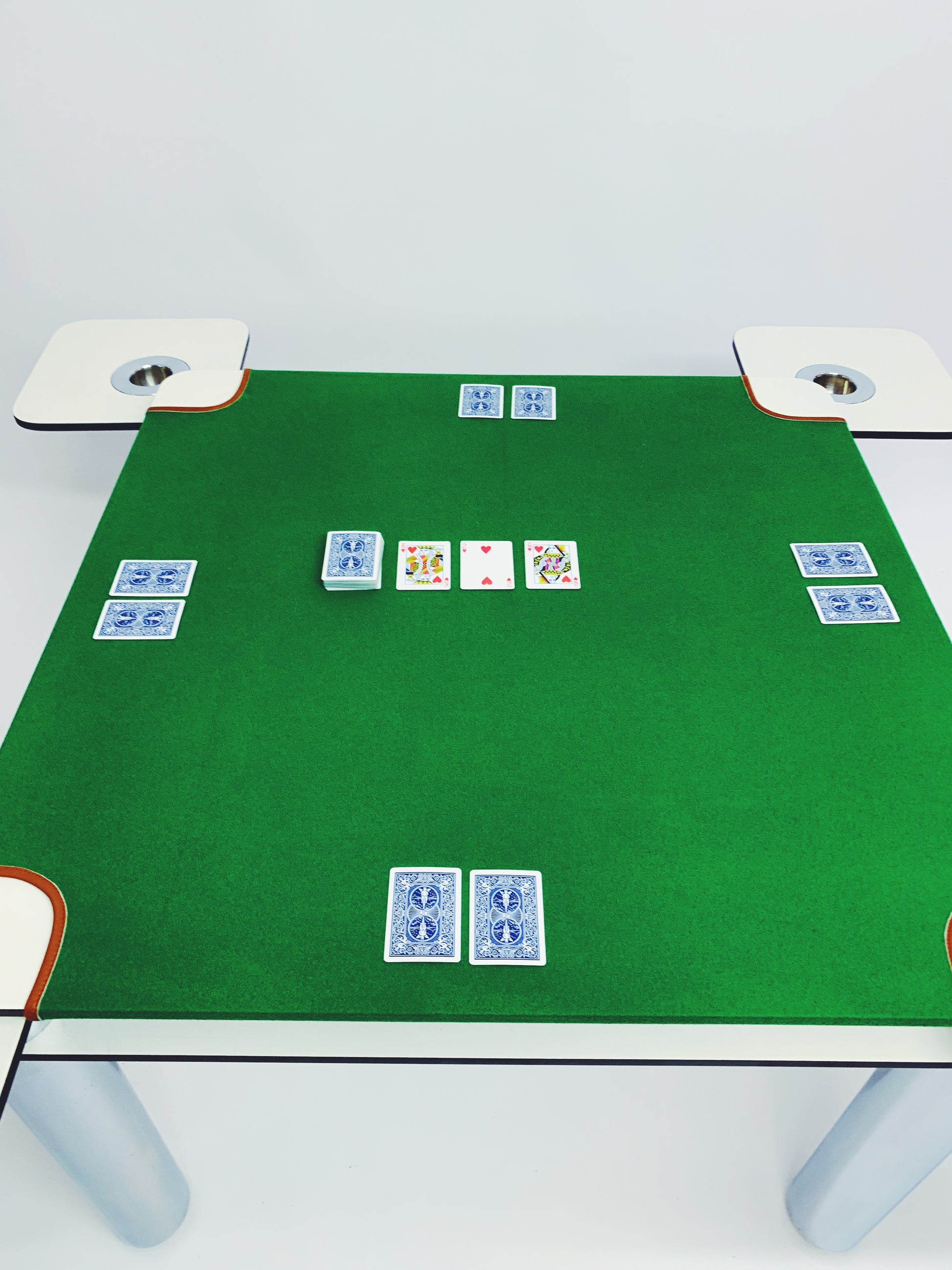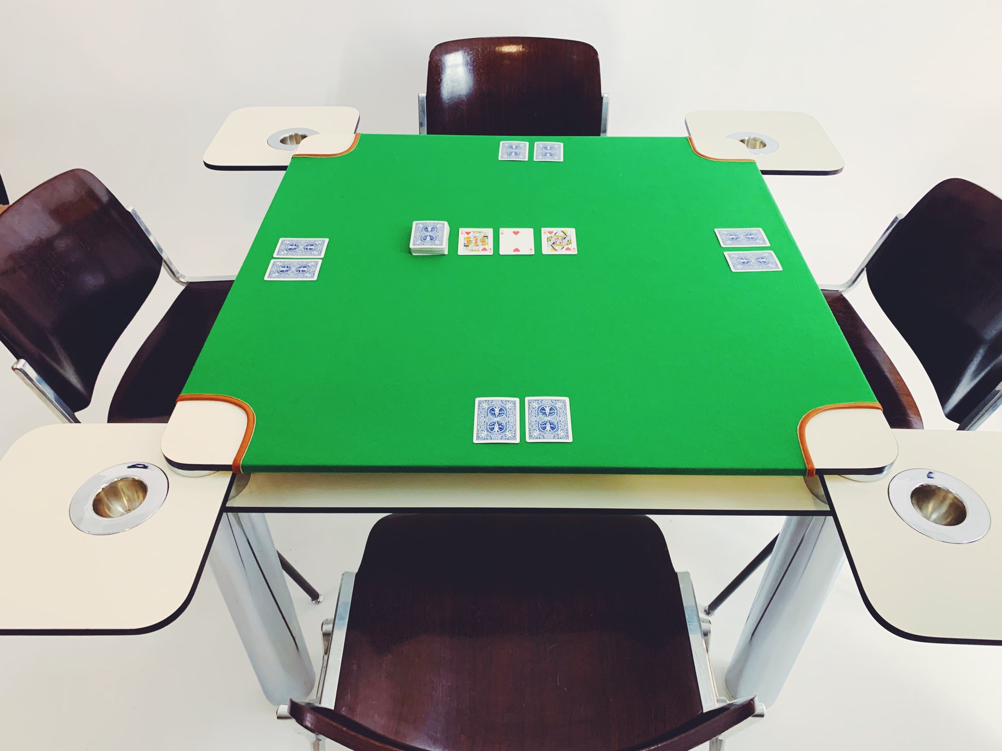 Der Pokertisch von Joe Colombo ist ein zeitloses Meisterwerk des italienischen Designs (erster Entwurf 1966). Der Spieltisch besteht aus zwei Tischplatten aus hochwertigem Kunststofflaminat. Die obere Tischplatte kann mit einem grünen Filztuch mit braunem Lederrand bezogen werden.