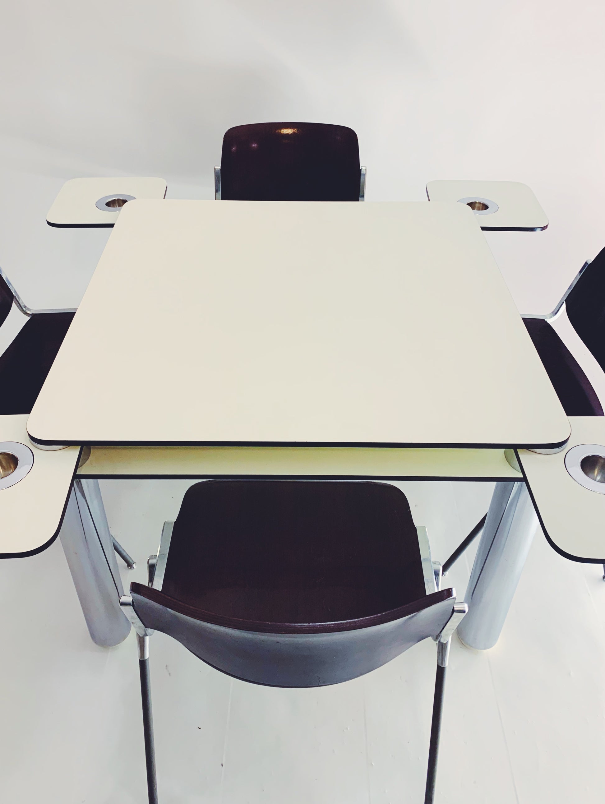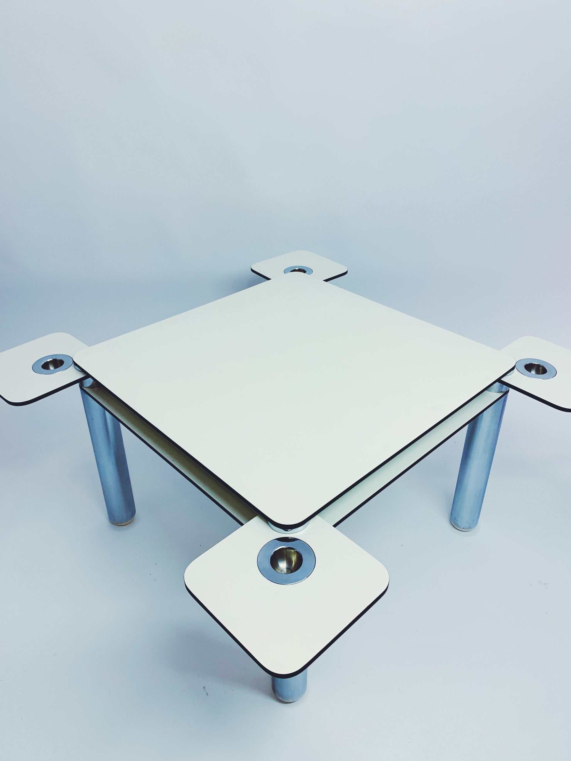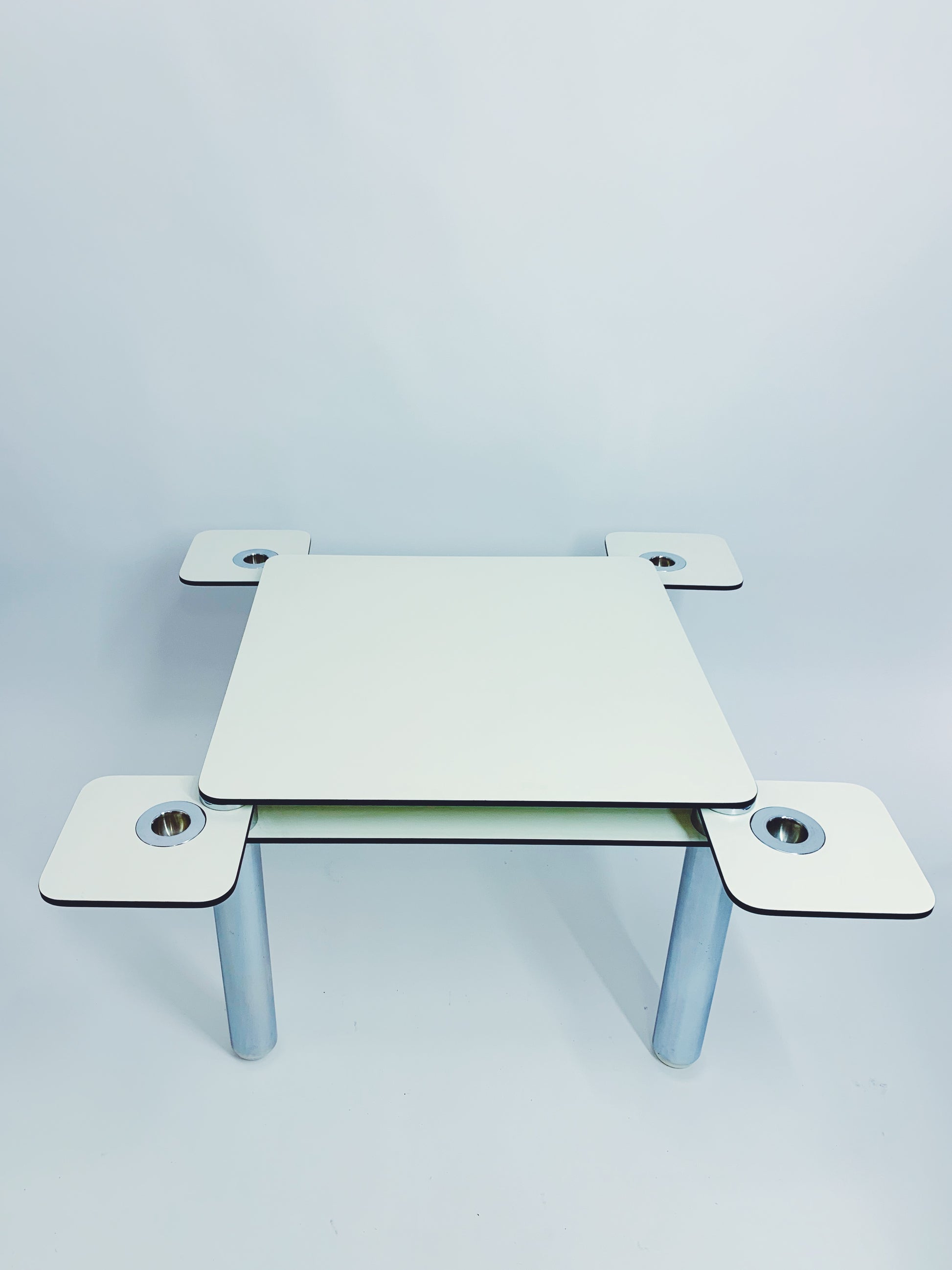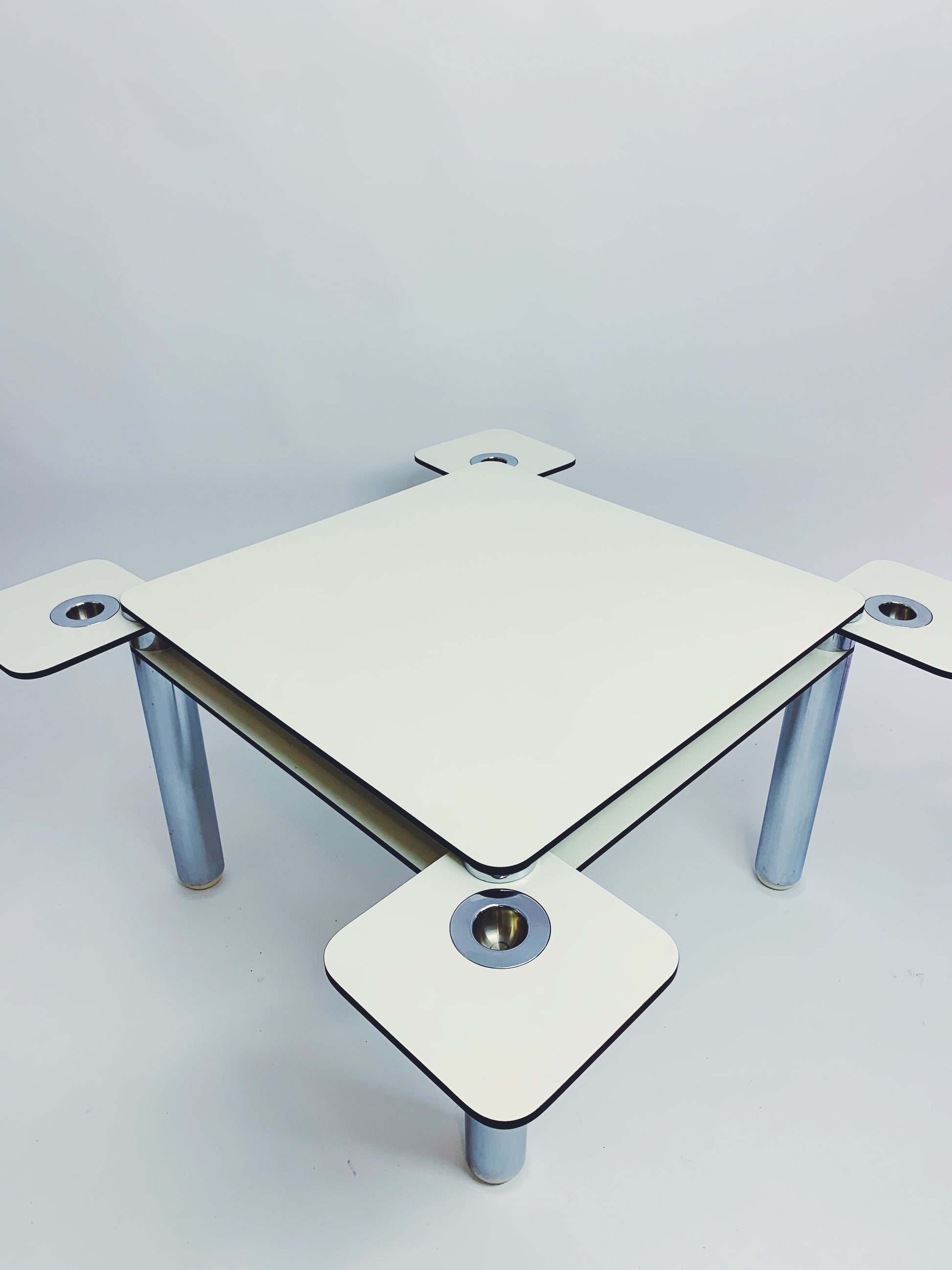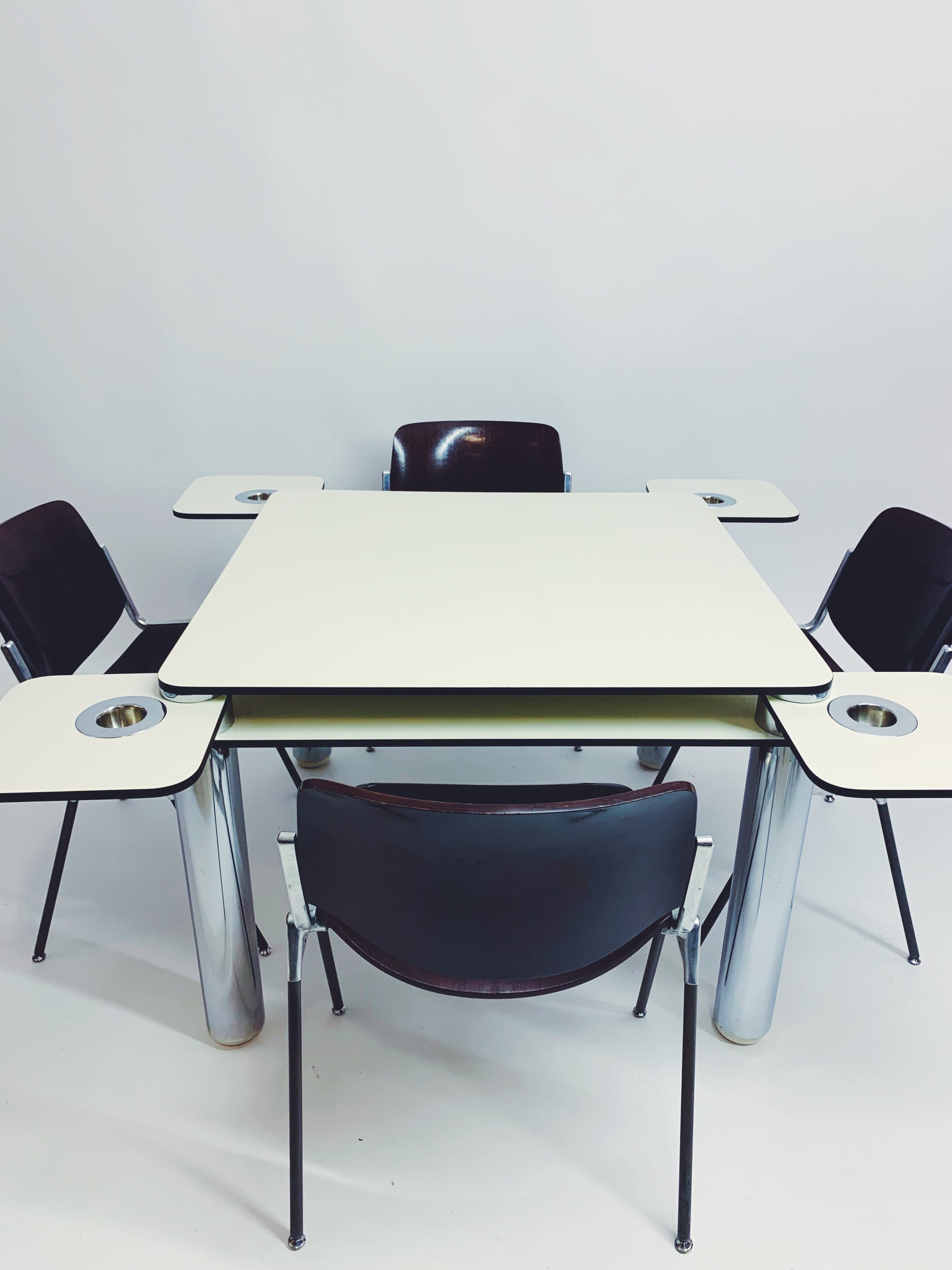 Der Pokertisch von Joe Colombo ist ein zeitloses Meisterwerk des italienischen Designs (erster Entwurf 1966). Der Spieltisch besteht aus zwei Tischplatten aus hochwertigem Kunststofflaminat. Die obere Tischplatte kann mit einem grünen Filztuch mit braunem Lederrand bezogen werden.
