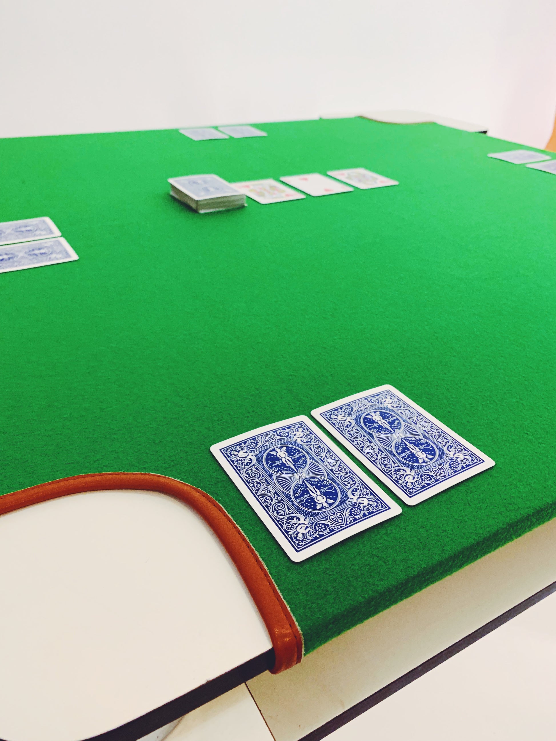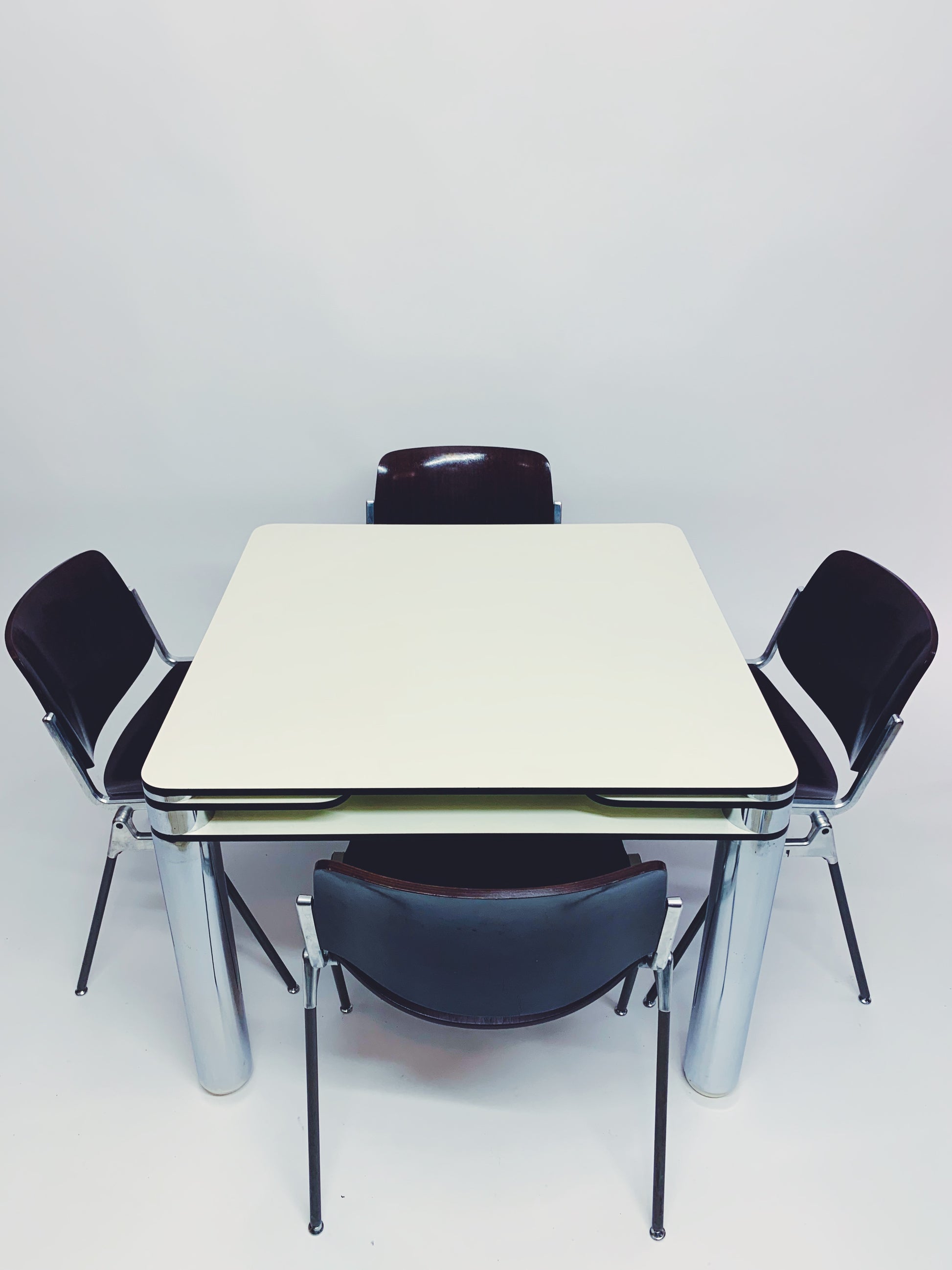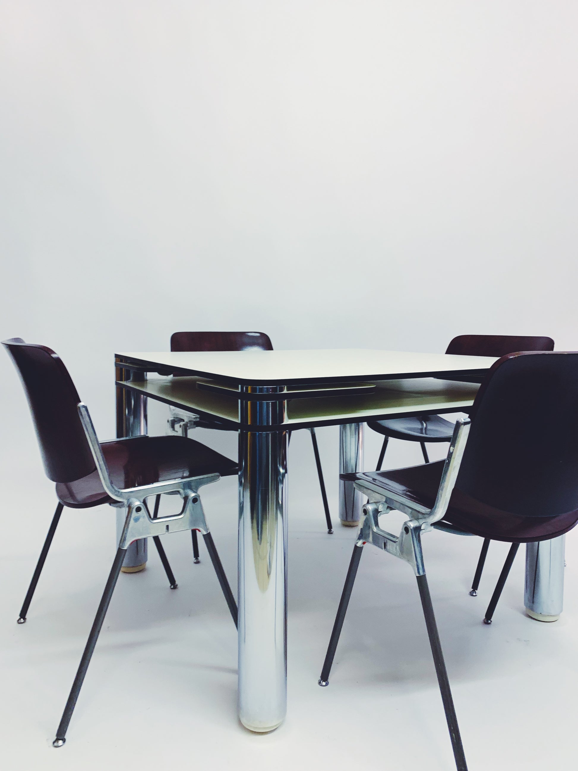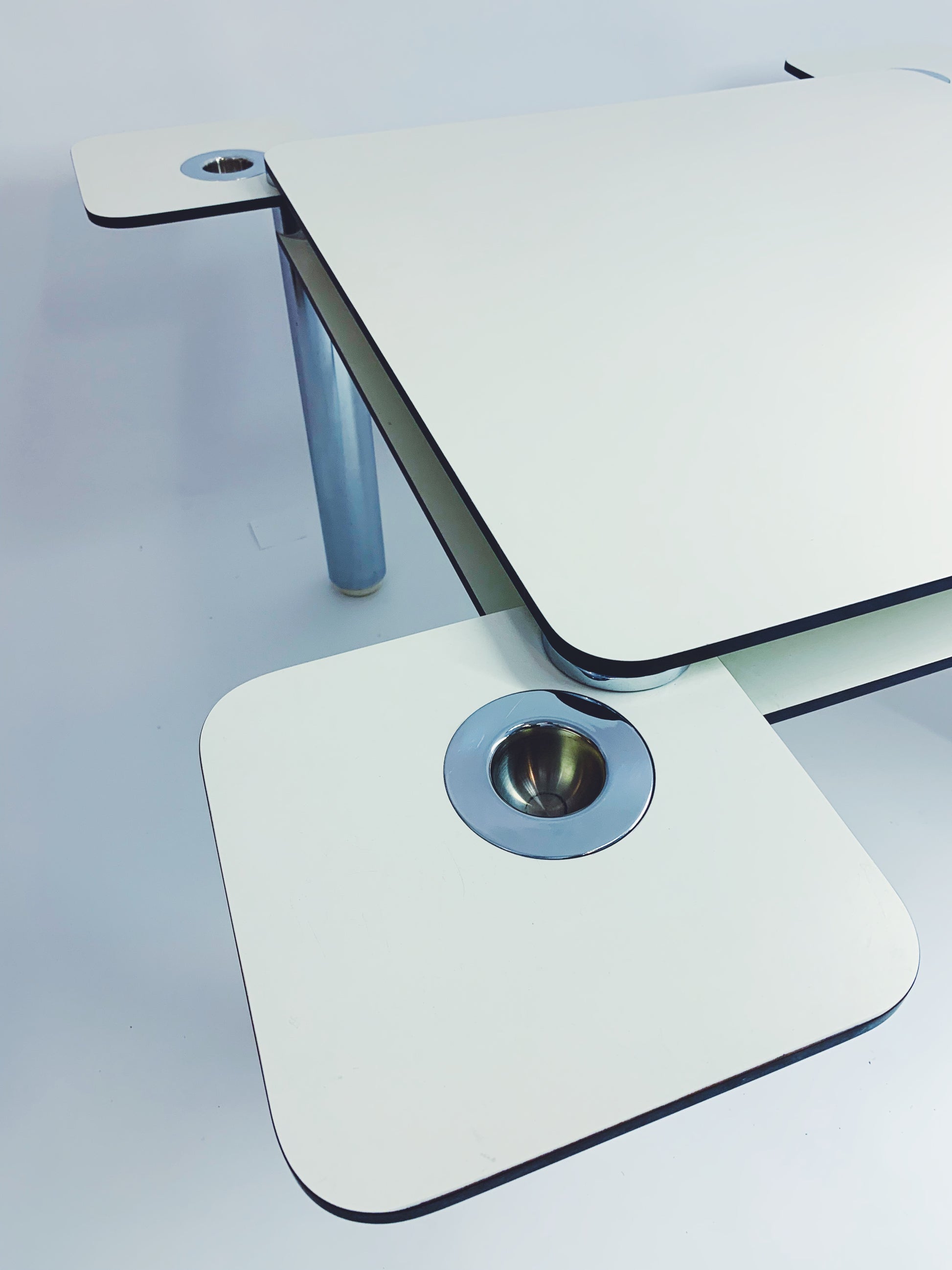 Der Pokertisch von Joe Colombo ist ein zeitloses Meisterwerk des italienischen Designs (erster Entwurf 1966). Der Spieltisch besteht aus zwei Tischplatten aus hochwertigem Kunststofflaminat. Die obere Tischplatte kann mit einem grünen Filztuch mit braunem Lederrand bezogen werden.