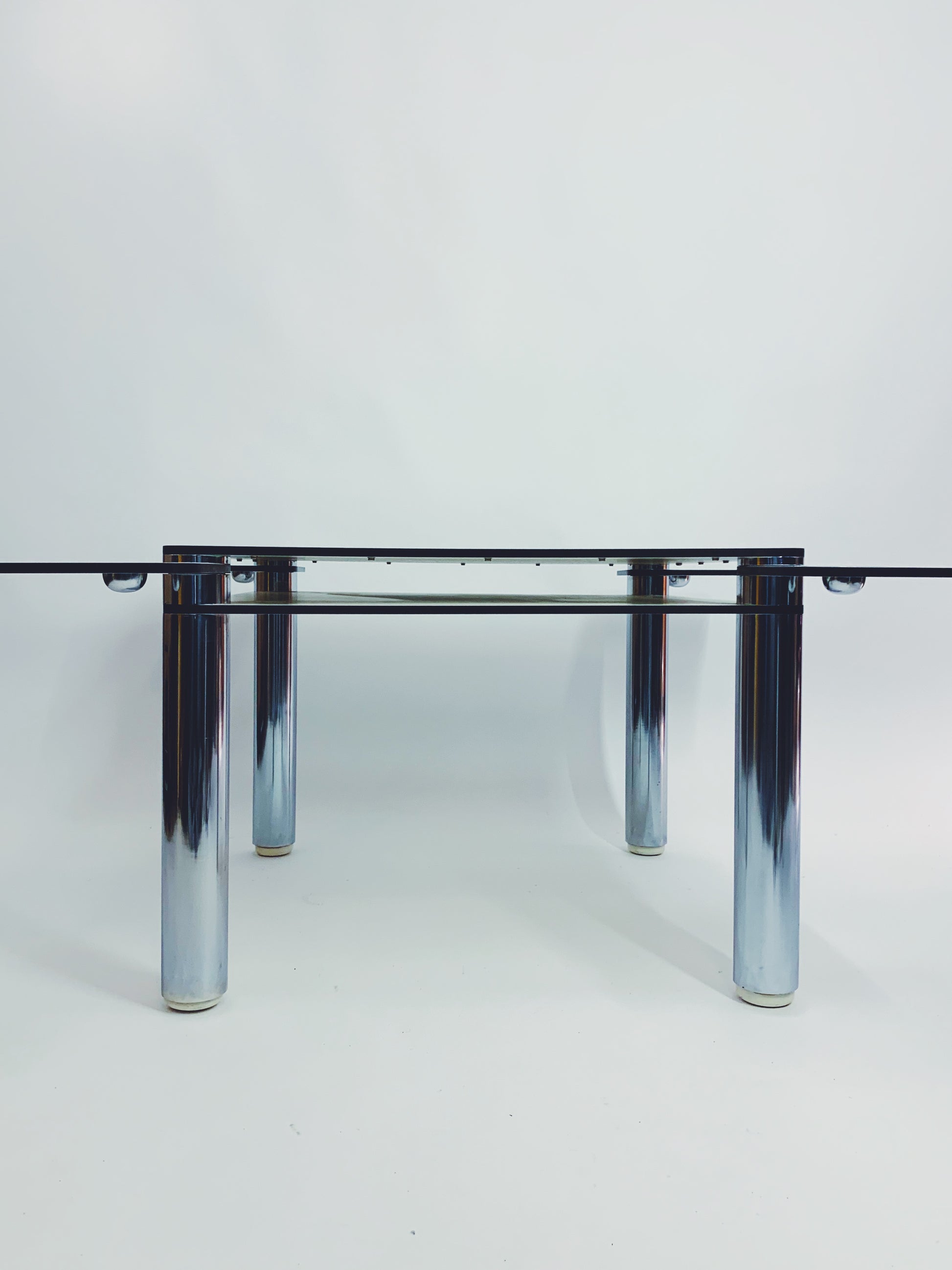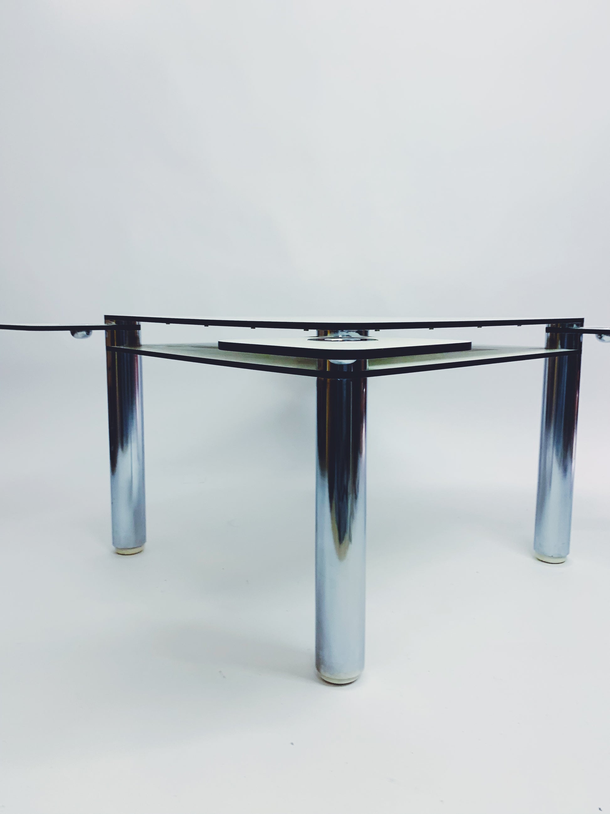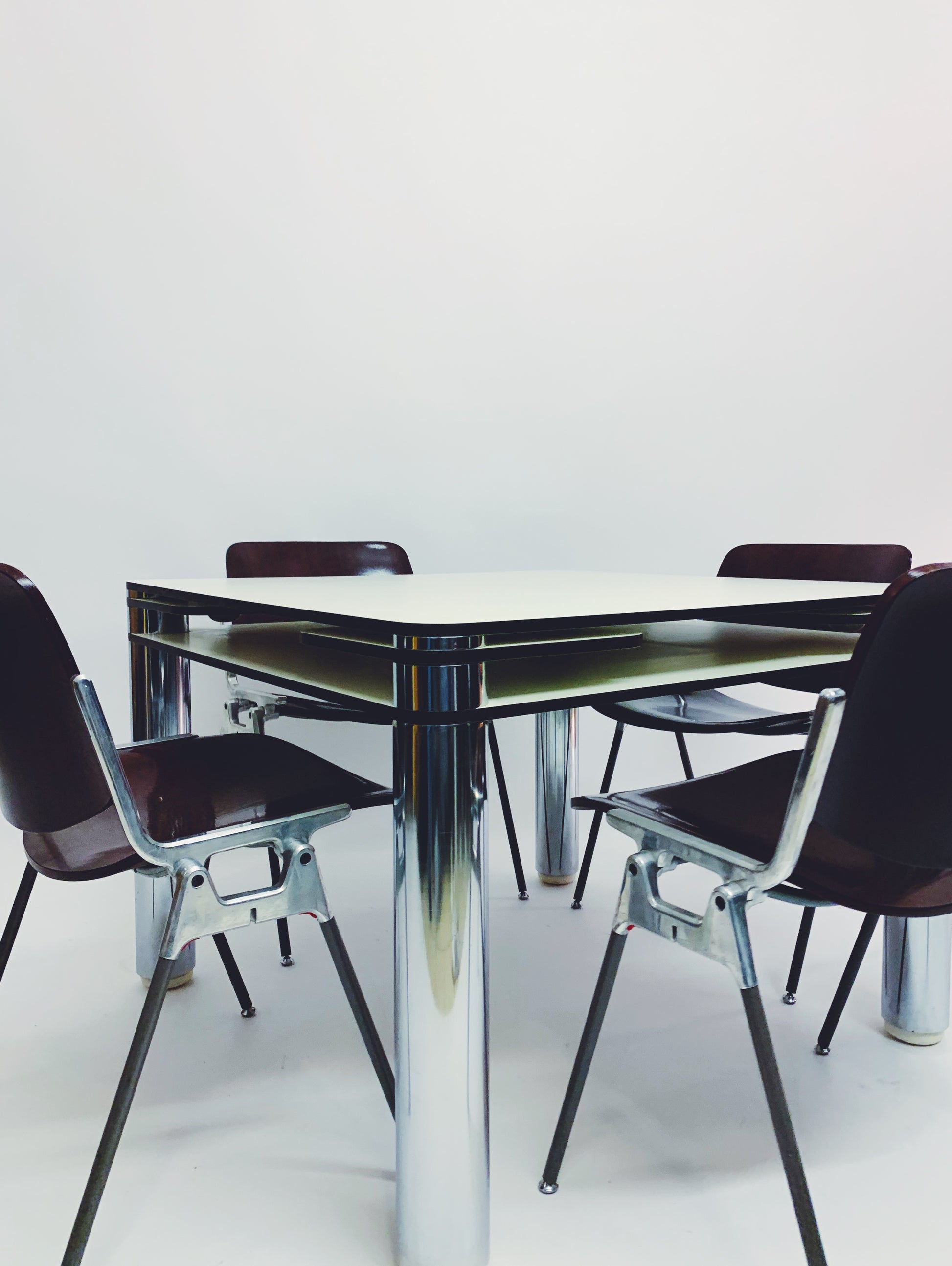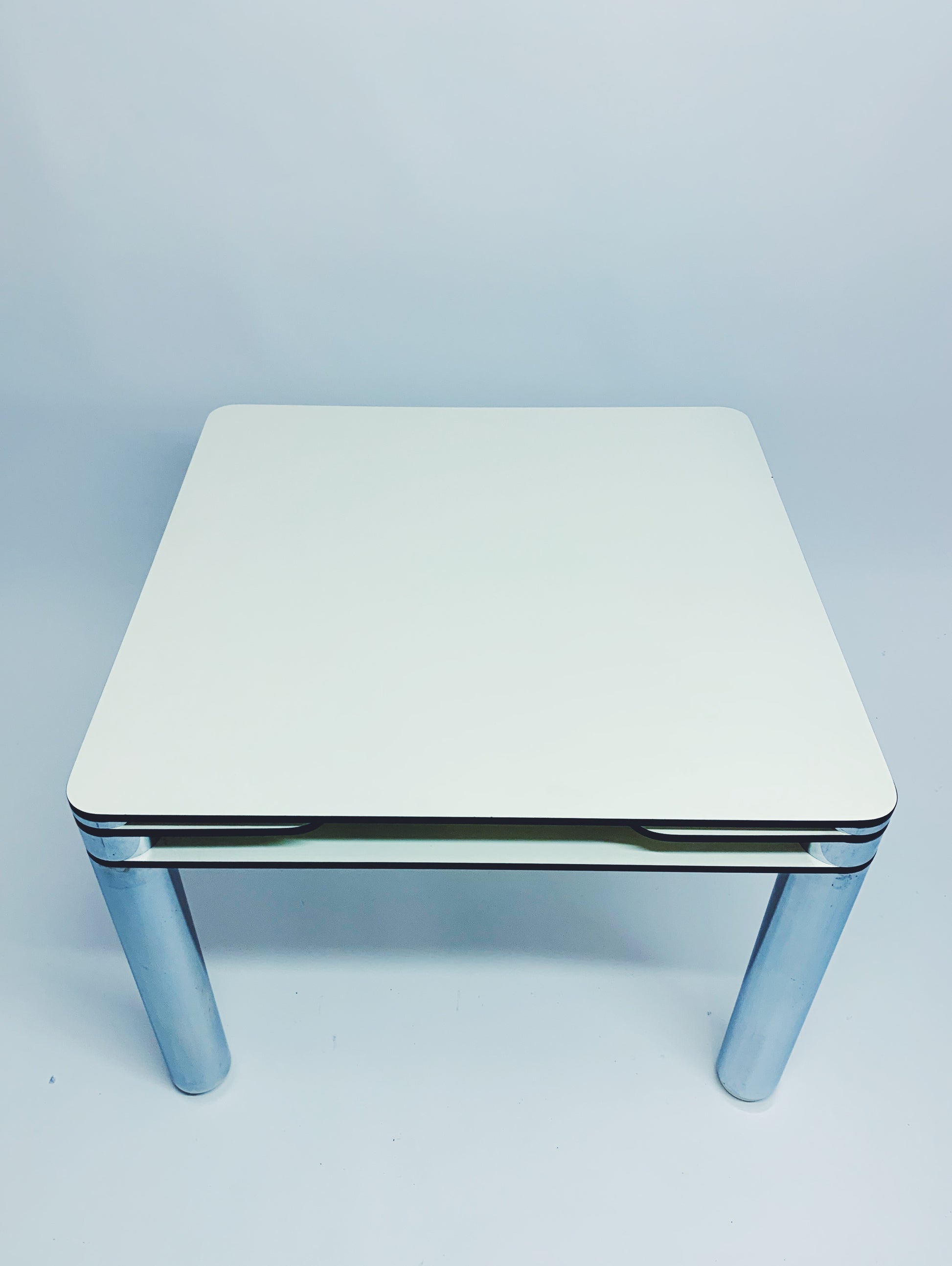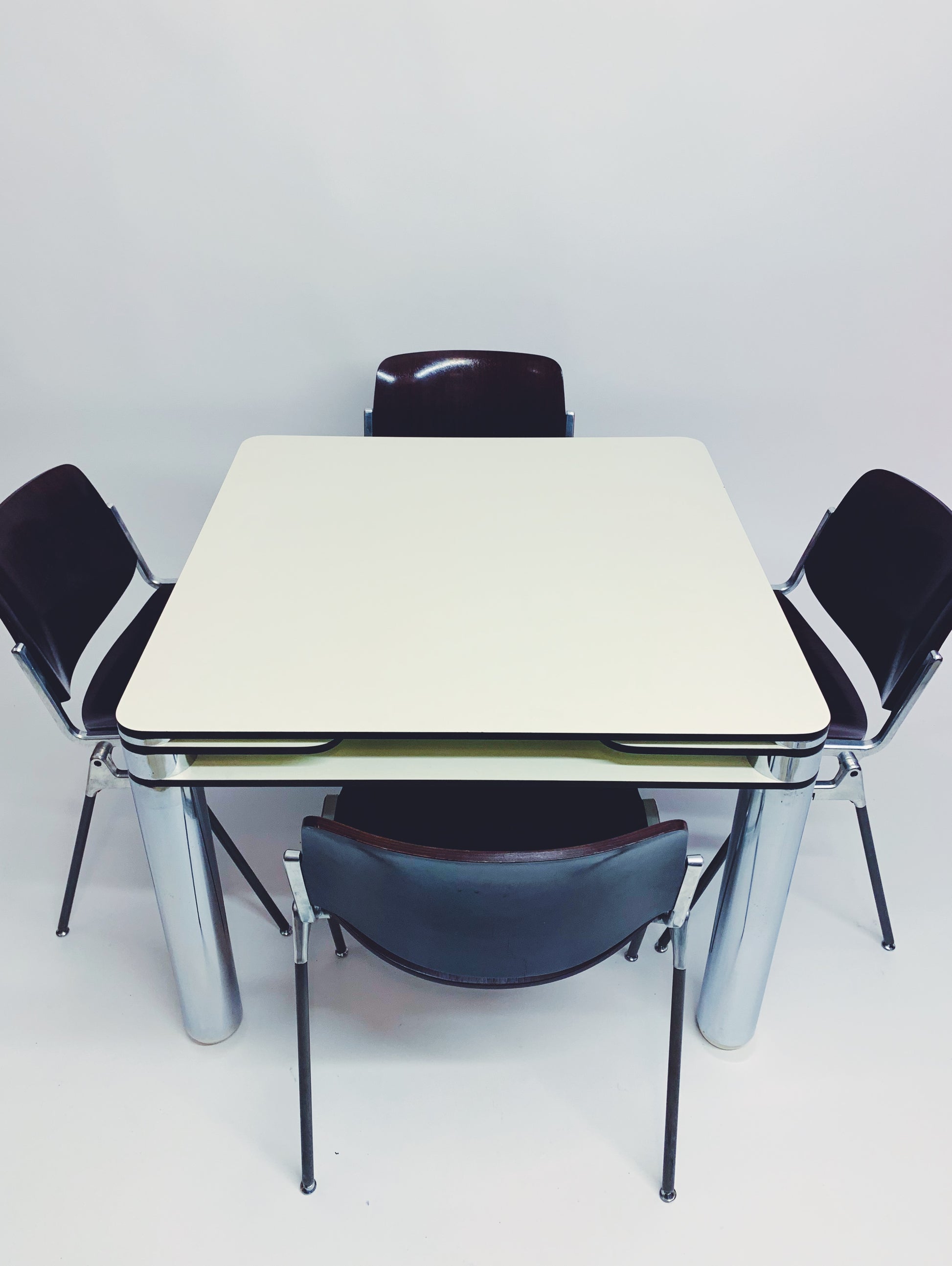 Der Pokertisch von Joe Colombo ist ein zeitloses Meisterwerk des italienischen Designs (erster Entwurf 1966). Der Spieltisch besteht aus zwei Tischplatten aus hochwertigem Kunststofflaminat. Die obere Tischplatte kann mit einem grünen Filztuch mit braunem Lederrand bezogen werden.