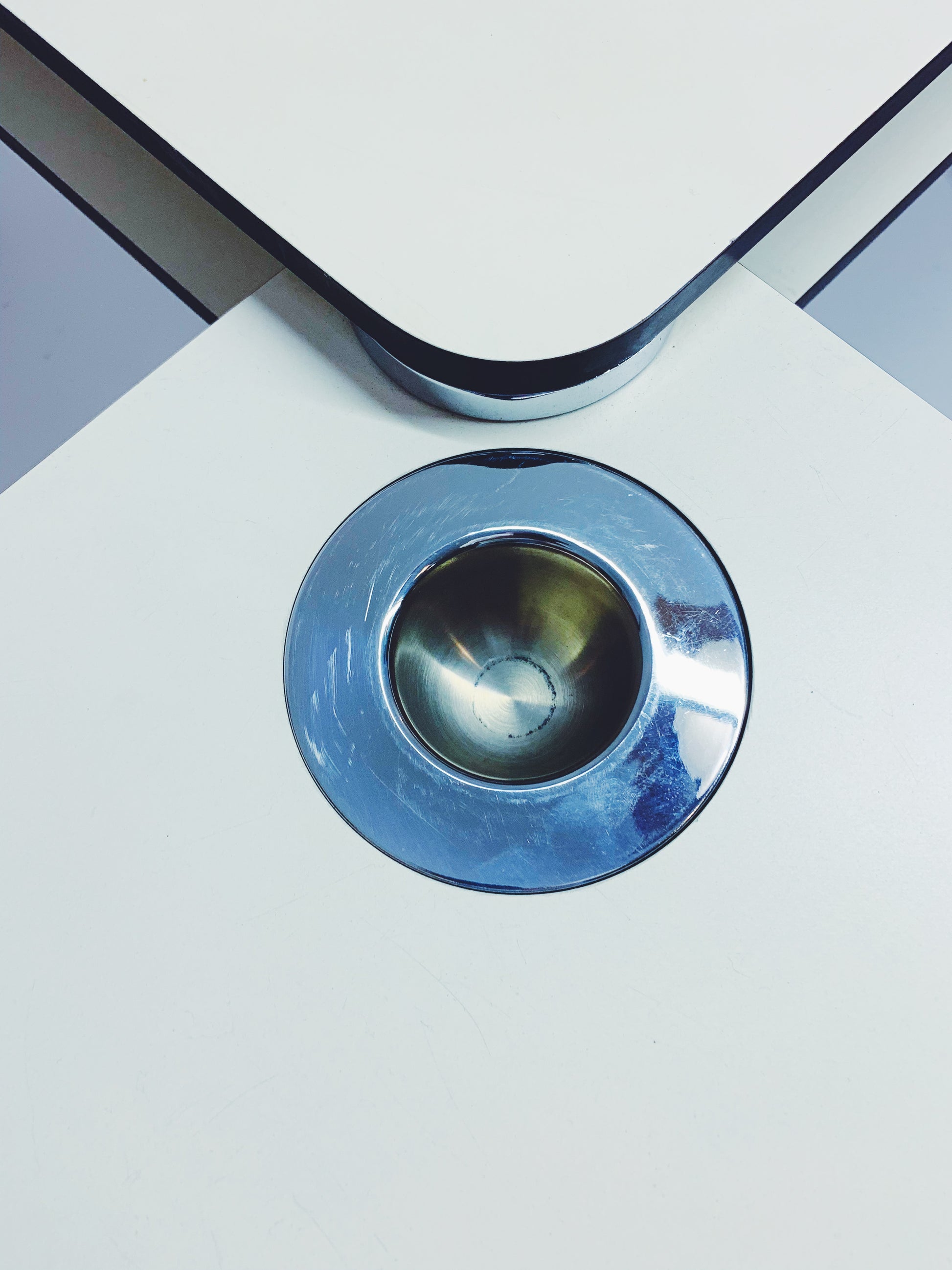 Die ausschwenkbaren Zwischenablagen, die nicht nur zusätzliche Nutzfläche bieten, sondern auch über integrierte verchromte Aschenbecher verfügen, sind einwandfrei erhalten und voll funktionsfähig.